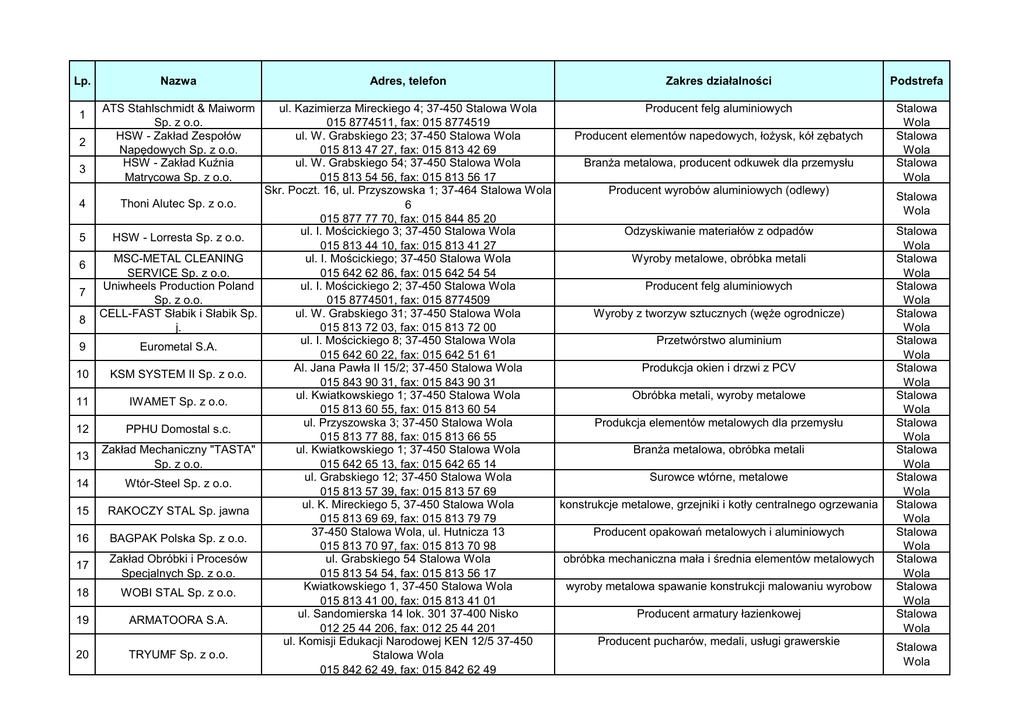 Lp. Nazwa Adres, telefon Zakres działalności Podstrefa 1 ATS
