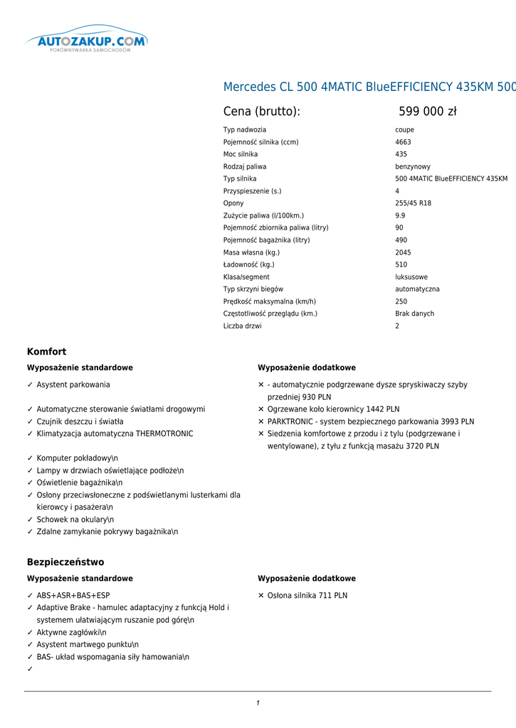 Mercedes CL 500 4MATIC BlueEFFICIENCY 435KM 500 Cena (brutto): 599 000 zł Typ nadwozia coupe Pojemność silnika (ccm) 4663 Moc silnika 435 Rodzaj paliwa benzynowy Typ silnika 500 4MATIC BlueEFFICIENCY 435KM Przyspieszenie (s.) 4 Opony 255/45 R18 Zużycie paliwa (l/100km.) 9.9 Pojemność zbiornika paliwa (litry) 90 Pojemność bagażnika (litry) 490 Masa własna (kg.) 2045 Ładowność (kg.) 510 Klasa/segment luksusowe Typ skrzyni biegów automatyczna Prędkość maksymalna (km/h) 250 Częstotliwość przeglądu (km.) Brak danych Liczba drzwi 2 Komfort Wyposażenie standardowe Wyposażenie dodatkowe ✓ Asystent parkowania ✕ - automatycznie podgrzewane dysze spryskiwaczy szyby przedniej 930 PLN ✓ Automatyczne sterowanie światłami drogowymi ✕ Ogrzewane koło kierownicy 1442 PLN ✓ Czujnik deszczu i światła ✕ PARKTRONIC - system bezpiecznego parkowania 3993 PLN ✓ Klimatyzacja automatyczna THERMOTRONIC ✕ Siedzenia komfortowe z przodu i z tylu (podgrzewane i wentylowane), z tyłu z funkcją masażu 3720 PLN ✓ Komputer pokładowy\n ✓ Lampy w drzwiach oświetlające podłoże\n ✓ Oświetlenie bagażnika\n ✓ Osłony przeciwsłoneczne z podświetlanymi lusterkami dla kierowcy i pasażera\n ✓ Schowek na okulary\n ✓ Zdalne zamykanie pokrywy bagażnika\n Bezpieczeństwo Wyposażenie standardowe Wyposażenie dodatkowe ✓ ABS+ASR+BAS+ESP ✕ Osłona silnika 711 PLN ✓ Adaptive Brake - hamulec adaptacyjny z funkcją Hold i systemem ułatwiającym ruszanie pod górę\n ✓ Aktywne zagłówki\n ✓ Asystent martwego punktu\n ✓ BAS- układ wspomagania siły hamowania\n ✓ 1 Reflektory przeciwmgielne\n 2 ✓ Światła do jazdy dziennej\n ✓ Sygnalizacja spadku ciśnienia w oponach\n ✓ System mocowań ISOFIX na tylnych siedzeniach\n Dodatki Wyposażenie standardowe Wyposażenie dodatkowe ✓ 3-punktowe pasy bezpieczeństwa przy wszystkich ✕ COMAND APS z nawigacją na płycie DVD 11214 PLN siedzeniach z komfortową automatyką, z regulacją wysokości i napinaczami z przodu ✓ Adaptacyjne światło hamowania ✕ Designo Selection 84792 PLN ✓ Aktywne reflektory bi-ksenonowe z funkcją oświetlania ✕ Dodatkowe zabezpieczenie pokrywy bagażnika 711 PLN kierunku skrętu ✓ Aktywny asystent utrzymania pasa ruchu ✕ Elektrycznie sterowana roleta szyby tylnej 2407 PLN ✓ Alarm antywłamaniowy ✕ Elementy wykończenia wnętrza AMG Carbon/ czarny lakier ✓ Atermiczne szyby tłumiące dźwięki ✕ Felgi aluminiowe 18 z oponami zimowymi 10941 PLN ✓ COMAND bez systemu nawigacji ✕ Felgi aluminiowe 18" 7-ramienne, 2-szprychowe 3009 fortepianowy 19 PLN PLN ✓ DIRECT SELECT - system zmiany biegów ✕ Felgi aluminiowe 19''- wieloramienne 4923 ✓ Elektrycznie podnośniki szyb (x4) z funkcją zamykania ✕ Felgi PLN aluminiowe 19, 10 ramienne 2735 PLN PRE-SAFE ✓ Elektrycznie regulowane, podgrzewane i składane lusterka z ✕ Felgi aluminiowe 20", 5 ramienne 9573 PLN pamięcią ustawienia ✓ Felgi aluminiowe 18", 5 szprychowe ✕ Felgi aluminiowe 20", wieloramienne 10016 PLN ✓ Felgi aluminiowe 20", wieloramienne ✕ Felgi aluminiowe AMG 20", z podwójnymi ramionami 4103 PLN ✓ Fotel pasażera z możliwością regulacji z miejsca kierowcy ✕ INCar Hotspot 3993 PLN ✓ Fotele przednie z podpórkami odcinka lędźwiowego, ✕ Kamera cofania 2188 PLN elektryczną regulacją oraz funkcją pozycjonowania PRE-SAFE ✓ Gwarancja + Assistance ✕ Kamień designo- Labrador blue pearl 47319 PLN ✓ Kierownica w drewnie i skórze ✕ Kamień designo- Star galaxy 47319 PLN ✓ Kierunkowskazy w lusterkach zewnętrznych ✕ Kierownica designo w drewnie i skórze 4923 PLN ✓ Komfortowe wspomaganie zamykania drzwi ✕ Kierownica w drewnie i skórze 3392 PLN ✓ Lakier metaliczny ✕ Kolor nadwozia czarna platyna 11214 PLN ✓ Lampki do czytania z przodu ✕ Kolor nadwozia designo brązowy mystic 15317 PLN ✓ Lusterka zewnętrzne ze zintegrowanym oświetleniem ✕ Kolor nadwozia designo czarny mokka 11214 PLN bocznym ✓ Lusterko wewnętrzne i lewe lusterko zewnętrzne ✕ Kolor nadwozia designo czerwony mokka 15317 PLN samościemniające ✓ Naturalna tapicerka designo ✕ Kolor nadwozia designo grafit 11214 PLN ✓ Obrotomierz ✕ Kolor nadwozia designo magno biel kaszmiru 19420 PLN ✓ Oświetlenie dolnej przestrzeni wnętrza ✕ Kolor nadwozia designo niebieski mauritius 11214 PLN ✓ Pamięć ustawień lusterek, kierownicy oraz przednich foteli ✕ Kolor nadwozia designo niebieski mystic 15317 PLN ✓ Parametryczna przekładnia układu kierowniczego ✕ Kolor nadwozia designo platynowy metalik 19420 PLN ✓ Podsufitka w kolorze szarym ✕ Kolor nadwozia magno szarość alanitu 19420 PLN ✓ Podsufitka z alkantry w kolorze beżowym ✕ Kontrola ciśnienia w oponach 1751 PLN ✓ Podsufitka z alkantry w kolorze czarnym ✕ Koło dojazdowe 438 PLN ✓ 3 Podsufitka z alkantry w kolorze szarym ✕ 4 Lodówka w podłokietniku tylnym 5443 PLN 5 ✓ Poduszki powietrzne czołowe, boczne z przodu i z tyłu oraz ✕ Media interface 1094 PLN nadokienne ✓ Podwójny uchwyt na kubek z przodu ✕ Moduł do telefonii bezprzewodowej Bluetooth SAP V3 1915 PLN ✓ Podłokietniki środkowe z przodu i z tyłu składane, przedni ze ✕ Nightview Assist Plus - system jazdy nocnej 8917 PLN schowkiem ✓ Progi ze stali szlachetnej z napisem Mercedes-Benz ✕ Ochrona powłoki lakierniczej 274 PLN ✓ Siatka na bagaż pod siedzeniem pasażera ✕ Ogrzewanie postojowe sterowane pilotem 8534 PLN ✓ Siatka na bagaż w bagażniku ✕ Opony M+S zamiast opon letnich 1149 PLN ✓ Spryskiwacze reflektorów ✕ Oświetlenie AMBIENTE 1751 PLN ✓ System aktywnego serwisowania ASSYST ✕ Podświetlane listwy boczne 4-fach 3665 PLN ✓ System COMMAND z nawigacją satelitarną, radiem, ✕ Popielniczka zamiast schowków dla 1 i 2 rzędu siedzeń 246 8-calowym mionitorem i napędem DVD ✓ System Easy Entry PLN ✕ Przygotowanie do montażu telefonu komórkowego 2133 PLN ✓ Szklany dach przesuwano-uchylny, ster