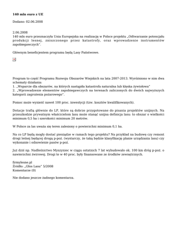 140 mln euro z UE Dodano: 02.06.2008 2.06.2008 140 mln euro przeznaczyła Unia Europejska na realizację w Polsce projektu „Odtwarzanie potencjału produkcji lesnej, zniszczonego przez katastrofy, oraz wprowadzenie instrumentów zapobiegawczych”. Głównym beneficjentem programu będą Lasy Państwowe. Program to część Programu Rozwoju Obszarów Wiejskich na lata 2007-2013. Wyróżniono w nim dwa schematy działania: 1. „Wsparcie dla obszarów, na których nastąpiła katastrofa naturalna lub klęska żywiołowa” 2. „Wprowadzenie elementów zapobiegawczych na terenach zaliczonych do dwóch najwyższych kategorii zagrożenia pożarowego”. Pomoc może wynieść nawet 100 proc. inwestycji (tzw. kosztów kwalifikowanych). Dotacje trafią głównie do LP, które są dobrze przygotowane do pisania projektów unijnych. Na przeszkodzie prywatnym właścicielom lasu może stanąć unijna definicja lasu: to obszar o wielkości minimum 0,5 ha i szerokości minimum 20 metrów. W Polsce za las uważa się teren zalesiony o powierzchni minimum 0,1 ha. Na co LP będą mogły dostać pieniądze w ramach tego projektu? Na przykład na budowę czy remont drogi leśnej będącej drogą p-poż. (wystarczy, że taką będzie klasyfikację planie urządzania lasu) czy wykonanie i odnowienie pasów p-poż. Już dziś np. Nadleśnictwo Myszyniec w ciągu ostatnich 7 lat wybudowało ok. 100 km dróg p-poż. o nawierzchni żwirowej. Drogi te w 40 proc. były finansowane ze środków zewnętrznych. firmylesne.pl Źródło: „Głos Lasu” 5/2008 Komentarze (0) Nie dodano jeszcze żadnego komentarza.