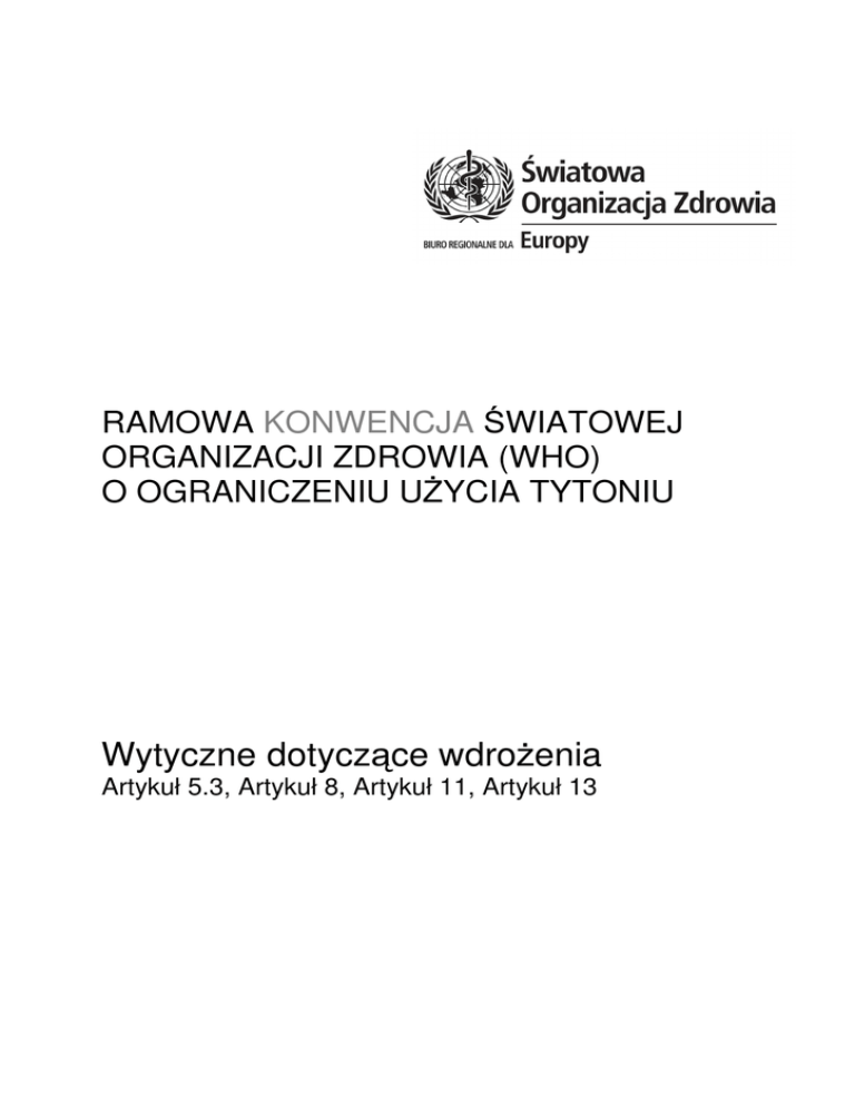 RAMOWA KONWENCJA ŚWIATOWEJ ORGANIZACJI ZDROWIA (WHO) O OGRANICZENIU UŻYCIA TYTONIU Wytyczne dotyczące wdrożenia Artykuł 5.3, Artykuł 8, Artykuł 11, Artykuł 13 2 Oryginalnie opublikowane w języku angielskim przez Światową Organizację Zdrowia w 2009 r. pod tytułem: „ Framework Convention on Tobacco Control”. Słowa kluczowe 1. Tobacco - supply and distribution 2. Tobacco industry - legislation 3. Tobacco smoke pollution - prevention and control 4. Tobacco use cessation 5. Treaties W celu uzyskania publikacji Biura Regionalnego WHO dla Europy prosimy o kontakt: Publications WHO Regional Office for Europe Scherfigsvej 8 DK-2100 Copenhagen Ø, Denmark lub o wypełnienie formularza online na stronie internetowej Biura Regionalnego, gdzie dostępne są dokumenty i informacje na temat opieki zdrowotnej oraz gdzie można uzyskać zgodę na cytowanie i tłumaczenie dokumentów (http://www.euro.who.int/pubrequest). © Światowa Organizacja Zdrowia 2011 Wszystkie prawa zastrzeżone. Biuro Regionalne Światowej Organizacji Zdrowia przyjmuje prośby o zgodę na kopiowanie lub tłumaczenie publikacji WHO w całości lub w części. Użyte terminy oraz prezentacja materiału w niniejszej publikacji nie wyrażają żadnej opinii Światowej Organizacji Zdrowia na temat stanu prawnego danego kraju, jego terytorium, miasta lub obszaru czy władz, ani na temat zniesienia jego granic. Wykropkowane linie na załączonych mapkach prezentują przybliżone linie graniczne, które mogą nie być jeszcze w pełni uzgodnione. Nawiązanie do konkretnych firm lub określonych produktów nie jest równoznaczne z tym, że Światowa Organizacja Zdrowia wspiera lub rekomenduje je oraz przedkłada nad inne podobne firmy czy produkty, o których brak wzmianki w niniejszym dokumencie. O ile tekst nie zawiera błędów czy pomyłek, nazwy własne produktów zostały wyróżnione wielką literą. Światowa Organizacja Zdrowia powzięła wszelkie zasadne środki ostrożności w celu weryfikacji informacji zawartych w niniejszej publikacji. Jednakże niniejszy materiał podlega dystrybucji bez żadnej gwarancji, tak wyraźnej jak i dorozumianej. Odpowiedzialność za interpretację i wykorzystanie materiału spoczywa na odbiorcy. W żadnym wypadku Światowa Organizacja Zdrowia nie będzie odpowiadać za szkody wynikające z jego wykorzystania. Opinie wyrażone przez autorów, redaktorów i grupy ekspertów nie zawsze reprezentują decyzje zgodne z ustaloną polityką Światowej Organizacji Zdrowia. 2 SPIS TREŚCI WYTYCZNE DOTYCZĄCE WDROŻENIA ARTYKUŁU 5.3 RAMOWEJ KONWENCJI WHO O OGRANICZENIU UŻYCIA TYTONIU OCHRONA STRATEGII ZDROWIA PUBLICZNEGO DOTYCZĄCYCH KONTROLI RYNKU WYROBÓW TYTONIOWYCH PRZED WPŁYWEM HANDLOWYCH I INNYCH GRUP INTERESÓW FIRM Z BRANŻY TYTONIOWEJ ....................................................................................................................................................... 9 WYTYCZNE DOTYCZĄCE WDROŻENIA ARTYKUŁU 8 RAMOWEJ KONWENCJI WHO O OGRANICZENIU UŻYCIA TYTONIU OCHRONA PRZED NARAŻENIEM NA DYM TYTONIOWY........................................................................ 25 WYTYCZNE DOTYCZĄCE WDROŻENIA ARTYKUŁU 11 RAMOWEJ KONWENCJI WHO O OGRANICZENIU UŻYCIA TYTONIU OPAKOWANIE I OZNAKOWANIE WYROBÓW TYTONIOWYCH ............................................................. 39 WYTYCZNE DOTYCZĄCE WDROŻENIA ARTYKUŁU 13 RAMOWEJ KONWENCJI WHO O OGRANICZENIU UŻYCIA TYTONIU REKLAMA I PROMOCJA WYROBÓW TYTONIOWYCH ORAZ FORMY SPONSOROWANIA PRZEZ BRANŻĘ TYTONIOWĄ ..................................................................................................................................... 57 3 4 4 WSTĘP Niniejsza publikacja zawiera pierwszy zestaw wytycznych przyjęty przez Konferencję Stron podczas jej drugiej (2007) i trzeciej (2008) sesji. Niniejsze cztery grupy wytycznych obejmują szeroki zakres postanowień Ramowej Konwencji WHO o Ograniczeniu Użycia Tytoniu, takich jak: ochrona strategii zdrowia publicznego dotyczących kontroli rynku wyrobów tytoniowych przed wpływem handlowych i innych grup interesów firm z branży tytoniowej (Artykuł 5.3), ochrona przed narażeniem na dym tytoniowy (Artykuł 8), opakowanie i oznakowanie wyrobów tytoniowych (Artykuł 11) oraz reklama i promocja wyrobów tytoniowych oraz sponsorowanie przez branżę tytoniową (Artykuł 13). Niniejsza publikacja została opracowana przez Sekretariat Konwencji w celu propagowania idei wdrożenia Konwencji Ramowej. Wytyczne mają na celu pomóc Stronom zrealizować ich zobowiązania na mocy odpowiednich postanowień Konwencji. Są one odzwierciedleniem wspólnych poglądów Stron na różne aspekty wdrożenia postanowień Konwencji, ich doświadczeń i osiągnięć, jak również wyzwań, jakim musiały sprostać. Ponadto wytyczne te mają na celu przedstawienie i propagowanie najlepszych praktyk i standardów, które w procesie wdrażania traktatu przyniosłyby korzyści poszczególnym państwom. Wytyczne dotyczące pozostałych artykułów Konwencji są obecnie przygotowywane przez międzyrządowe grupy robocze i zostaną przedstawione do rozpatrzenia Konferencji Stron podczas jej przyszłych sesji. Niniejsze wytyczne zostały opracowane dzięki pracy przedstawicieli Stron w międzyrządowych grupach roboczych ustanowionych przez Konferencję Stron przy uwzględnieniu dodatkowych uwag zgłoszonych przez Strony na etapie opiniowania i dyskusji podczas Konferencji Stron, jak również uwag ze strony organizacji międzyrządowych i pozarządowych występujących na Konferencji jako obserwatorzy oraz zaproszonych ekspertów. Dzięki temu rozbudowanemu procesowi opiniodawczemu oraz porozumieniu osiągniętemu przez Strony niniejsze wytyczne zostały powszechnie uznane jako cenne narzędzie w procesie wdrażania Konwencji Ramowej. dr Haik Nikogosian Kierownik Sekretariatu Konwencji 5 6 6 Wytyczne dotyczące wdrożenia Artykuł 5.3 ■■■■■■■■■■ ■■■■
