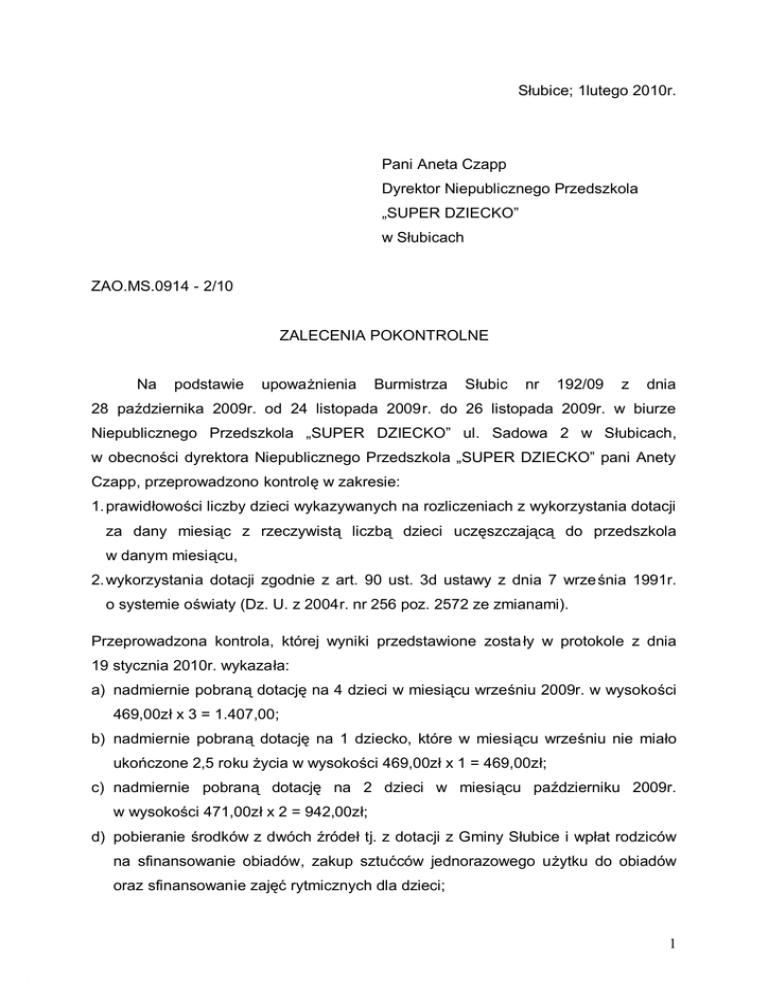 Słubice; 1lutego 2010r. Pani Aneta Czapp Dyrektor Niepublicznego Przedszkola „SUPER DZIECKO” w Słubicach ZAO.MS.0914 - 2/10 ZALECENIA POKONTROLNE Na podstawie upoważnienia Burmistrza Słubic nr 192/09 z dnia 28 października 2009r. od 24 listopada 2009r. do 26 listopada 2009r. w biurze Niepublicznego Przedszkola „SUPER DZIECKO” ul. Sadowa 2 w Słubicach, w obecności dyrektora Niepublicznego Przedszkola „SUPER DZIECKO” pani Anety Czapp, przeprowadzono kontrolę w zakresie: 1. prawidłowości liczby dzieci wykazywanych na rozliczeniach z wykorzystania dotacji za dany miesiąc z rzeczywistą liczbą dzieci uczęszczającą do przedszkola w danym miesiącu, 2. wykorzystania dotacji zgodnie z art. 90 ust. 3d ustawy z dnia 7 wrze śnia 1991r. o systemie oświaty (Dz. U. z 2004r. nr 256 poz. 2572 ze zmianami). Przeprowadzona kontrola, której wyniki przedstawione zosta ły w protokole z dnia 19 stycznia 2010r. wykazała: a) nadmiernie pobraną dotację na 4 dzieci w miesiącu wrześniu 2009r. w wysokości 469,00zł x 3 = 1.407,00; b) nadmiernie pobraną dotację na 1 dziecko, które w miesiącu wrześniu nie miało ukończone 2,5 roku życia w wysokości 469,00zł x 1 = 469,00zł; c) nadmiernie pobraną dotację na 2 dzieci w miesiącu październiku 2009r. w wysokości 471,00zł x 2 = 942,00zł; d) pobieranie środków z dwóch źródeł tj. z dotacji z Gminy Słubice i wpłat rodziców na sfinansowanie obiadów, zakup sztućców jednorazowego użytku do obiadów oraz sfinansowanie zajęć rytmicznych dla dzieci; 1 e) dowody zakupu niewystawione na Niepubliczne Przedszkole „SUPER DZIECKO”, s. 4 p. 2. B, C protokołu; f) dowody zakupów, w których brak jest nabywcy, s. 4 p. 2. E protokołu; g) dowody zakupu, które nie dotyczą bieżącej działalności przedszkola s. 4, p. 2. F i s. 5, p. 2. I protokołu; h) na liście płac Niepublicznego Przedszkola figurowało wynagrodzenie osoby niezatrudnionej w Niepublicznym Przedszkolu. W celu wyeliminowania w przyszłości podobnych nieprawidłowości zalecam: − w odniesieniu do punktów e), f), zgodnie z art. 21 ustawy z dnia 29 września 1994r. o rachunkowości (Dz. U z 2002r. nr 76 poz.694 ze zm.) oraz art. 90 ust. 1 ustawy z dnia 7 września 1991r. o systemie oświaty (Dz.U. z 2004r. nr 256 poz. 2572 ze zm.) dowody księgowe dotyczące wydatków z dotacji udzielonej przez Gminę Słubice powinny być wystawione na Niepubliczne Przedszkole „SUPER DZIECKO”; − w odniesieniu do punktu g) dotacja winna być wydatkowana zgodnie z zapisem art. 90 ust. 3d ustawy o systemie oświaty; − w odniesieniu do punktu h) na listach płac dotyczących Niepublicznego przedszkola winny znajdować się tylko osoby w nim zatrudnione, − w odniesieniu do punktów a), b), c) dotacja podlega zwrotowi na podstawie art. 113 ust. 1 Ustawy z dnia 27 sierpnia 2009r. przepisy wprowadzające ustawę o finansach publicznych (Dz. U. z 2009r. nr 157 poz. 1241) oraz art. 145 ust. 1 i ust. 5 ustawy z dnia 30 czerwca 2005r. o finansach publicznych (Dz. U. z 2005 r. nr 249 poz.2104 ze zmianami) w wysokości 3.287,00zł (słownie: trzy tysiące dwieście osiemdziesiąt siedem) wraz z należnymi odsetkami naliczonymi od dnia podpisania protokołu tj. od 19 stycznia 2010r. − w odniesieniu do punktu d) należy jednoznacznie określić, z którego źródła pokrywane będą wydatki bieżące, o których mowa w tym punkcie i w przypadku finansowania ich z dotacji, zaprzestania pobierania opłat od rodziców i dokonania stosownych zmian w zapisach umów o przyjęciu dziecka do przedszkola. Informuję również, że o zaistniałej sytuacji poinformuję Radę Rodziców działającą przy Niepublicznym Przedszkolu „SUPER DZIECKO” w Słubicach. 2 Jednocześnie informuję, że Pani zastrzeżenia do protokołu kontroli z dnia 25 stycznia 2010r. nie zostały uwzględnione. Zgodnie z uchwałą Rady Miejskiej rozliczenie dotacji za dany miesiąc następuje tylko na podstawie liczby uczniów wskazanej w załączniku nr 3 do Uchwały na dzień 20 danego miesiąca. Zgodnie z art. 90 ust. 2b ustawy o systemie oświaty dotacja przysługuje na każdego ucznia, tj w przypadku przedszkoli wychowanka faktycznie uczęszczającego do placówki, a nie wpisanego do dziennika czy księgi wychowanków. Fakt podpisania z rodzicami dziecka umowy o przyjęciu dziecka przedszkola nie jest jednoznaczny z uczęszczaniem dziecka do przedszkola, a tym samym nie daje podstaw do otrzymania na nie dotacji. Z ustaleń kontroli wynika, że nieobecność dzieci wskazanych w protokole w miesiącu wrześniu i październiku, była skutkiem rezygnacji rodziców z miejsca w przedszkolu, a brak wpłat jest jedynie potwierdzeniem tego faktu. Zapisy w punktach J, K, L protokołu, odnoszące się do finansowania z dotacji obiadów, sztućców jednorazowych i zajęć rytmicznych, nie kwestionują faktu, iż wydatki ponoszone z tego tytułu nie dotyczą bieżącej działalności przedszkola. Wskazują one na fakt, iż są na nie pobierane środki z dwóch źródeł, tj. opłat rodziców i dotacji udzielanej przez Gminę Słubice. Jest to nieprawidłowość, którą należy wyeliminować. Informację o wykonaniu zaleceń pokontrolnych lub przyczynach ich nie wykonania proszę przekazać w terminie 30 dni od dnia otrzymania zaleceń Burmistrzowi Słubic. Zalecenia podpisał Burmistrz Słubic dr inż. Ryszard Bodziacki 3