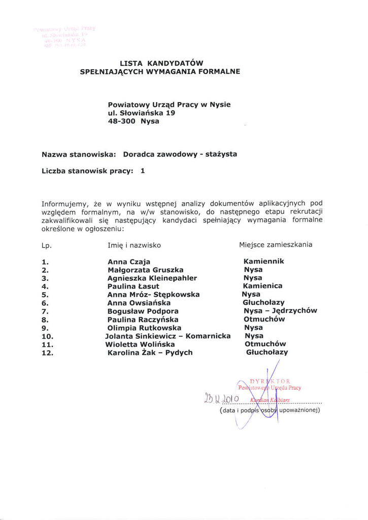 LISTA KANDYDATOW sPEŁNIAJĄcYcH WYMAGANIA FORMALNE Powiatowy Urząd Pracy W Nysie u|. słowiańska 19 48-3OO Nysa Nazwa stanowiska: Doradca zawodowy - stażysta Liczba stanowisk pracy! I Informujemy, że W Wyniku Wstępnej ana|lzy dokumentóW ap|ikacyjnych pod Wzg|ędem formaInym, na W/W stanowisko, do następnego etapu rekrutacji zakwaIifikowaIi się następujący kandydaci spełniający Wyma9ania formaIne okreś|one W ogłoszeniu: N4iejsce zamieszkania Imię i nazwisko Anna Czaja Mał9orzata Gruszka Agnieszka Kleinepahler PauIina Łasut Anna Mróz- stępkowska Anna owsiańska Bogusław Podpora Pau|ina Raczyńska Olimpia Rutkowska Jolanta sinkiewicz - Komarnicka Wio|etta wo|ińska Karo|ina żak - Pydych Kamiennik Nysa Nysa Kamienica Nysa Głuchołazy Nysa - Jędrzychów otmuchów Nysa Nysa otmuchów Głucho|azy DYn I ILII( Jb utrl.e (data i pod UpoWażnionej)