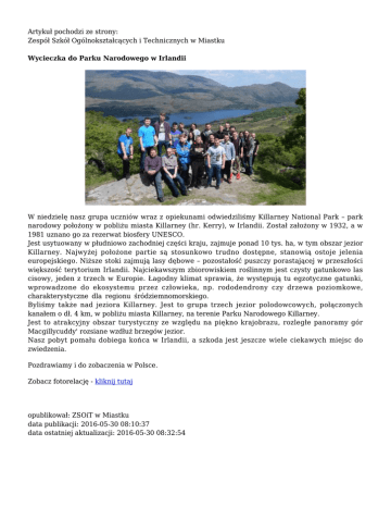 Artykuł pochodzi ze strony: Zespół Szkół Ogólnokształcących i Technicznych w Miastku Wycieczka do Parku Narodowego w Irlandii W niedzielę nasz grupa uczniów wraz z opiekunami odwiedziliśmy Killarney National Park – park narodowy położony w pobliżu miasta Killarney (hr. Kerry), w Irlandii. Został założony w 1932, a w 1981 uznano go za rezerwat biosfery UNESCO. Jest usytuowany w płudniowo zachodniej części kraju, zajmuje ponad 10 tys. ha, w tym obszar jezior Killarney. Najwyżej położone partie są stosunkowo trudno dostępne, stanowią ostoje jelenia europejskiego. Niższe stoki zajmują lasy dębowe – pozostałość puszczy porastającej w przeszłości większość terytorium Irlandii. Najciekawszym zbiorowiskiem roślinnym jest czysty gatunkowo las cisowy, jeden z trzech w Europie. Łagodny klimat sprawia, że występują tu egzotyczne gatunki, wprowadzone do ekosystemu przez człowieka, np. rododendrony czy drzewa poziomkowe, charakterystyczne dla regionu śródziemnomorskiego. Byliśmy także nad jeziora Killarney. Jest to grupa trzech jezior polodowcowych, połączonych kanałem o dł. 4 km, w pobliżu miasta Killarney, na terenie Parku Narodowego Killarney. Jest to atrakcyjny obszar turystyczny ze względu na piękno krajobrazu, rozległe panoramy gór Macgillycuddy' rozsiane wzdłuż brzegów jezior. Nasz pobyt pomału dobiega końca w Irlandii, a szkoda jest jeszcze wiele ciekawych miejsc do zwiedzenia. Pozdrawiamy i do zobaczenia w Polsce. Zobacz fotorelację - kliknij tutaj opublikował: ZSOiT w Miastku data publikacji: 2016-05-30 08:10:37 data ostatniej aktualizacji: 2016-05-30 08:32:54