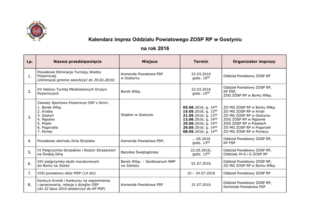 Kalendarz imprez Oddziału Powiatowego ZOSP RP w Gostyniu na rok 2016 Lp. Nazwa przedsięwzięcia Miejsce Termin Organizator imprezy 1. Powiatowe Eliminacje Turnieju Wiedzy Pożarniczej (eliminacje gminne zakończyć do 29.02.2016) Komenda Powiatowa PSP w Gostyniu 22.03.2016 godz. 1000 Oddział Powiatowy ZOSP RP 2. XV Halowy Turniej Młodzieżowych Drużyn Pożarniczych Borek Wlkp. 22.03.2016 godz. 1000 Oddział Powiatowy ZOSP RP, KP PSP, ZOG ZOSP RP w Borku Wlkp. 3. Zawody Sportowo-Pożarnicze OSP z Gmin: 1. Borek Wlkp. 2. Krobia 3. Gostyń 4. Pępowo 5. Piaski 6. Pogorzela 7. Poniec 4. Powiatowe obchody Dnia Strażaka Komenda Powiatowa PSP; 5. VI Pielgrzymka Strażaków i Rodzin Strażackich na Świętą Górę 6. XIV pielgrzymka służb mundurowych do Borku na Zdzież 7. XXII powiatowy obóz MDP (14 dni) 8. Konkurs Kronik i Konkursu na wspomnienia i opracowania, relacje z dziejów OSP (do 22 lipca 2016 dostarczyć do KP PSP) Stadion w Gostyniu 05.06.2016; 15.05.2016; 21.05.2016; 12.06.2016; 25.06.2016; 29.05.2016; 08.05.2016; g. g. g. g. g. g. g. 1400 1300 1300 1400 1400 1400 1400 ZO MG ZOSP RP w Borku Wlkp. ZO MG ZOSP RP w Krobi ZO MG ZOSP RP w Gostyniu ZOG ZOSP RP w Pępowie ZOG ZOSP RP w Piaskach ZO MG ZOSP RP w Pogorzeli ZO MG ZOSP RP w Poniecu ....05.2016 godz. 1300 Oddział Powiatowy ZOSP RP, KP PSP Bazylika Świętogórska 22.05.2016; godz. 1200 Oddział Powiatowy ZOSP RP, Oddziały M-G i G ZOSP RP Borek Wlkp. – Sanktuarium NMP na Zdzieżu 01.07.2016 Oddział Powiatowy ZOSP RP, ZO MG ZOSP RP w Borku Wlkp. Komenda Powiatowa PSP 10 – 24.07.2016 Oddział Powiatowy ZOSP RP 31.07.2016 Oddział Powiatowy ZOSP RP, Komenda Powiatowa PSP Lp. 9. 10. MRad Nazwa przedsięwzięcia Miejsce Termin Organizator imprezy Powiatowe Eliminacje Konkursu Plastycznego (do 30.11.2016r. prace z eliminacji gminnych przekazać do KP PSP w Gostyniu) Komenda Powiatowa PSP 9.12.2016 godz. 1000 Oddział Powiatowy ZOSP RP KP PSP Mikołajkowy Turniej Tenisa Stołowego strażaków, prezesów i Komendanta PSP Pogorzela 3.12.2016 Oddział Powiatowy ZOSP RP Oddział MG ZOSP RP w Pogorzeli