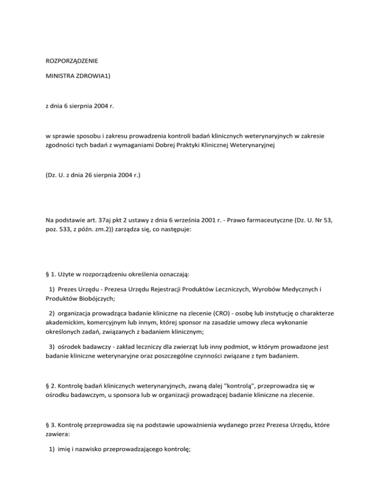 ROZPORZĄDZENIE MINISTRA ZDROWIA1) z dnia 6 sierpnia 2004 r. w sprawie sposobu i zakresu prowadzenia kontroli badań klinicznych weterynaryjnych w zakresie zgodności tych badań z wymaganiami Dobrej Praktyki Klinicznej Weterynaryjnej (Dz. U. z dnia 26 sierpnia 2004 r.) Na podstawie art. 37aj pkt 2 ustawy z dnia 6 września 2001 r. - Prawo farmaceutyczne (Dz. U. Nr 53, poz. 533, z późn. zm.2)) zarządza się, co następuje: § 1. Użyte w rozporządzeniu określenia oznaczają: 1) Prezes Urzędu - Prezesa Urzędu Rejestracji Produktów Leczniczych, Wyrobów Medycznych i Produktów Biobójczych; 2) organizacja prowadząca badanie kliniczne na zlecenie (CRO) - osobę lub instytucję o charakterze akademickim, komercyjnym lub innym, której sponsor na zasadzie umowy zleca wykonanie określonych zadań, związanych z badaniem klinicznym; 3) ośrodek badawczy - zakład leczniczy dla zwierząt lub inny podmiot, w którym prowadzone jest badanie kliniczne weterynaryjne oraz poszczególne czynności związane z tym badaniem. § 2. Kontrolę badań klinicznych weterynaryjnych, zwaną dalej "kontrolą", przeprowadza się w ośrodku badawczym, u sponsora lub w organizacji prowadzącej badanie kliniczne na zlecenie. § 3. Kontrolę przeprowadza się na podstawie upoważnienia wydanego przez Prezesa Urzędu, które zawiera: 1) imię i nazwisko przeprowadzającego kontrolę; 2) cel i zakres kontroli; 3) miejsce przeprowadzenia kontroli; 4) datę wydania upoważnienia. § 4. Zakres prowadzonej kontroli obejmuje sprawdzenie w szczególności: 1) czy badanie kliniczne weterynaryjne prowadzone jest na podstawie pozwolenia wydanego przez ministra właściwego do spraw zdrowia; 2) czy i w jakim stopniu badacz lub sponsor realizują zobowiązania wynikające z wymagań Dobrej Praktyki Klinicznej Weterynaryjnej; 3) wykorzystywanych w badaniu klinicznym urządzeń i pomieszczeń; 4) zgodności prowadzenia badania klinicznego weterynaryjnego z zatwierdzonym protokołem badania klinicznego i z zaakceptowanymi zmianami do tego protokołu; 5) sposobu dokumentowania danych i przechowywania dokumentacji. § 5. 1. Kontrolę przeprowadza się na podstawie planu kontroli, który zawiera: 1) nazwisko i imię przeprowadzającego kontrolę; 2) nazwę podmiotu objętego kontrolą oraz określenie miejsc planowanej kontroli; 3) proponowaną datę rozpoczęcia kontroli; 4) cel i zakres kontroli; 5) listę osób, których obecność będzie obowiązkowa podczas kontroli; 6) wykaz dokumentów mających podlegać kontroli; 7) proponowany harmonogram kontroli, w szczególności godziny rozpoczynania kontroli; 8) plan przewidywanych spotkań. 2. Plan kontroli wraz z kopią upoważnienia Prezesa Urzędu do jej przeprowadzenia przeprowadzający kontrolę, na miesiąc przed planowaną datą jej rozpoczęcia, przekazuje sponsorowi oraz podmiotowi objętemu kontrolą. 3. W przypadku gdy podmiot objęty kontrolą zgłasza zastrzeżenia do planu kontroli, zastrzeżenia te powinny być rozstrzygnięte przed rozpoczęciem kontroli. 4. Kontrolę rozpoczyna spotkanie przeprowadzającego kontrolę z osobami, o których mowa w ust. 1 pkt 5; spotkanie ma na celu omówienie zakresu i harmonogramu kontroli. 5. W przypadku gdy przeprowadzający kontrolę uzyska w formie ustnej informacje mające wpływ na wynik kontroli, sprawdza je i potwierdza na piśmie. 6. W uzasadnionych przypadkach harmonogram kontroli może ulec zmianom, o których przeprowadzający kontrolę niezwłocznie powiadamia podmiot objęty kontrolą oraz sponsora. 7. Kontrolę kończy spotkanie przeprowadzającego kontrolę z osobami, o których mowa w ust. 1 pkt 5; spotkanie ma na celu omówienie wyników kontroli, jej podsumowanie oraz zapoznanie się przeprowadzającego kontrolę z wyjaśnieniami osób uczestniczących w spotkaniu. § 6. 1. Po zakończeniu kontroli przeprowadzający kontrolę wystawia zaświadczenie o przeprowadzeniu kontroli oraz w terminie nie dłuższym niż 21 dni od dnia jej zakończenia sporządza raport z kontroli i niezwłocznie przekazuje go Prezesowi Urzędu. 2. Zaświadczenie, o którym mowa w ust. 1, otrzymują sponsor, badacz oraz Centralna Ewidencja Badań Klinicznych. 3. Zaświadczenie, o którym mowa w ust. 1, zawiera w szczególności: 1) zakres przeprowadzonej kontroli; 2) nazwę podmiotu objętego kontrolą oraz określenie miejsca przeprowadzonych kontroli; 3) termin przeprowadzonej kontroli; 4) nazwisko i imię przeprowadzającego kontrolę; 5) datę wystawienia zaświadczenia; 6) w przypadku stwierdzenia nieprawidłowości lub uchybień - dodatkowe informacje na temat wyników kontroli. 4. Raport, o którym mowa w ust. 1, zawiera w szczególności: 1) imię i nazwisko przeprowadzającego kontrolę; 2) datę przeprowadzonej kontroli; 3) cel i zakres kontroli; 4) listę osób obecnych podczas kontroli, będących przedstawicielami podmiotu objętego kontrolą; 5) określenie miejsc, w których przeprowadzono kontrolę; 6) opis przeprowadzonych czynności kontrolnych; 7) opis zastosowanych metod i procedur; 8) wnioski z przeprowadzonej kontroli, a w przypadku stwierdzenia nieprawidłowości lub uchybień szczegółowy ich opis oraz zalecenia pokontrolne; 9) listę podmiotów, które powinny otrzymać raport; 10) podpis przeprowadzającego kontrolę i datę sporządzenia raportu. 5. W przypadku stwierdzenia przez przeprowadzającego kontrolę nieprawidłowości zagrażających życiu lub zdrowiu zwierząt poddanych badaniu niezwłocznie powiadamia on o tym Prezesa Urzędu. § 7. 1. W przypadku stwierdzonych i udokumentowanych w raporcie nieprawidłowości i uchybień Prezes Urzędu przekazuje sponsorowi oraz badaczowi zalecenia pokontrolne, z wnioskiem o ich usunięcie w terminie nie dłuższym niż 30 dni od dnia otrzymania wniosku. 2. Sponsor i badacz niezwłocznie przesyłają Prezesowi Urzędu informacje o wykonaniu zaleceń lub o przyczynach ich niewykonania. 3. Kontrola może obejmować również sprawdzenie wykonanych zaleceń pokont