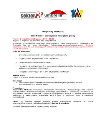 Bezpłatny warsztat Word Excel- praktyczne narzędzia pracy Termin: 8 września 2010, godz. 14:00 – 20:00 Miejsce: ul. Legnicka 65, Wrocław, sala komputerowa Uczestnicy: przedstawiciele organizacji pozarządowych i grup nieformalnych działających we Wrocławiu lub na rzecz Wrocławian (członkowie/pracownicy/wolontariusze). Szkolenie przeznaczone jest dla osób posiadających podstawową wiedzę w zakresie obsługi programów Word i Excel- szczególnie. Program szkolenia: przygotowanie materiałów prezentacyjnych/szkoleniowych, szybkie i łatwe projektowania tabeli i wykresów, projektowanie dyplomów/certyfikatów, tworzeniu narzędzi pomocnych w konstruowaniu budżetu projektu, harmonogramu oraz podsumowań i statystyk liczbowych, narzędzia usprawniające pracę przy edycji plików tekstowych. Metody pracy: Zajęcia praktyczne, indywidualnie przy komputerze. Cele zajęć: usprawnienie pracy uczestników szkolenia w codziennym użytkowaniu arkusza kalkulacyjnego oraz edytora tekstu. Prowadzący: Aleksandra Michalik-absolwentka matematyki Uniwersytetu Wrocławskiego oraz Studium Komunikowania i Kreowania Wizerunku Publicznego, specjalistka ds. komunikacji i współpracy we Wrocławskim Centrum Wspierania Organizacji Pozarządowych SEKTOR 3, posiada doświadczenie praktyczne w wykorzystaniu programów Word i Excel w codziennej pracy w organizacji pozarządowej. Zapisy na szkolenie poprzez wysłanie ankiety zgłoszeniowej www.sektor3.wroclaw.pl (zakładka „Szkolenia”) do dnia 3 września. Szkolenie jest realizowane ze środków Gminy Wrocław. dostępnej na stronie Bezpłatny warsztat Asertywność jako narzędzie obrony Termin: 24 września 2010, godz. 10:00 –18.00 Miejsce: ul. Legnicka 65, Wrocław, sala szkoleniowa Uczestnicy: przedstawiciele organizacji pozarządowych i grup nieformalnych działających we Wrocławiu lub na rzecz Wrocławian (członkowie/pracownicy/wolontariusze). Program szkolenia: Czym jest, a czym nie jest asertywność: bierność, asertywność, agresja Rola praw w zachowaniu postawy asertywnej Asertywna odmowa Asertywna reakcja na atak i krytykę Metody pracy: Zajęcia prowadzone będą metodami warsztatowymi. Cele zajęć: zapoznanie z podstawową wiedzą z zakresu asertywności wyposażenie uczestników w narzędzia asertywnej obrony Prowadząca: Ewelina Seklecka- trenerka, specjalistka ds. szkoleń Centrum Wspierania Organizacji Pozarządowych Sektor 3, pedagożka (specjalizacja poradnictwo), absolwentka Szkoły Treningu Grupowego w Training and Consulting, II edycji Szkoły Młodych Trenerów Instytutu Edukacji Społecznej, oraz Kursu Teorii i Psychoterapii Analizy Transakcyjnej Ośrodka Aion, zakończonego Testem 101 Zapisy na szkolenie poprzez wysłanie ankiety zgłoszeniowej www.sektor3.wroclaw.pl (zakładka „Szkolenia”) do dnia 16 września. Szkolenie jest realizowane ze środków Gminy Wrocław. dostępnej na stronie
