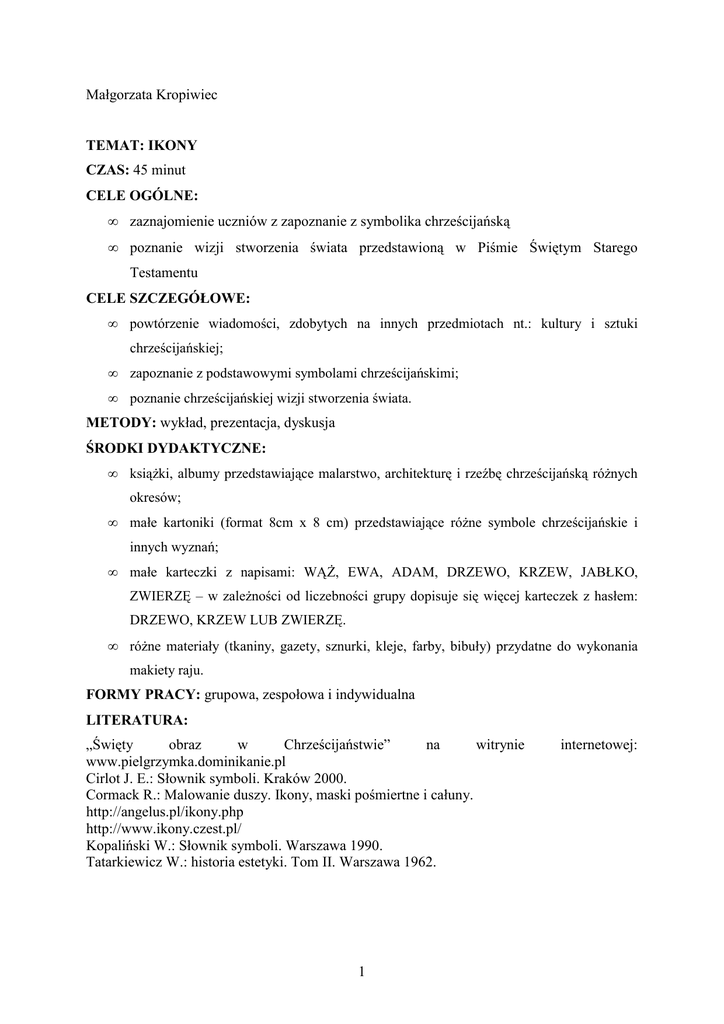 Małgorzata Kropiwiec TEMAT: IKONY CZAS: 45 minut CELE OGÓLNE: • zaznajomienie uczniów z zapoznanie z symbolika chrześcijańską • poznanie wizji stworzenia świata przedstawioną w Piśmie Świętym Starego Testamentu CELE SZCZEGÓŁOWE: • powtórzenie wiadomości, zdobytych na innych przedmiotach nt.: kultury i sztuki chrześcijańskiej; • zapoznanie z podstawowymi symbolami chrześcijańskimi; • poznanie chrześcijańskiej wizji stworzenia świata. METODY: wykład, prezentacja, dyskusja ŚRODKI DYDAKTYCZNE: • ksiąŜki, albumy przedstawiające malarstwo, architekturę i rzeźbę chrześcijańską róŜnych okresów; • małe kartoniki (format 8cm x 8 cm) przedstawiające róŜne symbole chrześcijańskie i innych wyznań; • małe karteczki z napisami: WĄś, EWA, ADAM, DRZEWO, KRZEW, JABŁKO, ZWIERZĘ – w zaleŜności od liczebności grupy dopisuje się więcej karteczek z hasłem: DRZEWO, KRZEW LUB ZWIERZĘ. • róŜne materiały (tkaniny, gazety, sznurki, kleje, farby, bibuły) przydatne do wykonania makiety raju. FORMY PRACY: grupowa, zespołowa i indywidualna LITERATURA: „Święty obraz w Chrześcijaństwie” na witrynie www.pielgrzymka.dominikanie.pl Cirlot J. E.: Słownik symboli. Kraków 2000. Cormack R.: Malowanie duszy. Ikony, maski pośmiertne i całuny. http://angelus.pl/ikony.php http://www.ikony.czest.pl/ Kopaliński W.: Słownik symboli. Warszawa 1990. Tatarkiewicz W.: historia estetyki. Tom II. Warszawa 1962. 1 internetowej: PRZEBIEG ZAJĘĆ I. WPROWADZENIE W TEMAT ZAJĘĆ. Dziś na zajęciach porozmawiamy o sztuce pisania ikon. Narodziły się one w Bizancjum. W kościołach Bizancjum współdziałały wszystkie sztuki: monumentalna architektura, mozaiki, malowidła na ścianach i sklepieniach, sprzęty, stroje liturgiczne II. CZĘŚĆ ZASADNICZA IKONA- czyli sztuka sakralna Kościoła Wschodniego została juŜ dawno odkryta na Zachodzie, wciąŜ jednak na jej temat utrzymuje się wiele błędnych opinii, wynikających zapewne z naszej odmiennej tradycji kulturowej. Przede wszystkim - zupełnie ahistorycznie niektórzy łączą ikony z Rosją, uznając je za kulturowe dziedzictwo wyłącznie tego kraju, lub teŜ za dziedzictwo Kościoła Wschodniego, nie mające nic wspólnego z Kościołem Zachodnim. W rzeczywistości, kiedy powstawały i rozpowszechniały się pierwsze ikony (a było to w V- VI wie- ku), Kościół nie był podzielony, przeciwnie - był bardziej niŜ kiedykolwiek zjednoczony w walce z herezją. Ruś, która przyjęła nową religię w 988 roku, była ostatnim państwem, które przyjęło chrzest z Bizancjum, zaś Kościół bizantyjski był pierwotnie tylko jedną z diecezji, a jego niezwykła sztuka stanowiła zaledwie wspaniałą odmianę w ramach nurtu artystycznego. Ikony są więc kulturowym dziedzictwem całego świata chrześcijańskiego. Przed schizmą, która w 1054 roku w sposób nieodwracalny podzieliła Kościół na Zachodni i Wschodni (określający później się jako prawdziwie ortodoksyjny) ikony istniały juŜ od co najmniej czterech stuleci w całym świecie chrześcijańskim, od Syrii, po Egipt, od bizantyjskiego Wschodu, po karoliński Zachód. Nie wszyscy wiedzą, Ŝe niektóre spośród najstarszych ikon pochodzących nawet z włoskiego średniowiecza, zachowały się w Rzymie, gdzie miał miejsce ich początek w twórczości Duccia di Buoninsegna i Giotta. Są nawet tacy badacze, którzy sięgają jeszcze dalej, chociaŜby do malowideł naściennych w katakumbach, stanowiących nierzadko wręcz prawzory późniejszych tematów ikonowych i stylu ich formy malarskiej. Kolejną nieścisłością jest powszechna opinia, Ŝe ikona to po prostu obraz o tematyce religijnej, wizerunek dewocyjny, podobny do tych, które wypełniają kościoły i które umieszczamy w domach, dla zamanifestowania naszej wiary, by modlić się lub po prostu, by zadośćuczynić tradycji, czy teŜ upodobaniom. W rzeczywistości ikony nie mogą być pojmowane wyłącznie w kategorii przedmiotów artystycznych: zawierają w sobie znacznie więcej. W tym momencie walor artystyczny ikony jest wartością poniekąd uboczną, marginalną. Tym natomiast, co wyróŜnia ikonę, jest - wyobraŜająca się przez obraz - Tajemnica Boga. 2 W tradycji Kościoła Wschodniego, skodyfikowanej przez sobory, ikona jest "sakramentalnym uczestnikiem istoty Boga". Jest ona miejscem, gdzie Bóg jest obecny i dostępny, jest łaską Jego nieskończonego miłosierdzia, a takŜe okazją, by "dotknąć poły Jego płaszcza". Aby pojąć to szczególne znaczenie, jakie Kościół Wschodni nadaje ikonie, naleŜy cofnąć się aŜ do zarania dziejów ludzkości. JuŜ w czasach prehistorycznych człowiek posługiwał się wizerunkiem, by nawiązać kontakt z pierwiastkiem boskim. Najstarsze cywilizacje odwoływały się do sztuki, jako środka wyraŜenia boskości (np. w egipskim malarstwie religijnym - na papirusach, stelach, w grobowcach - uŜycie znaku symbolizującego spotkanie duszy z bóstwem w zaświatach). W cywilizacjach przedchrześcijańskich wizerunek miał charakter sakralny, był symbolem obecności. Na przykład u Rzymian, w prowincjach odległych od Rzymu, w sądach przy wydawaniu wyroku musiała być zawsze wystawiona podobizna cesarza - Divus - aby trybunał mógł występować w jego imieniu. Owa " imago efficiens " gwarantowała świętość kaŜdego wyroku, jakby był wydany przez samego cesarza. Podobizna czyniła realną obecność tego, kogo przedstawiała. To na soborze efeskim określono ikonę, jako "przybytek", czyli miejsce, w którym przestawiona osoba jest równieŜ w cudowny sposób obecna, jest uczestnikiem Tajemnicy Wcielenia- tego niepojętego wydarzenia, kiedy to Bóg stał się człowiekiem, aby człowiek stał się Bogiem. Odnosząc takie uobecniające rozumienie sensu ikony do nauki Kościoła Rzymskiego, moŜna by je przyrównać wręcz do rozumienia Sakramentów Świętych. Ikona przestaje więc być jedynie sakralnym, czy