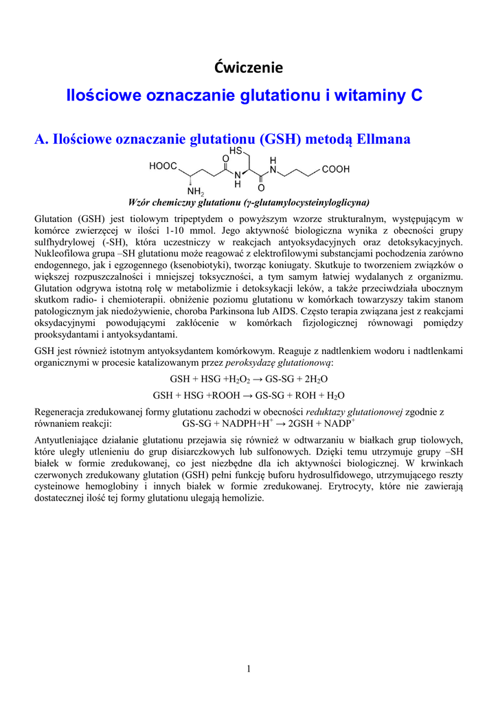 Ćwiczenie Ilościowe oznaczanie glutationu i witaminy C A. Ilościowe oznaczanie glutationu (GSH) metodą Ellmana Wzór chemiczny glutationu (γ-glutamylocysteinyloglicyna) Glutation (GSH) jest tiolowym tripeptydem o powyższym wzorze strukturalnym, występującym w komórce zwierzęcej w ilości 1-10 mmol. Jego aktywność biologiczna wynika z obecności grupy sulfhydrylowej (-SH), która uczestniczy w reakcjach antyoksydacyjnych oraz detoksykacyjnych. Nukleofilowa grupa –SH glutationu może reagować z elektrofilowymi substancjami pochodzenia zarówno endogennego, jak i egzogennego (ksenobiotyki), tworząc koniugaty. Skutkuje to tworzeniem związków o większej rozpuszczalności i mniejszej toksyczności, a tym samym łatwiej wydalanych z organizmu. Glutation odgrywa istotną rolę w metabolizmie i detoksykacji leków, a także przeciwdziała ubocznym skutkom radio- i chemioterapii. obniżenie poziomu glutationu w komórkach towarzyszy takim stanom patologicznym jak niedożywienie, choroba Parkinsona lub AIDS. Często terapia związana jest z reakcjami oksydacyjnymi powodującymi zakłócenie w komórkach fizjologicznej równowagi pomiędzy prooksydantami i antyoksydantami. GSH jest również istotnym antyoksydantem komórkowym. Reaguje z nadtlenkiem wodoru i nadtlenkami organicznymi w procesie katalizowanym przez peroksydazę glutationową: GSH + HSG +H2O2 → GS-SG + 2H2O GSH + HSG +ROOH → GS-SG + ROH + H2O Regeneracja zredukowanej formy glutationu zachodzi w obecności reduktazy glutationowej zgodnie z równaniem reakcji: GS-SG + NADPH+H+ → 2GSH + NADP+ Antyutleniające działanie glutationu przejawia się również w odtwarzaniu w białkach grup tiolowych, które uległy utlenieniu do grup disiarczkowych lub sulfonowych. Dzięki temu utrzymuje grupy –SH białek w formie zredukowanej, co jest niezbędne dla ich aktywności biologicznej. W krwinkach czerwonych zredukowany glutation (GSH) pełni funkcję buforu hydrosulfidowego, utrzymującego reszty cysteinowe hemoglobiny i innych białek w formie zredukowanej. Erytrocyty, które nie zawierają dostatecznej ilość tej formy glutationu ulegają hemolizie. 1 Glutation uczestniczy ponadto w redukcji rybonukleotydów z utworzeniem deoksyrybonukleotydów, czyli bezpośrednio wpływa na biosyntezę DNA. Glutation utrzymuje także sprawność układu odpornościowego poprzez udział w powstawaniu i funkcjonowaniu limfocytów (zwłaszcza grasicozależnych T niszczących obce komórki) oraz ochrania witaminy E i C przed utlenianiem, utrzymując ich prawidłowy poziom w organizmie. Glutation uczestniczy również w syntezie leukotrienów LTC4 i LTD4, którym przypisuje się zdolność do powolnego kurczenia mięśni gładkich dróg oddechowych i przewodu pokarmowego oraz zwiększenia przepuszczalności naczyń włosowatych, co sprzyja powstawaniu obrzęków zapalnych. Wspomniany tripeptyd uczestniczy w przekształceniu prostaglandyny PGG2 w PGH2 na etapie katalizowanym przez hydroperoksydazę prostaglandynową, czyli syntazę PGH2. W komórkach zwierzęcych zredukowany glutation uczestniczy również w transporcie aminokwasów do komórki drogą cyklu γ-glutamylowego. Po zewnętrznej stronie błony komórkowej dowolny aminokwas (z wyjątkiem proliny) wiąże się z przenośnikiem, czyli γ-glutamylotranspeptydazą, która jest integralnym składnikiem błony komórkowej. Podczas przemieszczania się przez błonę aminokwas wytwarza wiązanie izopeptydowe z grupą γ-karboksylową glutaminianu pochodzącego z glutationu i powstaje γglutamyloaminokwas. Ten dipeptyd nie wykazuje powinowactwa do przenośnika, uwalniany jest do cytozolu, gdzie pod wpływem γ-glutamylocyklotransferazy następuje jego rozpad do pierwotnej formy aminokwasu. Natomiast reszta glutaminianu przekształca się w 5-oksoprolinę, która w obecności 5oksoprolinazy tworzy glutaminian. Pozostały fragment glutationu, czyli cysteinyloglicyna ulega hydrolizie do cysteiny i glicyny. Tym samym aminokwas został przetransportowany do komórki, a glutation rozpadł się na elementy składowe – Glu, Cys, Gly mogące uczestniczyć w odtworzeniu glutationu. Glutaminian reaguje bowiem z cysteiną tworząc γ-glutamylocysteinę, która przyłącza glicynę odtwarzając strukturę glutationu mogącego ponownie włączyć sie w kolejny obrót cyklu γ-glutamylowego. Transport jednej cząsteczki aminokwasu drogą cyklu γ-glutamylowego jest kosztowny energetycznie, wymaga bowiem 2 wykorzystania aż 3 cząsteczek ATP, czyli jest 9 razy więcej niż transport tego związku z wykorzystaniem symportowego przenośnika zależnego od Na+. Cykl γ-glutamylowy funkcjonuje w wielu narządach, szczególnie w jelitach i kanalikach nerkowych. Jednak dysfunkcje związane na przykład z wrodzonym brakiem γ-glutamylotranspeptydazy nie powodują żadnych zaburzeń w transporcie aminokwasów. prawdopodobnie komórki dysponują kilkoma alternatywnymi mechanizmami transportu aminokwasów. 3 Zasada oznaczenia ilości glutationu metodą Ellmana Glutation stanowi prawie 97% niebiałkowych związków tiolowych i dlatego oznaczając niebiałkowe grupy –SH w odbiałczonym przy użyciu kwasu trichlorooctowego (TCA) homogenacie wątroby glutation oznaczany jest praktycznie ilościowo. Ten tripeptyd oznacza się technika spektrofotometryczną z wykorzystaniem metody Ellmana, która polega na redukcji kwasu 5,5-ditiobis-(2-nitrobenzoesowego), czyli DNTB przez związki tiolowe do barwnego kwasu 2-nitro-5-merkaptobenzoesowego, wykazującego maksimum absorbancji przy długości fali λ = 412 nm. 4 Odczynniki: 1) 0,1M bufor fosfornowy ph=7,25 2) 0,2M bufor fosforanowy pH=7,8 3) 0,006M roztworu DTNB 4) 50% roztwór TCA 5) 2,5% roztwór TCA 6) 1mM roztwór glutationu w 2,5% roztworze TCA Wykonanie: I. Sporządzić krzywą wzorcową dla glutationu. W tym celu sporządzić szereg rozcieńczeń 1 mM roztworu GSH postępując zgodnie ze wskazówkami umieszczonymi w poniższej tabeli. objętość roztworów [µl