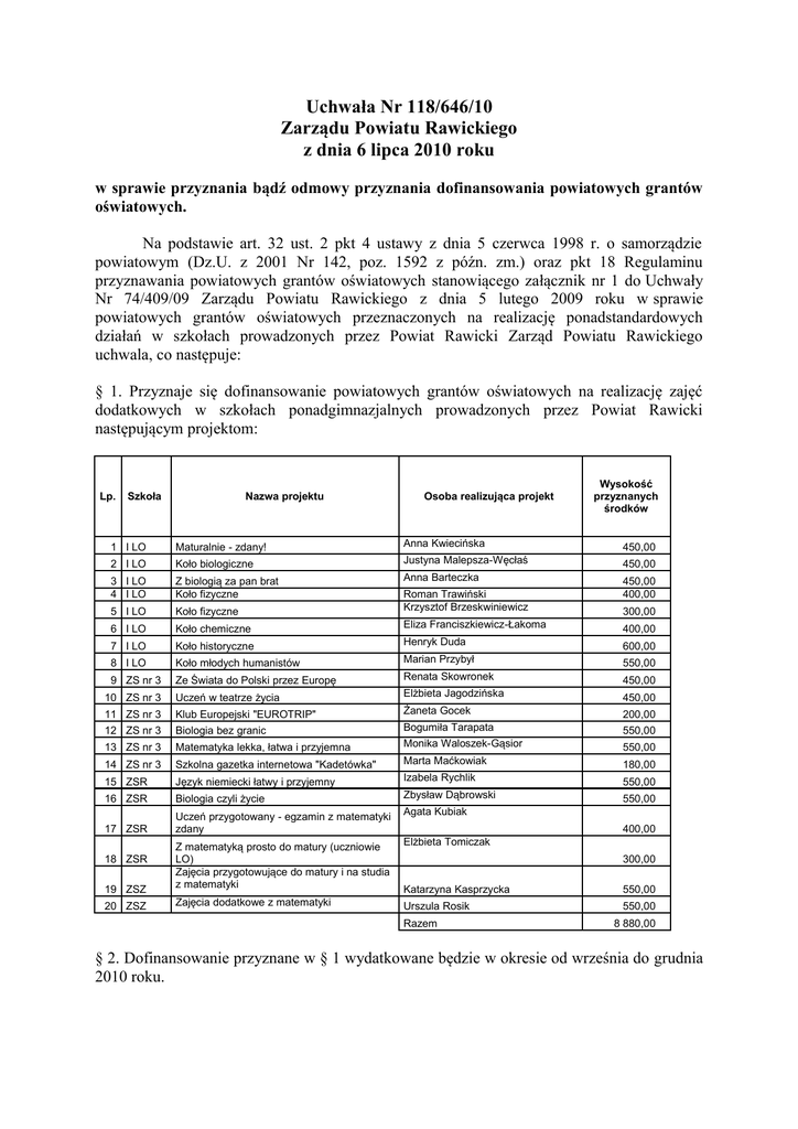 Uchwała Nr 118/646/10 Zarządu Powiatu Rawickiego z dnia 6 lipca 2010 roku w sprawie przyznania bądź odmowy przyznania dofinansowania powiatowych grantów oświatowych. Na podstawie art. 32 ust. 2 pkt 4 ustawy z dnia 5 czerwca 1998 r. o samorządzie powiatowym (Dz.U. z 2001 Nr 142, poz. 1592 z późn. zm.) oraz pkt 18 Regulaminu przyznawania powiatowych grantów oświatowych stanowiącego załącznik nr 1 do Uchwały Nr 74/409/09 Zarządu Powiatu Rawickiego z dnia 5 lutego 2009 roku w sprawie powiatowych grantów oświatowych przeznaczonych na realizację ponadstandardowych działań w szkołach prowadzonych przez Powiat Rawicki Zarząd Powiatu Rawickiego uchwala, co następuje: § 1. Przyznaje się dofinansowanie powiatowych grantów oświatowych na realizację zajęć dodatkowych w szkołach ponadgimnazjalnych prowadzonych przez Powiat Rawicki następującym projektom: Lp. Szkoła Nazwa projektu Osoba realizująca projekt Wysokość przyznanych środków 1 I LO Maturalnie - zdany! Anna Kwiecińska 450,00 2 I LO Koło biologiczne Justyna Malepsza-Węcłaś 450,00 3 I LO 4 I LO Z biologią za pan brat Koło fizyczne Anna Barteczka 450,00 400,00 5 I LO Koło fizyczne Roman Trawiński Krzysztof Brzeskwiniewicz 6 I LO Koło chemiczne Eliza Franciszkiewicz-Łakoma 400,00 7 I LO Koło historyczne Henryk Duda 600,00 8 I LO Koło młodych humanistów Marian Przybył 550,00 9 ZS nr 3 Ze Świata do Polski przez Europę Renata Skowronek 450,00 10 ZS nr 3 Uczeń w teatrze życia Elżbieta Jagodzińska 450,00 11 ZS nr 3 12 ZS nr 3 Klub Europejski "EUROTRIP" Biologia bez granic Żaneta Gocek 200,00 550,00 13 ZS nr 3 Matematyka lekka, łatwa i przyjemna Bogumiła Tarapata Monika Waloszek-Gąsior 14 ZS nr 3 Szkolna gazetka internetowa "Kadetówka" Marta Maćkowiak 180,00 15 ZSR Język niemiecki łatwy i przyjemny Izabela Rychlik 550,00 16 ZSR Biologia czyli życie Zbysław Dąbrowski 550,00 Uczeń przygotowany - egzamin z matematyki zdany Agata Kubiak Elżbieta Tomiczak 19 ZSZ Z matematyką prosto do matury (uczniowie LO) Zajęcia przygotowujące do matury i na studia z matematyki 20 ZSZ Zajęcia dodatkowe z matematyki Urszula Rosik 17 ZSR 18 ZSR 300,00 550,00 400,00 300,00 Katarzyna Kasprzycka Razem 550,00 550,00 8 880,00 § 2. Dofinansowanie przyznane w § 1 wydatkowane będzie w okresie od września do grudnia 2010 roku. § 3. Odmawia się przyznania dofinansowania powiatowych grantów oświatowych na realizację zajęć dodatkowych w szkołach ponadgimnazjalnych prowadzonych przez Powiat Rawicki następującym projektom: Lp. Szkoła Nazwa projektu 1 I LO Tajniki kryptografii 2 ZSR Z matematyką prosto do matury (uczniowie TR) Osoba realizująca projekt Anna Kwiecińska Elżbieta Tomiczak § 4. Wykonanie uchwały powierza się Staroście Rawickiemu. § 5. Uchwała wchodzi w życie z dniem podjęcia. Starosta (-) Zdzisław Maćkowiak Członkowie Zarządu: 1. Zygmunt Wolny (-) 2. Adam Bandura (-) 3. Wiesław Ceglarek (-) 4. Adam Kołwa (-) Uzasadnienie do Uchwały Nr 118/646/10 Zarządu Powiatu Rawickiego z dnia 6 lipca 2010 roku Po zapoznaniu i przeanalizowaniu wniosków o przyznanie powiatowych grantów oświatowych, złożonych przez nauczycieli poszczególnych szkół prowadzonych przez Powiat Rawicki, Komisja opiniująca projekty zajęć dodatkowych w ramach powiatowych grantów oświatowych rozpatrzyła 22 wnioski. Do dofinansowania przyjęto 20 projektów, natomiast 2 wnioski odrzucono, ze względu na fakt, iż osoby wnioskujące złożyły po 2 wnioski, a wysokość wnioskowanych środków znacznie przekroczyła posiadane fundusze do rozdysponowania. Naczelnik Wydziału Oświaty i Spraw Społecznych (-) Maria Wojtkowiak