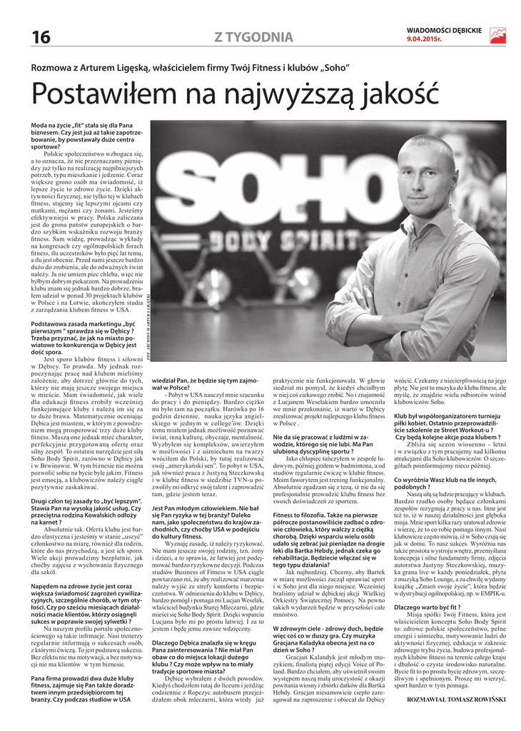 16 Z TYGODNIA WIADOMOŚCI DĘBICKIE 9.04.2015r. Rozmowa z Arturem Ligęską, właścicielem firmy Twój Fitness i klubów „Soho” Moda na życie „fit” stała się dla Pana biznesem. Czy jest już aż takie zapotrzebowanie, by powstawały duże centra sportowe? Polskie społeczeństwo wzbogaca się, a to oznacza, że nie przeznaczamy pieniędzy już tylko na realizację najpilniejszych potrzeb, typu mieszkanie i jedzenie. Coraz większe grono osób ma świadomość, iż lepsze życie to zdrowe życie. Dzięki aktywności fizycznej, nie tylko tej w klubach fitness, stajemy się lepszymi ojcami czy matkami, mężami czy żonami. Jesteśmy efektywniejsi w pracy. Polska zaliczana jest do grona państw europejskich o bardzo szybkim wskaźniku rozwoju branży fitness. Sam widzę, prowadząc wykłady na kongresach czy ogólnopolskich forach fitness, ilu uczestników było pięć lat temu, a ilu jest obecnie. Przed nami jeszcze bardzo dużo do zrobienia, ale do odważnych świat należy. Ja nie umiem piec chleba, więc nie byłbym dobrym piekarzem. Na prowadzeniu klubu znam się jednak bardzo dobrze, brałem udział w ponad 30 projektach klubów w Polsce i na Łotwie, ukończyłem studia z zarządzania klubem fitness w USA. Podstawowa zasada marketingu „być pierwszym ” sprawdza się w Dębicy ? Trzeba przyznać, że jak na miasto powiatowe to konkurencja w Dębicy jest dość spora. Jest sporo klubów fitness i siłowni w Dębicy. To prawda. My jednak rozpoczynając pracę nad klubem mieliśmy założenie, aby dotrzeć głównie do tych, którzy nie mają jeszcze swojego miejsca w mieście. Mam świadomość, jak wiele dla edukacji fitness zrobiły wcześniej funkcjonujące kluby i należą im się za to duże brawa. Matematycznie oceniając Dębica jest miastem, w którym z powodzeniem mogą prosperować trzy duże kluby fitness. Muszą one jednak mieć charakter, perfekcyjnie przygotowaną ofertę oraz silny zespół. To ostatnie narzędzie jest siłą Soho Body Spirit, zarówno w Dębicy jak i w Brwinowie. W tym biznesie nie można pozwolić sobie na bycie byle jakim. Fitness jest emocją, a klubowiczów należy ciągle pozytywnie zaskakiwać. Drugi człon tej zasady to „być lepszym”. Stawia Pan na wysoką jakość usług. Czy przeciętna rodzina Kowalskich odłoży na karnet ? Absolutnie tak. Oferta klubu jest bardzo elastyczna i jesteśmy w stanie „uszyć” członkostwo na miarę, również dla rodzin, które do nas przychodzą, a jest ich sporo. Wiele akcji prowadzimy bezpłatnie, jak choćby zajęcia z wychowania fi zycznego dla szkół. Napędem na zdrowe życie jest coraz większa świadomość zagrożeń cywilizacyjnych, szczególnie chorób, w tym otyłości. Czy po sześciu miesiącach działalności macie klientów, którzy osiągnęli sukces w poprawie swojej sylwetki ? Na naszym profilu portalu społecznościowego są takie infrmacje. Nasi trenerzy regularnie informują o sukcesach osób, z którymi ćwiczą. To jest podstawą sukcesu. Bez efektu nie ma motywacji, a bez motywacji nie ma klientów w tym biznesie. Pana firma prowadzi dwa duże kluby fitness, zajmuje się Pan także doradztwem innym przedsiębiorcom tej branży. Czy podczas studiów w USA FOT. ARCHIWUM ARTURA LIGĘSKI Postawiłem na najwyższą jakość wiedział Pan, że będzie się tym zajmował w Polsce? - Pobyt w USA nauczył mnie szacunku do pracy i do pieniędzy. Bardzo ciężko mi było tam na początku. Harówka po 16 godzin dziennie, nauka języka angielskiego w jednym w college’ów. Dzięki temu miałem jednak możliwość poznawać świat, inną kulturę, obyczaje, mentalność. Wyzbyłem się kompleksów, uwierzyłem w możliwości i z uśmiechem na twarzy wróciłem do Polski, by tutaj realizować swój „amerykański sen”. To pobyt w USA, jak również praca z Justyną Steczkowską i w klubie fitness w siedzibie TVN-u pozwoliły mi odkryć swój talent i zaprowadzić tam, gdzie jestem teraz. Jest Pan młodym człowiekiem. Nie bał się Pan ryzyka w tej branży? Daleko nam, jako społeczeństwu do krajów zachodnich, czy choćby USA w podejściu do kultury fitness. Wyznaję zasadę, iż należy ryzykować. Nie mam jeszcze swojej rodziny, tzn. żony i dzieci, a to sprawia, że łatwiej jest podejmować bardzo ryzykowne decyzji. Podczas studiów Business of Fitness w USA ciągle powtarzano mi, że aby realizować marzenia należy wyjść ze strefy komfortu i bezpieczeństwa. W odniesieniu do klubu w Dębicy, bardzo pomógł i pomaga mi Lucjan Weselak, właściciel budynku Starej Mleczarni, gdzie mieści się Soho Body Spirit. Dzięki wsparciu Lucjana było mi po prostu łatwiej. I za to jestem i będę jemu zawsze wdzięczny. Dlaczego Dębica znalazła się w kręgu Pana zainteresowania ? Nie miał Pan obaw co do miejsca lokacji dużego klubu ? Czy może wpływ na to miały tradycje sportowe miasta? Dębicę wybrałem z dwóch powodów. Kiedyś chodziłem tutaj do liceum i jeżdżąc codziennie z Ropczyc autobusem przejeżdżałem obok mleczarni, która wtedy już praktycznie nie funkcjonowała. W głowie siedział mi pomysł, że kiedyś chciałbym w niej coś ciekawego zrobić. No i znajomość z Lucjanem Weselakiem bardzo umocniła we mnie przekonanie, iż warto w Dębicy zrealizować projekt najlepszego klubu fitness w Polsce . Nie da się pracować z ludźmi w zawodzie, którego się nie lubi. Ma Pan ulubioną dyscyplinę sportu ? Jako chłopiec tańczyłem w zespole ludowym, później grałem w badmintona, a od studiów regularnie ćwiczę w klubie fitness. Moim faworytem jest trening funkcjonalny. Absolutnie zgadzam się z tezą, iż nie da się profesjonalnie prowadzić klubu fitness bez swoich doświadczeń ze sportem. Fitness to filozofia. Także na pierwsze półrocze postanowiliście zadbać o zdrowie człowieka, który walczy z ciężką chorobą. Dzięki wsparciu wielu osób udało się zebrać już pieniądze na drogie leki dla Bartka Hebdy, jednak czeka go rehabilit