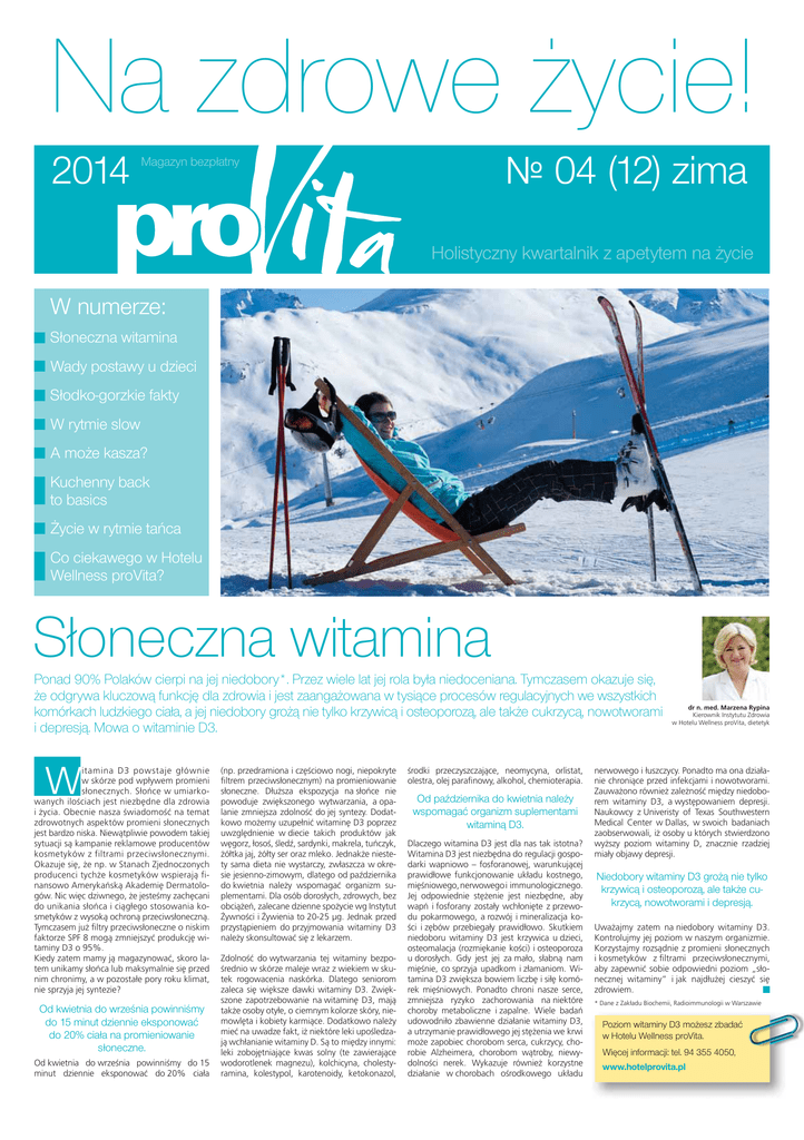 Na zdrowe życie! 2014 № 04 (12) zima Magazyn bezpłatny Holistyczny kwartalnik z apetytem na życie W numerze: Słoneczna witamina Wady postawy u dzieci Słodko-gorzkie fakty W rytmie slow A może kasza? Kuchenny back to basics Życie w rytmie tańca Co ciekawego w Hotelu Wellness proVita? Słoneczna witamina Ponad 90% Polaków cierpi na jej niedobory*. Przez wiele lat jej rola była niedoceniana. Tymczasem okazuje się, że odgrywa kluczową funkcję dla zdrowia i jest zaangażowana w tysiące procesów regulacyjnych we wszystkich komórkach ludzkiego ciała, a jej niedobory grożą nie tylko krzywicą i osteoporozą, ale także cukrzycą, nowotworami i depresją. Mowa o witaminie D3. W itamina D3 powstaje głównie w skórze pod wpływem promieni słonecznych. Słońce w umiarkowanych ilościach jest niezbędne dla zdrowia i życia. Obecnie nasza świadomość na temat zdrowotnych aspektów promieni słonecznych jest bardzo niska. Niewątpliwie powodem takiej sytuacji są kampanie reklamowe producentów kosmetyków z filtrami przeciwsłonecznymi. Okazuje się, że np. w Stanach Zjednoczonych producenci tychże kosmetyków wspierają finansowo Amerykańską Akademię Dermatologów. Nic więc dziwnego, że jesteśmy zachęcani do unikania słońca i ciągłego stosowania kosmetyków z wysoką ochroną przeciwsłoneczną. Tymczasem już filtry przeciwsłoneczne o niskim faktorze SPF 8 mogą zmniejszyć produkcję witaminy D3 o 95%. Kiedy zatem mamy ją magazynować, skoro latem unikamy słońca lub maksymalnie się przed nim chronimy, a w pozostałe pory roku klimat, nie sprzyja jej syntezie? Od kwietnia do września powinniśmy do 15 minut dziennie eksponować do 20% ciała na promieniowanie słoneczne. Od kwietnia do września powinniśmy do 15 minut dziennie eksponować do 20% ciała (np. przedramiona i częściowo nogi, niepokryte filtrem przeciwsłonecznym) na promieniowanie słoneczne. Dłuższa ekspozycja na słońce nie powoduje zwiększonego wytwarzania, a opalanie zmniejsza zdolność do jej syntezy. Dodatkowo możemy uzupełnić witaminę D3 poprzez uwzględnienie w diecie takich produktów jak węgorz, łosoś, śledź, sardynki, makrela, tuńczyk, żółtka jaj, żółty ser oraz mleko. Jednakże niestety sama dieta nie wystarczy, zwłaszcza w okresie jesienno-zimowym, dlatego od października do kwietnia należy wspomagać organizm suplementami. Dla osób dorosłych, zdrowych, bez obciążeń, zalecane dzienne spożycie wg Instytut Żywności i Żywienia to 20-25 μg. Jednak przed przystąpieniem do przyjmowania witaminy D3 należy skonsultować się z lekarzem. Zdolność do wytwarzania tej witaminy bezpośrednio w skórze maleje wraz z wiekiem w skutek rogowacenia naskórka. Dlatego seniorom zaleca się większe dawki witaminy D3. Zwiększone zapotrzebowanie na witaminę D3, mają także osoby otyłe, o ciemnym kolorze skóry, niemowlęta i kobiety karmiące. Dodatkowo należy mieć na uwadze fakt, iż niektóre leki upośledzają wchłanianie witaminy D. Są to między innymi: leki zobojętniające kwas solny (te zawierające wodorotlenek magnezu), kolchicyna, cholestyramina, kolestypol, karotenoidy, ketokonazol, środki przeczyszczające, neomycyna, orlistat, olestra, olej parafinowy, alkohol, chemioterapia. Od października do kwietnia należy wspomagać organizm suplementami witaminą D3. Dlaczego witamina D3 jest dla nas tak istotna? Witamina D3 jest niezbędna do regulacji gospodarki wapniowo – fosforanowej, warunkującej prawidłowe funkcjonowanie układu kostnego, mięśniowego, nerwowego i immunologicznego. Jej odpowiednie stężenie jest niezbędne, aby wapń i fosforany zostały wchłonięte z przewodu pokarmowego, a rozwój i mineralizacja kości i zębów przebiegały prawidłowo. Skutkiem niedoboru witaminy D3 jest krzywica u dzieci, osteomalacja (rozmiękanie kości) i osteoporoza u dorosłych. Gdy jest jej za mało, słabną nam mięśnie, co sprzyja upadkom i złamaniom. Witamina D3 zwiększa bowiem liczbę i siłę komórek mięśniowych. Ponadto chroni nasze serce, zmniejsza ryzyko zachorowania na niektóre choroby metaboliczne i zapalne. Wiele badań udowodniło zbawienne działanie witaminy D3, a utrzymanie prawidłowego jej stężenia we krwi może zapobiec chorobom serca, cukrzycy, chorobie Alzheimera, chorobom wątroby, niewydolności nerek. Wykazuje również korzystne działanie w chorobach ośrodkowego układu dr n. med. Marzena Rypina Kierownik Instytutu Zdrowia w Hotelu Wellness proVita, dietetyk nerwowego i łuszczycy. Ponadto ma ona działanie chroniące przed infekcjami i nowotworami. Zauważono również zależność między niedoborem witaminy D3, a występowaniem depresji. Naukowcy z Univeristy of Texas Southwestern Medical Center w Dallas, w swoich badaniach zaobserwowali, iż osoby u których stwierdzono wyższy poziom witaminy D, znacznie rzadziej miały objawy depresji. Niedobory witaminy D3 grożą nie tylko krzywicą i osteoporozą, ale także cukrzycą, nowotworami i depresją. Uważajmy zatem na niedobory witaminy D3. Kontrolujmy jej poziom w naszym organizmie. Korzystajmy rozsądnie z promieni słonecznych i kosmetyków z filtrami przeciwsłonecznymi, aby zapewnić sobie odpowiedni poziom „słonecznej witaminy” i jak najdłużej cieszyć się zdrowiem. * Dane z Zakładu Biochemii, Radioimmunologii w Warszawie Poziom witaminy D3 możesz zbadać w Hotelu Wellness proVita. Więcej informacji: tel. 94 355 4050, www.hotelprovita.pl zdrowie Wady postawy u dzieci Rozmowa z Pawłem Kałusem – fizjoterapeutą w Hotelu Wellness proVita, specjalizującym się m. in. w zakresie oceny i terapii wad postawy. W ostatnich latach obserwuje się wzrost ilości dzieci z wadami postawy. Statystyki są alarmujące. Wady postawy w Polsce posiada ok. 80% dzieci. Jak mogę stwierdzić, że moje dziecko ma wady postawy? Jako rodzice widzimy nasze dziecko codziennie i nie zauważamy zmian w jego sylwetce. Powtarzamy dzieciom by się „prostowa