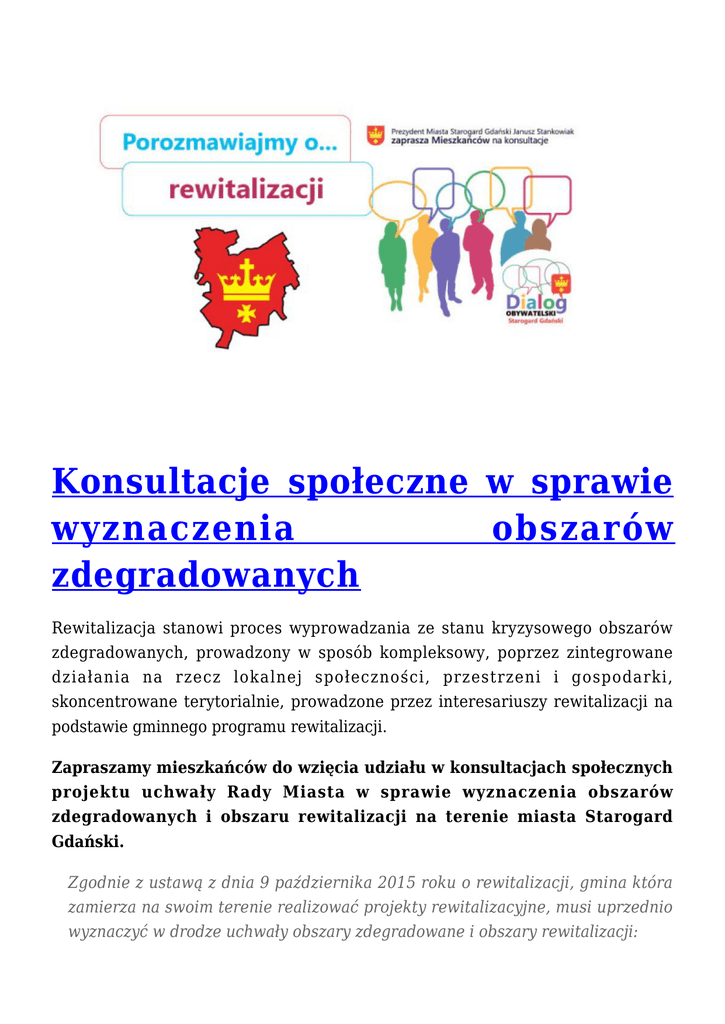 Konsultacje społeczne w sprawie wyznaczenia obszarów zdegradowanych Rewitalizacja stanowi proces wyprowadzania ze stanu kryzysowego obszarów zdegradowanych, prowadzony w sposób kompleksowy, poprzez zintegrowane działania na rzecz lokalnej społeczności, przestrzeni i gospodarki, skoncentrowane terytorialnie, prowadzone przez interesariuszy rewitalizacji na podstawie gminnego programu rewitalizacji. Zapraszamy mieszkańców do wzięcia udziału w konsultacjach społecznych projektu uchwały Rady Miasta w sprawie wyznaczenia obszarów zdegradowanych i obszaru rewitalizacji na terenie miasta Starogard Gdański. Zgodnie z ustawą z dnia 9 października 2015 roku o rewitalizacji, gmina która zamierza na swoim terenie realizować projekty rewitalizacyjne, musi uprzednio wyznaczyć w drodze uchwały obszary zdegradowane i obszary rewitalizacji: obszar zdegradowany – obszar gminy znajdujący się w stanie kryzysowym z powodu występowania negatywnych zjawisk społecznych przy jednoczesnym występowaniu co najmniej jednego z negatywnych zjawisk: gospodarczych, środowiskowych, przestrzenno-funkcjonalnych lub technicznych, obszar rewitalizacji – obszar obejmujący całość lub część obszaru zdegradowanego, cechujący się szczególną koncentracją negatywnych zjawisk, na którym z uwagi na istotne znaczenie dla rozwoju lokalnego gmina zamierza prowadzić rewitalizację, Podstawą do delimitacji obszarów zdegradowanych jest specjalnie przygotowana diagnoza – opracowanie, które na podstawie szeregu wskaźników o charakterze społecznym, gospodarczym i przestrzennym potwierdza spełnienie przez obszar zdegradowany i obszar rewitalizacji przesłanek ich wyznaczenia. Formy konsultacji projektu uchwały: 1. Uwagi, opinie i pomysły dotyczące projektu uchwały w sprawie wyznaczenia obszarów zdegradowanych i obszaru rewitalizacji można przesyłać na adres [email protected]. do 4 kwietnia 2016r. 2. Spotkanie otwarte z mieszkańcami – 31 marca 2016r. o godz. 1600 w Ratuszu, ul. Rynek 1. 3. Konsultacja projektu uchwały przez: Społeczną Radę ds. Osób Niepełnosprawnych Starogardzką Radę Rowerową Starogardzką Radę Sportu Radę Seniorów Gminy Miejskiej Starogard Gdański Młodzieżową Radę Miasta Radę Organizacji Pozarządowych Starogard Gdański Radę Społeczną Radę Gospodarczą Dokumenty: 1. Projekt uchwały w sprawie wyznaczenia obszarów zdegradowanych i obszaru rewitalizacji na terenie miasta Starogard Gdański 2. Załącznik nr 1 do projektu uchwały – mapa obszarów zdegradowanych i obszaru rewitalizacji 3. Załącznik nr 2 do projektu uchwały – opracowanie „Analiza wskaźnikowa obszaru miasta. Delimitacja obszaru zdegradowanego. Wyznaczenie obszaru rewitalizacji”.