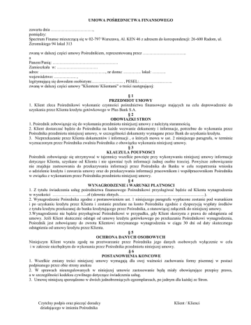 UMOWA POŚREDNICTWA FINANSOWEGO zawarta dnia ……………….…………, pomiędzy: Spectrum Finanse mieszczącą się w 02-797 Warszawa, Al. KEN 46 z adresem do korespondencji: 26-600 Radom, ul. Żeromskiego 94 lokal 313 zwaną w dalszej części umowy Pośrednikiem, reprezentowaną przez ………………………….. a Panem/Panią: ………………………………………… Zamieszkała w: ………………………… adres: …………………………………………, nr domu: …………. lokal: ………. województwo: ……………. , legitymującą się dowodem osobistym:………………….. , PESEL:……………..…….. zwaną w dalszej części umowy "Klientem/ Klientami" o treści następującej: §1 PRZEDMIOT UMOWY 1. Klient zleca Pośrednikowi wykonanie czynności pośrednictwa finansowego mających na celu doprowadzenie do uzyskania przez Klienta kredytu gotówkowego w Plus Bank S.A. §2 OBOWIAZKI STRON 1. Pośrednik zobowiązuje się do wykonania przedmiotu niniejszej umowy z należytą starannością. 2. Klient dostarczać będzie do Pośrednika na każde wezwanie dokumenty i informacje, potrzebne do wykonania przez Pośrednika przedmiotu niniejszej umowy, w szczególności dokumenty wymagane przez Bank do uzyskania kredytu. 3. Nieprzekazanie przez Klienta dokumentów i informacji , o których mowa w ust. 2 niniejszego paragrafu, w terminie wyznaczonym przez Pośrednika zwalnia Pośrednika z obowiązku wykonania niniejszej umowy. §3 KLAUZULA POUFNOSCI Pośrednik zobowiązuje się utrzymywać w tajemnicy wszelkie powzięte przy wykonywaniu niniejszej umowy informacje dotyczące Klienta, uzyskane od Klienta i nie ujawniać tych informacji żadnej osobie trzeciej. Powyższe zobowiązanie nie znajduje zastosowania do przekazywania informacji przez Pośrednika do Banku w celu rozpatrzenia wniosku o udzielenie kredytu i zawarcia umowy oraz do przekazywania informacji pracownikom i współpracownikom Pośrednika w związku z wykonaniem przez Pośrednika przedmiotu niniejszej umowy. §4 WYNAGRODZENIE i WARUNKI PŁATNOSCI 1. Z tytułu świadczenia usług pośrednictwa finansowego Pośrednikowi przysługiwać będzie od Klienta wynagrodzenie w wysokości ……………………..zł (słownie złotych………………………………………………………). 2. Wynagrodzenie Pośrednika zgodne z postanowieniem ust. 1 niniejszego paragrafu wypłacone zostanie pod warunkiem i po uzyskaniu kredytu przez Klienta i zostanie przelane na konto Pośrednika zgodnie z dyspozycją wypłaty środków z tytułu kredytu przekazanej do banku kredytującego przez Pośrednika, a stanowiącej załącznik do niniejszej umowy. 3.Wynagrodzenie nie będzie przysługiwać Pośrednikowi w przypadku, gdy Klient skorzysta z prawa do odstąpienia od umowy. Jeśli Klient skutecznie odstąpi od umowy kredytu gotówkowego po przekazaniu Pośrednikowi wynagrodzenia, Pośrednik jest zobowiązany do zwrotu Klientowi otrzymanego wynagrodzenia w ciągu 30 dni od daty skutecznego odstąpienia od umowy kredytu przez Klienta. §5 OCHRONA DANYCH OSOBOWYCH Niniejszym Klient wyraża zgodę na przetwarzanie przez Pośrednika jego danych osobowych wyłączenie w celu i w zakresie niezbędnym do wykonania przez Pośrednika przedmiotu niniejszej umowy. .§ 6 POSTANOWIENIA KONCOWE 1. Wszelkie zmiany treści niniejszej umowy wymagają dla swej ważności zachowania formy pisemnej w postaci podpisanego przez obie strony aneksu 2. W sprawach nieuregulowanych w niniejszej umowie zastosowanie będą miały obowiązujące przepisy prawa, a w szczególności kodeksu cywilnego dotyczące świadczenia usług. 3. Umowę niniejszą sporządzono w dwóch jednobrzmiących egzemplarzach, po jednym dla każdej ze Stron. Czytelny podpis oraz pieczęć doradcy działającego w imieniu Pośrednika Klient / Klienci ………………………………. (miejscowość) ……………………. (data) …………………………………… imię i nazwisko Kredytobiorcy …………………………………… adres zameldowania Kredytobiorcy ………………………………….. PESEL DYSPOZYCJA URUCHOMIENIA KREDYTU Dotyczy umowy kredytowej o numerze:……………………………….……… Proszę o uruchomienie kredytu zaciągniętego w Plus Bank S.A. w kwocie………….…………, odpowiadającej kwocie kredytu netto pomniejszonej o kwotę opłaty pośrednictwa finansowego dotyczącej powyższego kredytu na mój rachunek bankowy o numerze: ………………………………………………… Nazwa posiadacza rachunku ………………………………………………… Dane: ulica ................................................................... Dane: kod pocztowy/miejscowość ………………………………………………………………. (podpis/podpisy) kredytobiorcy/kredytobiorców