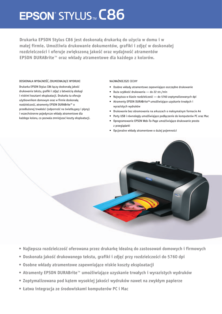 Drukarka EPSON Stylus C86 jest doskonałą drukarką do użycia w domu i w małej firmie. Umożliwia drukowanie dokumentów, grafiki i zdjęć w doskonałej rozdzielczości i oferuje zwiększoną jakość oraz wydajność atramentów EPSON DURABrite™ oraz wkłady atramentowe dla każdego z kolorów. DOSKONAŁA WYDAJNOŚĆ, ZDUMIEWAJĄCE WYDRUKI NAJWAŻNIEJSZE CECHY Drukarka EPSON Stylus C86 łączy doskonałą jakość drukowania tekstu, grafiki i zdjęć z łatwością obsługi i niskimi kosztami eksploatacji. Drukarka ta oferuje użytkownikom domowym oraz w firmie doskonałą rozdzielczość, atramenty EPSON DURABrite™ o przedłużonej trwałości (odporność na światło,gazy i płyny) i wszechstronne pojedyncze wkłady atramentowe dla każdego koloru, co pozwala zmniejszać koszty eksploatacji. • Osobne wkłady atramentowe zapewniające oszczędne drukowanie • Duża szybkość drukowania — do 22 str./min • Najwyższa w klasie rozdzielczość — do 5760 zoptymalizowanych dpi • Atramenty EPSON DURABrite™ umożliwiające uzyskanie trwałych i wyrazistych wydruków • Drukowanie bez obramowania na arkuszach o maksymalnym formacie A4 • Porty USB i równoległy umożliwiające podłączenie do komputerów PC oraz Mac • Oprogramowanie EPSON Web-To-Page umożliwiające drukowanie prosto z przeglądarki • Opcjonalne wkłady atramentowe o dużej pojemności • Najlepsza rozdzielczość oferowana przez drukarkę idealną do zastosowań domowych i firmowych • Doskonała jakość drukowanego tekstu, grafiki i zdjęć przy rozdzielczości do 5760 dpi • Osobne wkłady atramentowe zapewniające niskie koszty eksploatacji • Atramenty EPSON DURABrite™ umożliwiające uzyskanie trwałych i wyrazistych wydruków • Zoptymalizowana pod kątem wysokiej jakości wydruków nawet na zwykłym papierze • Łatwa integracja ze środowiskami komputerów PC i Mac 302.3mm 460.2mm 437.4mm 'DQHWHFKQLF]QH 02'(/ &+$5$.7(5<67<.$ 7(&+12/2*,$ .,(581(.'58.2:$1,$ 32=,20+$ı$68 32%Ä502&< 52='=,(/&=2Ŋ÷ 6=<%.2Ŋ÷ 0,1,0$/1<52=0,$5.523/, 67(52:1,. ,17(5)(-6< %8)25:(-Ŋ&,2:< 32'$:$1,(3$3,(58 32-(012Ŋ÷:<-Ŋ&,2:(- 7$&<3$3,(58 )250$73$3,(58 *5$0$785$3$3,(58 *58%2Ŋ÷3$3,(58 6=<%.2Ŋ÷'58.2:$1,$ &]DUQ\WHNVWQDVWURQLH$ .RORURZ\WHNVWQDVWURQLH$ 7HNVWLNRORURZDJUDILND =GMĊFLHURZHUX 2%6=$5'58.8 :<0,$5< 3RGF]DVGUXNRZDQLD:[6[* 3RGF]DVSU]HFKRZ\ZDQLD6[*[: &,ĉū$5 :.ı$'<$75$0(172:( &]DUQ\ &\MDQ 0DJHQWD ūäIJW\ 2352*5$02:$1,( *:$5$1&-$ 6<67(023(5$&<-1< :LQGRZV :LQGRZV :LQGRZV0H :LQGRZV :LQGRZV;3 0DF26 0DF26 (36216W\OXV& NRORURZDGUXNDUNDRZ\VRNLHMMDNRŋFL]DGUXNX (36210LFUR3LH]R*IJRZLFDF]DUQHJRDWUDPHQWXG\V]*IJRZLFDNRORURZ\FK DWUDPHQWäZG\V]G\V]QDNDŬG\NRORUF\MDQPDJHQWDŬäIJW\ *1 Czarny tekst *2 Kolorowy tekst *3 Kolorowy *4 Zdjęcie roweru GZXNLHUXQNRZ\]Z\V]XNLZDQLHPORJLF]Q\P na stronie A4 na stronie A4 tekst i grafika RNRIJRG%$]JRGQLH]QRUPö,62 Uwaga dotycząca szybkości drukowania: szybkości drukowania RNRIJR:SRGF]DVGUXNRZDQLD]JRGQHJR]QRUPö,62RNRIJR:WU\ELH mogą być różne w zależności od warunków drukowania. XŋSLHQLD:ZWU\ELHZ\IJöF]HQLD GR]RSW\PDOL]RZDQ\FKGSLSU]\XŬ\FLXWHFKQRORJLL5305HVROXWLRQ 3HUIRUPDQFH0DQDJHPHQW GRVWUPLQZF]DUQRELDIJ\PWU\ELHHNRQRPLF]Q\PGRVWUPLQZNRORURZ\PWU\ELH HNRQRPLF]Q\PVHNXQG\]GMĊFLH[FDOL SO :LQGRZV:LQGRZV:LQGRZV0H:LQGRZV17:LQGRZV:LQGRZV;30DF260DF26 86%UäZQROHJIJ\ .% DUNXV]\]Z\NIJHJRSDSLHUX$JPDUNXV]\SDSLHUX3UHPLXP,QN-HW3ODLQ3DSHUDUNXV]\SDSLHUX%ULJKW:KLWH,QN-HW 3DSHUDUNXV]\SDSLHUX3KRWR4XDOLW\,QN-HW3DSHUDUNXV]\SDSLHUX3KRWR3DSHUDUNXV]\SDSLHUX'85$%ULWH3KRWR3DSHU DUNXV]\SDSLHUX0DWWH3DSHU+HDY\ZHLJKWDUNXV]PDWRZHJRSDSLHUX'RXEOH6LGHG0DWWH3DSHUDUNXV]\SDSLHUX$UFKLYDO0DWWH 3DSHUDUNXV]\IROLL,QN-HW7UDQVSDUHQFLHVNRSHUW DUNXV]\]Z\NIJ\SDSLHUWU\EWHNVWRZ\ $%$/HWWHU/HJDO.RSHUW\1U'/& RGJP GRJP 0DNV\PDOQLHJP QDRU\JLQDOQ\PSDSLHU]HILUP\(3621 PPಥPP VWUPLQMDNRŋøURERF]D VWUPLQMDNRŋøURERF]D VWUPLQMDNRŋøURERF]D VHNXQG\VHNXQG\MDNRŋøIRWRJUDILF]QDVHNXQGVHNXQGMDNRŋøIRWRJUDILF]QDQDMOHSV]D%H]REUDPRZDQLD %H]REUDPRZDQLDGRIRUPDWX$ PP[PP[PP PP[PP[PP NJZUD]]SRGSäUNöSDSLHUXLNDEOHP]DVLODMöF\PEH]ZNIJDGäZDWUDPHQWRZ\FK 7ZNIJDGRVWDQGDUGRZHM SRMHPQRŋFLZ]HVWDZLH 7ZNIJDGRVWDQGDUGRZHM SRMHPQRŋFLZ]HVWDZLH 7ZNIJDGRVWDQGDUGRZHM SRMHPQRŋFLZ]HVWDZLH 7ZNIJDGRVWDQGDUGRZHM SRMHPQRŋFLZ]HVWDZLH 7RSFMRQDOQ\RGXŬHMSRMHPQRŋFL 7RSFMRQDOQ\RGXŬHMSRMHPQRŋFL 7RSFMRQDOQ\RGXŬHMSRMHPQRŋFL 7RSFMRQDOQ\RGXŬHMSRMHPQRŋFL (36213KRWR4XLFNHU(3621:HE7R3ULQW VWDQGDUGRZRURN :<0$*$1,$0,1,0$/1( 3URFHVRU 3DPLĊø5$0 0LHMVFHQDG\VNXWZDUG\P 3HQWLXP0+] 0% 0% 3HQWLXP0+] 0% 0% 3HQWLXP0+] 0% 0% 3HQWLXP0+] 0% 0% 3HQWLXP0+] 0% 0% 3RZHU3&*0+] 0% 0% 3RZHU3&*0+] 0% 0% StylusC86 – 1PL – 07/04 7\ONRSURJUDP0LFURVRIW,QWHUQHW([SORUHUGODV\VWHPX0LFURVRIW:LQGRZV EPSON Deutschland GmbH Tel.: +48 22 / 455 7500 Fax: +48 22 / 455 7501 Infolinia: 0-0-800 4911299 (0,16 zł/min.) Przedstawicielstwo w Polsce ul. Bokserska 66 02-690 Warszawa www.epson.pl EPSON® jest zastrzeżonym znakiem towarowym firmy SEIKO EPSON® Corporation. Wszystkie inne nazwy produktów i firm użyte w niniejszym dokumencie podano tylko w celu identyfikacji; mogą one być znakami towarowymi lub zastrzeżonymi znakami towarowymi ich właścicieli. Wszystkie dane techniczne mogą ulec zmianie bez powiadomienia, wyłączając błędy i pominięcia. :<0$*$1,$=$/(&$1( 3URFHVRU 3DPLĊø5$0 3HQWLXP0+] 0% 3HQWLXP0+] 0% 3HQWLXP0+] 0% 3HQWLXP0+] 0% 3HQWLXP0+] 0% 3RZHU3&*0+] 0% 3RZHU3&*0+] 0% 0LHMVFHQDG\VNXWZDUG\P 0% 0% 0% 0% 0% 0% 0%
