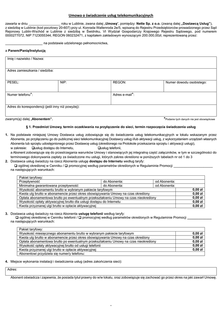 Umowa o świadczenie usług telekomunikacyjnych zawarta w dniu _________________ roku w Lublinie, zwana dalej „Umową”, pomiędzy: Nette Sp. z o.o. (zwaną dalej „Dostawcą Usług”), z siedzibą w Lublinie (kod pocztowy 20-607) przy ul. Konrada Wallenroda 2e/5, wpisaną do Rejestru Przedsiębiorców prowadzonego przez Sąd Rejonowy Lublin-Wschód w Lublinie z siedzibą w Świdniku, VI Wydział Gospodarczy Krajowego Rejestru Sądowego, pod numerem 0000277072, NIP 7123055344, REGON 060232471, z kapitałem zakładowym wynoszącym 200.000,00zł, reprezentowaną przez: ____________________ na podstawie udzielonego pełnomocnictwa, a Panem/Panią/Instytucją Imię i nazwisko / Nazwa: Adres zamieszkania / siedziba: PESEL: NIP: REGON: Numer telefonu*: Numer dowodu osobistego: Adres e-mail*: Adres do korespondencji (jeśli inny niż powyżej): zwanym(ą) dalej „Abonentem”. *Podanie tych danych nie jest obowiązkowe § 1. Przedmiot Umowy, termin oczekiwania na przyłączenie do sieci, termin rozpoczęcia świadczenia usług 1. Na podstawie niniejszej Umowy Dostawca usług zobowiązuje się do świadczenia usług telekomunikacyjnych w lokalu wskazanym przez Abonenta, po przyłączeniu go do publicznej sieci telekomunikacyjnej Dostawcy usług i/lub aktywacji usług, z wykorzystaniem urządzeń własnych Abonenta lub sprzętu udostępnionego przez Dostawcę usług (określonego na Protokole przekazania sprzętu i aktywacji usługi), w zakresie: usług dostępu do Internetu, usług telefonii, a Abonent zobowiązuje się do przestrzegania warunków Umowy i stanowiących jej integralną część załączników, w tym w szczególności do terminowego dokonywania zapłaty za świadczone mu usługi, których zakres określono w poniższych tabelach nr od 1 do 3 2. Dostawca usług świadczy na rzecz Abonenta usługę dostępu do Internetu według taryfy: ogólnej określonej w Cenniku / promocyjnej według parametrów określonych w Regulaminie Promocji _____________________ na następujących warunkach: Pakiet taryfowy: Przepływność do Abonenta: od Abonenta: Minimalna gwarantowana przepływność do Abonenta: od Abonenta: Wysokość abonamentu brutto w wybranym pakiecie taryfowym Kwota ulg brutto w abonamencie przez okres obowiązywania Umowy na czas określony Opłata abonamentowa brutto po ewentualnym przekształceniu Umowy na czas nieokreślony Wysokość opłaty aktywacyjnej brutto dla usługi dostępu do Internetu Kwota przyznanej ulgi brutto w opłacie aktywacyjnej 0,00 zł 0,00 zł 0,00 zł 0,00 zł 0,00 zł 3. Dostawca usług świadczy na rzecz Abonenta usługę telefonii według taryfy: ogólnej określonej w Cenniku telefonii / promocyjnej według parametrów określonych w Regulaminie Promocji _____________ na następujących warunkach: Pakiet taryfowy: Wysokość miesięcznego abonamentu brutto w wybranym pakiecie taryfowym Kwota ulg brutto w abonamencie przez okres obowiązywania Umowy na czas określony Opłata abonamentowa brutto po ewentualnym przekształceniu Umowy na czas nieokreślony Wysokość opłaty aktywacyjnej brutto od usługi telefonii Kwota przyznanej ulgi brutto w opłacie aktywacyjnej Abonentowi przydziela się numer/y telefonu: 0,00 zł 0,00 zł 0,00 zł 0,00 zł 0,00 zł 4. Miejsce wykonania instalacji i świadczenia usług (adres zakończenia sieci): Adres: Abonent oświadcza i zapewnia, że posiada tytuł prawny do w/w lokalu, oraz zobowiązuje się zachować go przez okres na jaki zawarł Umowę. „ 5. Wykonanie instalacji i podłączenie Abonenta do sieci Dostawcy usług nastąpi nie później niż w ciągu 14 (czternastu) dni roboczych od podpisania niniejszej Umowy, w terminie wspólnie uzgodnionym przez strony Umowy. Rozpoczęcie świadczenia usług (Aktywacja) nastąpi nie później niż w ciągu 7 (siedmiu) dni od wykonania przyłączenia do sieci Dostawcy usług, a jeśli Abonent ma już wybudowane Zakończenie Sieci, wtedy w ciągu 7 dni od podpisania niniejszej Umowy, chyba że Abonent wnosi o późniejszy termin rozpoczęcia świadczenia usług. Rozpoczęcie świadczenia usług nastąpi w nieprzekraczalnym terminie do dnia . 6. W przypadku umów zawieranych na odległość lub poza lokalem przedsiębiorstwa Dostawca usług rozpocznie świadczenie usług w terminie podanym powyżej, lecz nie wcześniej niż 15 dnia od daty zawarcia umowy, chyba że Abonent wniesie o rozpoczęcie świadczenia usług przed upływem terminu do odstąpienia od umowy. Wysokość opłaty instalacyjnej brutto Kwota przyznanej ulgi brutto w opłacie instalacyjnej 0,00 zł 0,00 zł Opłata instalacyjna pobierana jest wyłącznie w przypadku wykonania instalacji w lokalu Abonenta, niezbędnej do przyłączenia go do sieci telekomunikacyjnej Dostawcy usług i rozpoczęcia świadczenia mu usług. Opłaty aktywacyjne pobierane są od aktywacji każdej z usług, lub w sytuacji dokonania zmiany pakietu taryfowego wedle którego świadczona/e będzie/ą usługa/i. Odrębny Regulamin promocji może przewidywać, że opłaty aktywacyjne zawarte są w opłacie instalacyjnej. 7. Łączna kwota ulg brutto przyznana w ramach niniejszej umowy: 0,00 zł. Wysokość przyznanych ulg stanowi różnicę w wysokości opłat określonych dla umowy zawieranej na czas nieokreślony a wysokością opłat stosowanych w przypadku zawarcia umowy na czas określony na warunkach promocyjnych. 8. Abonentowi przydziela się następujący indywidualny numer identyfikacyjny (ID) oraz numer PIN, który będzie służył do identyfikacji Abonenta, w tym do zalogowania się w Wirtualnym Biurze Obsługi Klienta (WBOK). Numery te podane są w tabelce pod koniec umowy. 9. Abonent może uiszczać opłaty za usługi objęte niniejszą Umową gotówką w siedzibie Dostawcy usług lub przelewem bankowym na indywidualny numer konta bankowego podany w tabelce pod koniec umowy. § 2. Elementy składające się na opłatę abonamentową Z tytułu świadczonych usług Abonent zobowiązuje się do terminowego uiszczania 