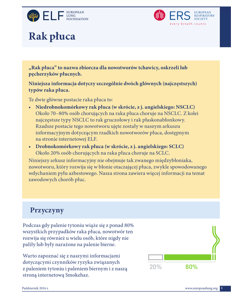 Rak płuca „Rak płuca” to nazwa zbiorcza dla nowotworów tchawicy, oskrzeli lub pęcherzyków płucnych. Niniejsza informacja dotyczy szczególnie dwóch głównych (najczęstszych) typów raka płuca. Te dwie główne postacie raka płuca to: • Niedrobnokomórkowy rak płuca (w skrócie, z j. angielskiego: NSCLC) Około 70–80% osób chorujących na raka płuca choruje na NSCLC. Z kolei najczęstsze typy NSCLC to rak gruczołowy i rak płaskonabłonkowy. Rzadsze postacie tego nowotworu ujęte zostały w naszym arkuszu informacyjnym dotyczącym rzadkich nowotworów płuca, dostępnym na stronie internetowej ELF. • Drobnokomórkowy rak płuca (w skrócie, z j. angielskiego: SCLC) Około 20% osób chorujących na raka płuca choruje na SCLC. Niniejszy arkusz informacyjny nie obejmuje tak zwanego międzybłoniaka, nowotworu, który rozwija się w błonie otaczającej płuca, zwykle spowodowanego wdychaniem pyłu azbestowego. Nasza strona zawiera więcej informacji na temat zawodowych chorób płuc. Przyczyny Podczas gdy palenie tytoniu wiąże się z ponad 80% wszystkich przypadków raka płuca, nowotwór ten rozwija się również u wielu osób, które nigdy nie paliły lub były narażone na palenie bierne. Warto zapoznać się z naszymi informacjami dotyczącymi czynników ryzyka związanych z paleniem tytoniu i paleniem biernym i z naszą stroną internetową Smokehaz. Październik 2016 r. 20% 80% www.europeanlung.org 1 Rak płuca Inne przyczyny obejmują ekspozycję na: • Zanieczyszczone powietrze (w tym spaliny z silników Diesla) • Czynniki szkodliwe w miejscu pracy (azbest, pył drzewny, opary spawalnicze, arsen, metale przemysłowe – np. beryl i chrom) • Skażenia powietrza w pomieszczeniach zamkniętych (radon, dym ze spalania węgla) Mogą istnieć także inne przyczyny i prawdopodobnie więcej tych przyczyn zostanie odkrytych w przyszłości. Podwyższone ryzyko rozwoju raka płuca dotyczy także osób obciążonych następującymi schorzeniami: • Przewlekłą obturacyjną chorobą płuc (POChP) • Włóknieniem płuc • Nowotworami głowy i szyi lub rakiem przełyku • Chłoniakami lub rakiem piersi (leczonymi napromienianiem obszaru klatki piersiowej) W przypadku niektórych rodzajów raka płuca pewną rolę mogą odgrywać geny. Osoby, których krewni chorowali na raka płuca, mogą być obciążone wyższym ryzykiem rozwoju tego nowotworu, ale ryzyko to nie jest jednakowe dla wszystkich. Objawy Najczęstsze dolegliwości i objawy związane z rakiem płuca to: • Przewlekły kaszel (utrzymujący się powyżej 3 tygodni) • Odkrztuszanie krwi lub pasemek krwi w plwocinie • Chudnięcie bez powodu • Duszność bez powodu • Brak uczucia głodu • Zmęczenie • Ból w klatce piersiowej 2 www.europeanlung.org Październik 2016 r. Rak płuca • Ból kości • Ból barku • Spuchnięcie szyi • Osłabienie mięśni • Chrypka (słaby, chropowaty głos lub głos wydobywany z trudem) • Świst oddechowy (wysoki piszczący dźwięk z powodu blokady dróg oddechowych) • Tak zwane palce pałeczkowate – obrzmienie palców rąk i stóp. Wczesne objawy często nie są wychwytywane, ponieważ mogą się one wiązać z innymi częstymi schorzeniami. U niektórych osób nie występują żadne objawy. Im wcześniej rak płuca zostanie rozpoznany, tym łatwiej go leczyć. W przypadku jakichkolwiek obaw należy się zgłosić do lekarza, co dotyczy zwłaszcza osób o podwyższonym ryzyku zachorowania – patrz punkt „Przyczyny”. Rozpoznanie „Osoba, której lekarz powie, że ma raka płuca, najprawdopodobniej nie będzie umiała przyjąć żadnych dalszych informacji. Podczas takiej wizyty dobrze mieć ze sobą opiekuna lub inną osobę towarzyszącą, która będzie „uszami” pacjenta.” Dan, Irlandia, opiekun Na ogół proces rozpoznania raka płuca przebiega następująco: Najpierw wykonywane jest zdjęcie radiologiczne lub tomografia komputerowa (TK) klatki piersiowej (podczas której ciało jest prześwietlane pod różnymi kątami, po czym komputer składa otrzymane dane w szczegółowy obraz), aby stwierdzić, czy u pacjenta pojawił się guz płuca. Lekarz może potwierdzić rozpoznanie raka pobierając i badając próbki komórek z guza lub z węzłów chłonnych, lub z guza wtórnego, znajdującego się w innym miejscu niż pierwotny guz płuca (przerzutu). Procedura ta nosi nazwę biopsji. Październik 2016 r. www.europeanlung.org 3 Rak płuca Biopsję można wykonać kilkoma sposobami, w większości przypadków w warunkach ambulatoryjnych (nie trzeba zostać w szpitalu): • Za pomocą kamery endoskopowej (kamery wprowadzanej do płuc), czyli tak zwanej bronchoskopii. W technice tej wykorzystuje się giętki przewód, który na końcu wyposażony jest w kamerę video (czyli tak zwany bronchoskop). Przewód ten wprowadza się przez nos lub usta. Pacjentowi podaje się lek uspokajający w celu rozluźnienia oraz spray znieczulający gardło. Więcej informacji znajduje się w arkuszu danych dotyczącym bronchoskopii na naszej stronie internetowej. • Za pomocą ultrasonografii wewnątrzoskrzelowej (w skrócie, z j. angielskiego: EBUS) – jest to metoda podobna do bronchoskopii. Bronchoskop wyposażony jest w małą sondę ultradźwiękową, która naprowadza lekarza na obszar, z którego należy pobrać próbkę. Zwykle jest to obszar znajdujący się między płucami, gdzie znajdują się węzły chłonne (noszący nazwę śródpiersia). • Biopsja pod kontrolą tomografii komputerowej (pacjent przemieszcza się w tomografie komputerowym, a otrzymane obrazy radiologiczne naprowadzają lekarza na odpowiedni obszar). • Za pomocą zabiegu chirurgicznego (tylko w rzadkich przypadkach). Ocena stopnia zaawansowania raka płuca Jeżeli lekarz rozpozna u danej osoby raka płuca, zleci on pewne testy, które mogą pokazać, jak bardzo rak się rozprzestrzenił. Ten proces nosi nazwę ustalania stopnia zaawansowania i może obejmować kol