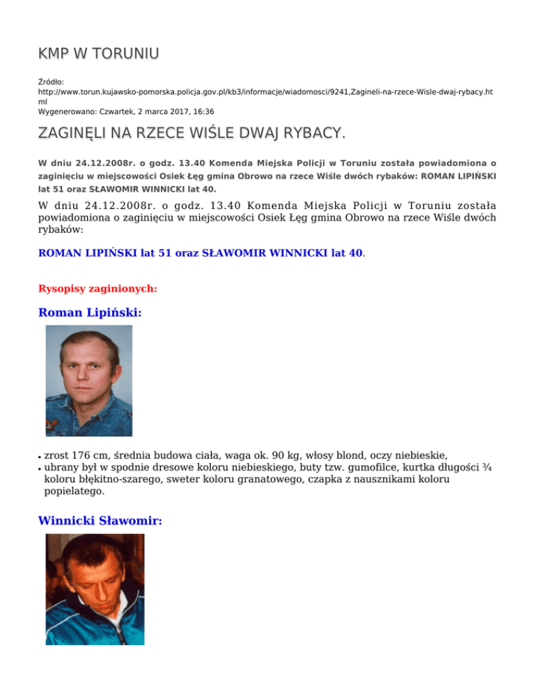 KMP W TORUNIU Źródło: http://www.torun.kujawsko-pomorska.policja.gov.pl/kb3/informacje/wiadomosci/9241,Zagineli-na-rzece-Wisle-dwaj-rybacy.ht ml Wygenerowano: Czwartek, 2 marca 2017, 16:36 ZAGINĘLI NA RZECE WIŚLE DWAJ RYBACY. W dniu 24.12.2008r. o godz. 13.40 Komenda Miejska Policji w Toruniu została powiadomiona o zaginięciu w miejscowości Osiek Łęg gmina Obrowo na rzece Wiśle dwóch rybaków: ROMAN LIPIŃSKI lat 51 oraz SŁAWOMIR WINNICKI lat 40. W dniu 24.12.2008r. o godz. 13.40 Komenda Miejska Policji w Toruniu została powiadomiona o zaginięciu w miejscowości Osiek Łęg gmina Obrowo na rzece Wiśle dwóch rybaków: ROMAN LIPIŃSKI lat 51 oraz SŁAWOMIR WINNICKI lat 40. Rysopisy zaginionych: Roman Lipiński: ● ● zrost 176 cm, średnia budowa ciała, waga ok. 90 kg, włosy blond, oczy niebieskie, ubrany był w spodnie dresowe koloru niebieskiego, buty tzw. gumofilce, kurtka długości ¾ koloru błękitno-szarego, sweter koloru granatowego, czapka z nausznikami koloru popielatego. Winnicki Sławomir: ● ● wzrost 175 cm, szczupłej budowy ciała, waga ok. 75 kg, włosy ciemne, krótkie proste, oczy niebieskie, ubrany był w spodnie dresowe koloru ciemnego (czarne lub granatowe) z białymi pasami, buty gumofilce, kurtkę ciemną koloru brązowo-granatowego, czapkę wełnianą koloru ciemnego. Wyżej wymienieni w dniu 23.12.2008r około godz. 16.00 wypłynęli łodzią na rzekę Wisłę w celu połowu ryb i do dnia dzisiejszego nie nawiązali kontaktu z rodziną. Prowadzone przez Policję szeroko zakrojone działania poszukiwawcze w rejonie rzeki Wisły i jej nabrzeży nie doprowadziły do odnalezienia zaginionych mężczyzn. W dniu 25.12.2008r. o godz. 10.50 na rzece Wiśle na wysokości miejscowości Silno odnaleziona została wywrócona łódź należąca do jednego z zaginionych. Osoby mogące udzielić jakichkolwiek informacji, które mogą przyczynić się do odnalezienia zaginionych osób proszone są o kontakt osobisty lub telefoniczny z Sekcją Kryminalną Komendy Miejskiej Policji w Toruniu tel. 056-641-2395, 056-641-2399 lub 056-641-2401 lub z numerem „997”. nadkom. Wioletta Dąbrowska KMP Toruń Oficer Prasowy Autor: torun Publikacja: torun Ocena: 0/5 (0) Tweetnij