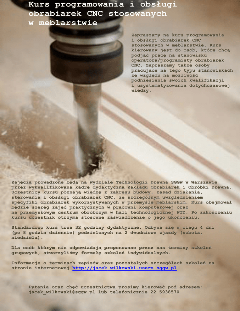 Kurs programowania i obsługi obrabiarek CNC stosowanych w meblarstwie Zapraszamy na kurs programowania i obsługi obrabiarek CNC stosowanych w meblarstwie. Kurs kierowany jest do osób, które chcą podjąć pracę na stanowisku operatora/programisty obrabiarek CNC. Zapraszamy także osoby pracujące na tego typu stanowiskach ze względu na możliwość podniesienia swoich kwalifikacji i usystematyzowania dotychczasowej wiedzy. Zajęcia prowadzone będą na Wydziale Technologii Drewna SGGW w Warszawie przez wykwalifikowaną kadrę dydaktyczną Zakładu Obrabiarek i Obróbki Drewna. Uczestnicy kursu poznają wiedzę z zakresu budowy, zasad działania, sterowania i obsługi obrabiarek CNC, ze szczególnym uwzględnieniem specyfiki obrabiarek wykorzystywanych w przemyśle meblarskim. Kurs obejmował będzie szereg zajęć praktycznych w pracowni komputerowej oraz na przemysłowym centrum obróbczym w hali technologicznej WTD. Po zakończeniu kursu uczestnik otrzyma stosowne zaświadczenie o jego ukończeniu. Standardowo kurs trwa 32 godziny dydaktyczne. Odbywa się w ciągu 4 dni (po 8 godzin dziennie) podzielonych na 2 dwudniowe zjazdy (sobota, niedziela). Dla osób którym nie odpowiadają proponowane przez nas terminy szkoleń grupowych, stworzyliśmy formułę szkoleń indywidualnych. Informacje o terminach zapisów oraz pozostałych szczegółach szkoleń na stronie internetowej http://jacek_wilkowski.users.sggw.pl Pytania oraz chęć uczestnictwa prosimy kierować pod adresem: [email protected] lub telefonicznie 22 5938570