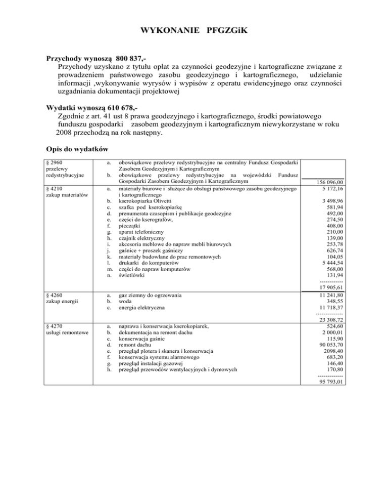 WYKONANIE PFGZGiK Przychody wynoszą 800 837,Przychody uzyskano z tytułu opłat za czynności geodezyjne i kartograficzne związane z prowadzeniem państwowego zasobu geodezyjnego i kartograficznego, udzielanie informacji ,wykonywanie wyrysów i wypisów z operatu ewidencyjnego oraz czynności uzgadniania dokumentacji projektowej Wydatki wynoszą 610 678,Zgodnie z art. 41 ust 8 prawa geodezyjnego i kartograficznego, środki powiatowego funduszu gospodarki zasobem geodezyjnym i kartograficznym niewykorzystane w roku 2008 przechodzą na rok następny. Opis do wydatków § 2960 przelewy redystrybucyjne § 4210 zakup materiałów a. obowiązkowe przelewy redystrybucyjne na centralny Fundusz Gospodarki Zasobem Geodezyjnym i Kartograficznym b. obowiązkowe przelewy redystrybucyjne na wojewódzki Fundusz Gospodarki Zasobem Geodezyjnym i Kartograficznym a. materiały biurowe i słuŜące do obsługi państwowego zasobu geodezyjnego i kartograficznego b. kserokopiarka Olivetti c. szafka pod kserokopiarkę d. prenumerata czasopism i publikacje geodezyjne e. części do kserografów, f. pieczątki g. aparat telefoniczny h. czajnik elektryczny i. akcesoria meblowe do napraw mebli biurowych j. gaśnice + proszek gaśniczy k. materiały budowlane do prac remontowych l. drukarki do komputerów m. części do napraw komputerów n. świetlówki § 4260 zakup energii a. b. c. gaz ziemny do ogrzewania woda energia elektryczna § 4270 usługi remontowe a. b. c. d. e. f. g. h. naprawa i konserwacja kserokopiarek, dokumentacja na remont dachu konserwacja gaśnic remont dachu przegląd plotera i skanera i konserwacja konserwacja systemu alarmowego przegląd instalacji gazowej przegląd przewodów wentylacyjnych i dymowych 156 096,00 5 172,16 3 498,96 581,94 492,00 274,50 408,00 210,00 139,00 253,78 626,74 104,05 5 444,54 568,00 131,94 -----------17 905,61 11 241,80 348,55 11 718,37 -------------23 308,72 524,60 2 000,01 115,90 90 053,70 2098,40 683,20 146,40 170,80 ------------95 793,01 § 4300 zakup usług pozostałych b. c. d. e. f. g. h. i. j. wykonanie numerycznej mapy sieci uzbrojenia terenu dla miast Chojnice, Brusy, Czersk modernizacja ewidencji gruntów i budynków gmina Czersk ogłoszenia prasowe kanalizacja przegląd budowlany dojazdy serwisu plotera i scanera wymiana listwy w kserografie usługi hotelowe związane z pobytem na szkoleniach przesyłki kurierskie wywóz śmieci a. opłaty za przyłącze internetowe 2 989,73 b. szkolenie pracowników 5 289,00 § 4740 zakup materiałów papierniczych do sprzętu drukarskiego i kserograficzn. a. b. folie i papiery do ploterów papiery do kserografów § 4750 zakup akcesorii komputerowych w tym programów i licencji a. b. c. d. e. f. program komputerowy C-Geo ruter do serwera program antywirusowy atramenty do plotera tonery, tusze do drukarek, dyskietki i płyty CD części komputerowe § 6120 wydatki inwestycyjne funduszy celowych a. b. c. sprzęt komputerowy kserokopiarka GESTETNER zestawy komputerowe § 4350 opłata za internet § 4700 szkolenia a. Ogółem wydatki 158 024,16 58 844,00 1 921,74 702,97 305,00 658,80 61,00 1 530,00 48,64 1 560,16 -------------223 656,47 832,65 6 133,59 ------------6 966,24 3 080,50 498,00 1 122,40 1 077,80 17 162,70 1726,80 ------------24 688,20 24 469,54 7 320,00 22 215,29 -----------------54 004,83 610 677,81