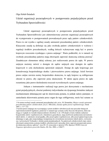 Olga Hołub-Śniadach Udział organizacji pozarządowych w postępowaniu prejudycjalnym przed Trybunałem Sprawiedliwości Udział organizacji pozarządowych w postępowaniu prejudycjalnym przed Trybunałem Sprawiedliwości jest zdeterminowany prawem organizacji pozarządowych do występowania w postępowaniach prowadzonych przez sądy państw członkowskich. Prawo to zaś wynika z ogólnej zasady autonomii proceduralnej państw członkowskich. Klasycznie zasadę tą definiuje się jako swobodę państw członkowskich w wyborze i regulacji środków proceduralnych, według których wykonywane mają być w prawie krajowym roszczenia wynikające z prawa unijnego1. Warto podkreślić, że w ramach tej swobody proceduralnej państwa mają obowiązek zapewnić skuteczną ochronę prawną2. Zasadniczym elementem takiej ochrony jest realizowanie prawa do sądu. W prawie unijnym możemy mówić o dostępie do sądów unijnych oraz dostępie do sądów krajowych w celu dochodzenia uprawnień unijnych. Dostęp do sądu krajowego jest konsekwencją bezpośredniego skutku i pierwszeństwa prawa unijnego. Jeżeli bowiem prawo unijne zawiera normy bezpośrednio skuteczne, to sądy krajowe są zobligowane chronić to prawo, aby zapewnić jemu skuteczność. W takim ujęciu prawo do sądu rozumiemy jako prawo dochodzenia roszczeń wywodzonych z prawa unijnego. Jednym z instrumentów realizacji tego prawa jest skorzystanie z mechanizmu pytań prejudycjalnych, chociaż podmioty indywidualne nie dysponują formalnie żadnymi mechanizmami skłaniającymi sąd do skierowania pytania, to jednak należy pamiętać, iż zaniechania skierowania pytania przez organ do tego zobligowany, może być uznane za 1 Na temat ewolucji zasady autonomii proceduralnej zob. m.in.: M. Domańska, Miejsce zasady autonomii proceduralnej państw członkowskich, [w:] C. Mik (red.), Zasady ogólne prawa wspólnotowego, Toruń 2007, s. 117–122. 2 System prawa unijnego ma wyczerpujący system środków odwoławczych oraz procedur służących zapewnieniu kontroli legalności, ponieważ w ramach tego systemu osoby fizyczne lub prawne, które nie mogą ze względu na warunki dopuszczalności określone w art. 230 akapit czwarty traktatu zaskarżyć bezpośrednio aktów wspólnotowych o charakterze generalnym, mają możliwość podniesienia nieważności takich aktów, w zależności od przypadku, albo przed sądem wspólnotowym, albo przed sądami krajowymi, skłaniając te sądy, jako nieposiadające kompetencji do stwierdzenia nieważności takich aktów, zwrócenia się z tą kwestią do Trybunału w drodze pytań prejudycjalnych. Na państwach członkowskich ciąży zatem obowiązek ustanowienia systemu środków odwoławczych i procedur, który zapewni poszanowanie prawa do skutecznej ochrony sądowej”, teza 40 i 41 orzeczenia w sprawie UPA, Sprawa C50/00 Union de Pequenos Agricultores przeciwko Radzie, Zb. Orz. 2002, s. I-06677. 1 naruszenia prawa do sądu3. Według obowiązujących standardów sądy krajowe, wypełniając swój obowiązek skierowania pytania do TSUE, realizują postulat efektywnej ochrony prawnej. Prawo dostępu do sądu krajowego należy zagwarantować różnym podmiotom, w tym organizacjom pozarządowym, nawet jeśli miałoby to naruszyć przyjęte w danym państwie rozumienie interesu prawnego. Taka ingerencja w wewnętrzny system proceduralny okazuje się konieczna, w szczególności, jeżeli uprawnienia dla beneficjentów prawa unijnego wywodzone są z prawa wtórnego, w tym z ogólnie określonych celów dyrektywy. Postuluje się, aby określenie beneficjenta uprawnienia unijnego dokonywało się w zgodzie z prawem UE, nawet z wykluczeniem doktryny krajowej4. Ten postulat jest realizowany w sprawach z zakresu ochrony środowiska, w których to Trybunał Sprawiedliwości w ramach skierowanych do niego pytań prejudycjalnych dokonywał oceny, czy pewne organizacje społeczne powinny mieć prawo występowania przed sądami krajowymi, uznając za źródło takiej legitymacji prawo unijne, a nie prawo krajowe. Dyrektywa 2003/35, której przyjęcie było konsekwencją ratyfikacji przez Wspólnotę Konwencji z Aarhus, nałożyła na państwa obowiązek zapewnienia dostępu do sądu w zakresie kontroli legalności decyzji, aktów lub zaniechań dotyczących udziału społeczeństwa w projektach oddziaływujących na środowisko5. Dyrektywa określa, iż dostęp do procedury sądowej przysługuje członkom zainteresowanej społeczności. mającym wystarczający interes lub podnoszącym naruszenia prawa, gdy procedury prawne państwa przewidują taki warunek. Jest to dokument, w którym legitymacja procesowa została rozszerzona na podmioty działające w celu ochrony interesu publicznego. Wspomniana powyżej Dyrektywa była kilkakrotnie przywoływana przez Trybunał, w sprawach wniesionych w ramach postępowania prejudycjalnego, w których to organizacje pozarządowe przed sądem krajowym spotkały się z problemem z dostępem 3 Por. N. Półtorak, Ochrona uprawnień wynikających z prawa Unii Europejskiej w postępowaniach krajowych, Warszawa 2010 [strona ?]. 4 Ibidem, s. 241. 5 Dyrektywa Parlamentu i Rady z dnia 26 maja 2003 r. przewidująca udział społeczeństwa w odniesieniu do sporządzenia niektórych planów i programów w zakresie środowiska ora zmieniająca w odniesieniu do udziału społeczeństwa i dostępu do wymiaru sprawiedliwości dyrektywy Rady 85/337 i 96/91/WE. Dz.Urz. UE L 156 z 15.06.2003. 2 do wymiaru sprawiedliwości. Pierwszą ze spraw, o której należy wspomnieć w tym kontekście, jest sprawa C 263/086, w której to stowarzyszenie ochrony środowiska, aby móc zrealizować swoje prawo do wystąpienia przed sądem krajowym, musiało wykazać, iż może być traktowane jako „zainteresowana społeczność”. Zgodnie z przyjętą w dyrektywie definicją „zainteresowana społeczność” oznacza społeczeństwo, które jest lub może być dotknięte skutkami, lub ma interes w proced