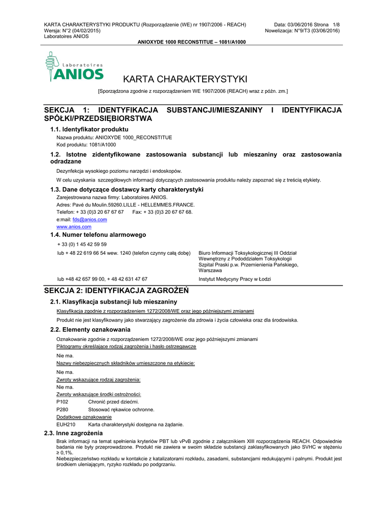 KARTA CHARAKTERYSTYKI PRODUKTU (Rozporządzenie (WE) nr 1907/2006 - REACH) Wersja: N°2 (04/02/2015) Laboratoires ANIOS ANIOXYDE 1000 RECONSTITUE – 1081/A1000 Data: 03/06/2016 Strona 1/8 Nowelizacja: N°9/T3 (03/06/2016) KARTA CHARAKTERYSTYKI [Sporządzona zgodnie z rozporządzeniem WE 1907/2006 (REACH) wraz z późn. zm.] SEKCJA 1: IDENTYFIKACJA SPÓŁKI/PRZEDSIĘBIORSTWA SUBSTANCJI/MIESZANINY I IDENTYFIKACJA 1.1. Identyfikator produktu Nazwa produktu: ANIOXYDE 1000_RECONSTITUE Kod produktu: 1081/A1000 1.2. Istotne zidentyfikowane zastosowania substancji lub mieszaniny oraz zastosowania odradzane Dezynfekcja wysokiego poziomu narzędzi i endoskopów. W celu uzyskania szczegółowych informacji dotyczących zastosowania produktu należy zapoznać się z treścią etykiety. 1.3. Dane dotyczące dostawcy karty charakterystyki Zarejestrowana nazwa firmy: Laboratoires ANIOS. Adres: Pavé du Moulin.59260.LILLE - HELLEMMES.FRANCE. Telefon: + 33 (0)3 20 67 67 67 Fax: + 33 (0)3 20 67 67 68. e:mail: [email protected] www.anios.com 1.4. Numer telefonu alarmowego + 33 (0) 1 45 42 59 59 lub + 48 22 619 66 54 wew. 1240 (telefon czynny całą dobę) Biuro Informacji Toksykologicznej III Oddział Wewnętrzny z Pododdziałem Toksykologii Szpital Praski p.w. Przemienienia Pańskiego, Warszawa lub +48 42 657 99 00, + 48 42 631 47 67 Instytut Medycyny Pracy w Łodzi SEKCJA 2: IDENTYFIKACJA ZAGROŻEŃ 2.1. Klasyfikacja substancji lub mieszaniny Klasyfikacja zgodnie z rozporządzeniem 1272/2008/WE oraz jego późniejszymi zmianami Produkt nie jest klasyfikowany jako stwarzający zagrożenie dla zdrowia i życia człowieka oraz dla środowiska. 2.2. Elementy oznakowania Oznakowanie zgodnie z rozporządzeniem 1272/2008/WE oraz jego późniejszymi zmianami Piktogramy określające rodzaj zagrożenia i hasło ostrzegawcze Nie ma. Nazwy niebezpiecznych składników umieszczone na etykiecie: Nie ma. Zwroty wskazujące rodzaj zagrożenia: Nie ma. Zwroty wskazujące środki ostrożności: P102 Chronić przed dziećmi. P280 Stosować rękawice ochronne. Dodatkowe oznakowanie EUH210 Karta charakterystyki dostępna na żądanie. 2.3. Inne zagrożenia Brak informacji na temat spełnienia kryteriów PBT lub vPvB zgodnie z załącznikiem XIII rozporządzenia REACH. Odpowiednie badania nie były przeprowadzone. Produkt nie zawiera w swoim składzie substancji zaklasyfikowanych jako SVHC w stężeniu ≥ 0,1%. Niebezpieczeństwo rozkładu w kontakcie z katalizatorami rozkładu, zasadami, substancjami redukującymi i palnymi. Produkt jest środkiem uleniającym, ryzyko rozkładu po podgrzaniu. KARTA CHARAKTERYSTYKI PRODUKTU (Rozporządzenie (WE) nr 1907/2006 - REACH) Wersja: N°2 (04/02/2015) Laboratoires ANIOS ANIOXYDE 1000 RECONSTITUE – 1081/A1000 Data: 03/06/2016 Strona 2/8 Nowelizacja: N°9/T3 (03/06/2016) SEKCJA 3: SKŁAD/INFORMACJA O SKŁADNIKACH 3.1. Substancje Nie dotyczy. 3.2. Mieszaniny Numery identyfikujące Numer indeksowy: 008-003-00-9 Numer CAS: 7722-84-1 Numer WE: 231-765-0 Numer REACH: 01-2119485845-22-XXXX klasyfikacja wg 1272/2008/WE Zakres stężeń Uwagi karpolaktam Ox. Liq. 1 H271 Acute Tox. 4 H302 Skin Corr. 1A H314 Acute Tox. 4 H332 STOT SE 3 H335 Aquatic Chronic 3 H412 Acute Tox. 4 H302 Skin Irrit. 2 H315 Eye Irrit. 2 H319 Acute Tox. 4 H332 STOT SE 3 H335 Numer indeksowy: 603-117-00-0 Numer CAS: 67-63-0 Numer WE: 200-661-7 Flam. Liq. 2 H225 Eye Irrit. 2 H319 STOT SE 3 H336 [1] 0 <= x % < 1 Flam. Liq. 3 H226 Org. Perox. D H242 Acute Tox. 4 H302 Acute Tox. 4 H312 Skin Corr. 1A H314 Acute Tox. 4 H332 Aquatic Acute 1 H400, M=1 [1] 0 <= x % < 1 nadltenek wodoru Numer indeksowy: 613-069-00-2 Numer CAS: 105-60-2 Numer WE: 203-313-2 Numer REACH: - 2,5 <= x % < 10 [1] 0 <= x % < 1 Numer REACH: 01-2119457558-25-XXXX propan-2-ol Numer indeksowy: 607-094-00-8 Numer CAS: 79-21-0 Numer WE: 201-186-8 Numer REACH: kwas nadoctowy [1] substancja z określoną na poziomie krajowym wartością najwyższego dopuszczalnego stężenia w środowisku pracy. Pełen tekst zwrotów H przytoczony został w sekcji 16 karty. SEKCJA 4: ŚRODKI PIERWSZEJ POMOCY W razie wątpliwości lub jeśli objawy się utrzymują, zawsze należy wezwać lekarza. NIGDY nie wywoływać wymiotów u nieprzytomnej osoby. 4.1. Opis środków pierwszej pomocy W wypadku narażenia na inhalację: Oddalić osobę od miejsca narażenia i przenieść ją na świeże powietrze. Zapewnić ciepło i spokój. W przypadku problemów z oddychaniem ułożyć poszkodowanego w pozycji półsiedzącej. Skontaktować się z lekarzem. W wypadku zanieczyszczenia oczu: Jeśli to możliwe, zdjąć soczewki kontaktowe. Wypłukać oczy dużą ilością czystej, miękkiej wody przez około 15 minut, trzymając jednocześnie powieki szeroko otwarte. Unikać silnego strumienia wody – ryzyko uszkodzenia rogówki. Skonsultować się z lekarzem okulistą w przypadku wystąpienia niepokojących objawów. Pokazać opakowanie lub etykietę. W wypadku zanieczyszczenia skóry: Zdjąć skażone lub zanieczyszczone ubranie. Nie używać powtórnie zanim nie zostanie oczyszczone. Zanieczyszczone miejsce natychmiast przepłukać dużą ilością wody. Skonsultować się z lekarzem w przypadku wystąpienia niepokojących objawów. Pokazać opakowanie lub etykietę. W wypadku połknięcia: Wypłukać usta wodą. Nie wywoływać wymiotów. Bezzwłocznie skontaktować się z lekarzem, pokazać opakowanie lub etykietę. Nigdy nie podawać niczego do ust osobie nieprzytomnej. 4.2. Najważniejsze ostre i opóźnione objawy oraz skutki narażenia Patrz sekcja 11 karty. 4.3. Wskazania dotyczące wszelkiej natychmiastowej pomocy lekarskiej i szczególnego postępowania z poszkodowanym Decyzję o sposobie postępowania ratunkowego podejmuje lekarz po dokładnej ocenie stanu poszkodowanego. KARTA CHARAKTERYSTYKI PRODUKTU (Rozporządzenie (WE) nr 1907/2006 - REACH) Wersja: N°2 (04/02/2015) Laboratoires ANIOS ANIOXYDE 1000 RECONSTITUE – 1081/A1000 Data: 03/06/2016 Strona 3/8 Nowelizacja: N°9/T3
