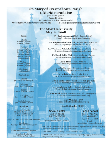 St. Mary of Czestochowa Parish Iskierki Parafialne 3010 South 48th Ct. Cicero, IL 60804 Tel. 708-652-0948 Fax. 708-652-0646 Website: www.stmaryofczestochowa.org E- Mail: [email protected] The Most Holy Trinity May 18, 2008 Masses: Saturday 8:00 AM (English) 5:00 PM (English) Sunday 7:30 AM (English) 9:00 AM (English) 10:30 AM (Polish) 12:30 PM (Spanish) 5:00 PM (Spanish) 7:00 PM (Polish) Weekdays 7:00 AM (English) 8:00 AM (English) First Fridays 7:00 PM (Polish) Confessions: Saturday 4:00 – 4:45 PM (Trilingual) Wednesday 7:00 – 8:00 PM (Spanish) Sunday 10:00 – 10:30 AM (Polish) First Friday 6:30 – 7:00 PM (Polish) Fr. Radek Jaszczuk CSsR - Pastor, Ext. 28 E-mail: [email protected] Fr. Zbigniew Pienkos CSsR - Associate Pastor, Ext. 26 E-mail: [email protected] Fr. Waldemar Wieladek CSsR - Associate Pastor, Ext. 27 E-mail: [email protected] Fr. Darek Pabis CSsR - Associate Pastor, Ext. 29 E-mail: [email protected] Alois Theis - School Principal E-mail: [email protected] Jessica Navarro - Receptionist, Ext. 20 E-mail: [email protected] Marisol Ortíz - Receptionist, Ext. 20 E-mail: [email protected] Witold Socha - Music Director, Tel. 708-430-8816 E-mail: [email protected] Sr. Magdalene Kabat - Bulletin Editor, Ext 31 E-mail: [email protected] Alice Krzak - Web Communications, Tel. 708-484-2640 E-Mail: [email protected] Fourth Saturday 7:00 – 8:00 PM (Polish) Mary Warchol - CCD E-mail: [email protected] Devotions: Sophie Schultz - SPRED Every Wednesday The entire day of adoration of the Blessed Sacrament 8:30 AM - 7:00 PM 7:00 PM Prayer Group-Adoration (Spanish) First Fridays 8:30-9:30 AM Holy Hour (English) First Saturdays 8:30-9:00 AM Adoration (English) Every Fourth Saturday 7:00 PM Prayer Vigil (Polish) Social Center Parish School 5000 W. 31st St. Tel. 708-652-7118 3001 S. 49th Ave. Tel. 708-656-5010 Fax 708-656-4043 E-mail: [email protected] E-mail: [email protected] SICK CALLS - In all cases of serious illness or accidents, a priest should be called at once. Holy Communion will be brought to the sick upon request. MARRIAGES - Should be arranged at least 6 months in advance. NEWCOMERS - All new families / individuals may register by stopping at the rectory or by calling the parish secretary ext. 20. Sunday Iskierki Parafialne 7:00 May 18, Sunday, Most Holy Trinity 7:30 †Lottie “Lee” Kirwin (Lucy Brinka) 9:00 Birthday blessings for Helen Cison (family) †Marie Zalesiak (Pearl Budzik) †Ann Michalski (1 yr. anniversary, Gert) End of the year SPRED MASS 10:30 O Boże bł. z okazji urodzin dla O. Zbigniewa Pieńkos †Stanisława Górnik (Stefania Borowska) †Halina Czykier (husband) †Maria Kisielewska (Anna Kisielewska) †Anna i Józef Obrochta, Maria Kęsek (syn Józef) 12:30 Presentación de 3 años de Christopher LaraGuzman †Pedro Juan y Naida Cristina (familia) †Ramon Garcia (familia) †Erasmo Zavala y Salvador Aguilera (aniversario de fallecimiento) 5:00 Por los feligreses 7:00 Katarzyna i Jan Kawęcki May 19, Monday, Weekday 7:00 †Deceased members of Warren Family 8:00 †John Smulter (Lottie Smulter) May 20, Tuesday, Bernardine of Siena, priest 7:00 †George Bochniarz (Norbert Sladek) 8:00 †Poor Souls May 21, Wednesday, Christopher Magallanes, priest, martyr 7:00 †Rose Borowiak (Diane Bishop) 8:00 †Victor Cison (Helen Cison) May 22, Thursday, Rita of Cascia, religious 7:00 †Katherine Warchol 8:00 †John E. Kociolko May 23, Friday, Weekday 7:00 †Lillian Goles (niece Arlene) 8:00 †Leo & Mary Roszyk May 24, Saturday, Weekday 8:00 †Mary Patti 3:00 Wedding: Manuel Galindo & Yajaira Rivas 5:00 †Frank Walter (Dolores Walter) †Frank and Jennie Walter (Dolores Walter) †Anne Stachnik (family) †Adeline Wojkovich (Frances & Clara Zima) Polish Vigil May 25, Sunday, Most Holy Body & Blood of Christ 7:30 †Richard Pusateri (friend) 9:00 The Homebound (choir) †Marie Zalesiak (Stella Wazny) †Francis Morales (family) †Adeline Wojkovich (Helen Cison) 10:30 O Boże bł z okzaji rocznicy Święceń dla O. Zbigniewa Pieńkosa †Halina Czykier 11:30 Corpus Christi Procession 12:30 Por los feligreses 5:00 Por los feligreses 7:00 Za Parafian Lector Schedule May 24, 2008 5pm Martha Stolarski, Sr. Magdalene May 25, 2008 7:30 John Kociolko 9:00 Michael Yunker, Helen Cison 10:30 Jarek Szyszlak, Andrzej Szudziński 12:30 Martin Duran, Juana Salas Esteban Talavera, Mariol Ortiz 5:00 Humberto Tellez, Trinidad Torrez, Linda Ramirez Eucharistic Ministers May 24, 2008 5pm Mary Vittorio, Larry Napoletano May 24 2008 7:30 Ed Hennessy 9:00 Rafael Ayala, Christine Zaragoza, Georgia Czarnecki, Myra Rodriguez 10:30 Priests & Polish Ministers 12:30 Juana Salas, Alejandra Baez, Martin Duran 5:00 Jose Gutierrez, Guadalupe Gutierrez 7:00 Priests and Polish ministers WEDDING BANNS There is a promise of marriage between…. III. Yajaira Rivas & Manuel Galindo II. Barbara Bukowski & Michael Marose I. Joanna Fudala & Piotr Mikołajczyk I. Violetta Gunka & Daniel Gurgul St. Mary of Czestochowa Sunday Collection May 11, 2008 The Rosary Confraternity of St. Mary of Czestochowa Parish will hold its Annual dinner on Sunday, June 1, 2008. This event will begin at 1:00 PM at the Parish Social Center, 5000 W. 31st Street. Tickets are $15.00 each. For ticket purchases, please contact Helen Cison (708) 863-4238 or Stella Wazny (708) 8636088. A message from Karen Tross, president...The May meeting of the St. Mary’s Women’s Club has been cancelled. It will be re-scheduled for some time during the month of June. The exact date for the June meeting will be posted in the church bulletin. “As those first responsible for the education of their children, parents have the right to choose a school for them which corresponds to their own convictions. This right is fundamental. As far as possible, parents have the duty of choosing schools that will best help them in their task as Christian educators.” Catechism of the Catholic Church Is the Spirit calling you to consider Catholic sch