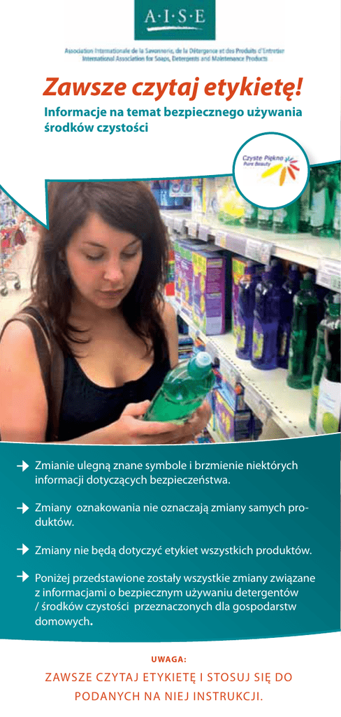 Zawsze czytaj etykietę! Informacje na temat bezpiecznego używania środków czystości → Zmianie ulegną znane symbole i brzmienie niektórych informacji dotyczących bezpieczeństwa. → Zmiany oznakowania nie oznaczają zmiany samych produktów. → Zmiany nie będą dotyczyć etykiet wszystkich produktów. → Poniżej przedstawione zostały wszystkie zmiany związane z informacjami o bezpiecznym używaniu detergentów / środków czystości przeznaczonych dla gospodarstw domowych. Uwaga: Zawsze czy taj et ykietę i stosuj się do podanych na niej instrukcji. Zawsze czytaj etykietę Niewłaściwe lub nieostrożne używanie detergentów / środków służących do utrzymania higieny i czystości w domu, może być przyczyną wypadków, dlatego zawsze tak ważne jest, aby zapoznać się z treścią etykiet tych produktów oraz zrozumieć umieszczone na nich symbole i informacje ostrzegawcze. Wkrótce na opakowaniach środków czystości zaczną pojawiać się nowe znaki ostrzegawcze. Zmiany będą wprowadzane stopniowo, więc przez pewien czas na rynku będą dostępne produkty zarówno ze starym, jak i nowym oznakowaniem. Nowe symbole muszą zostać wprowadzone na wszystkich etykietach do 2017 roku. Zmiany obejmą jedynie część etykiety dotyczącą wymaganych przez prawo informacji na temat bezpiecznego stosowania produktu. Nowe symbole Stare czarno-pomarańczowe symbole zagrożeń powiązane z informacjami o kategorii niebezpieczeństwa zostaną zastąpione podobnymi piktogramami o zmienionym kształcie i kolorze. Na chemikaliach umieszczane będą także inne nowe symbole, ale nie dotyczą one detergentów i środków czystości. Nowe symbole (c.d.) Wprowadzono też nowe symbole ostrzegawcze, nie mające odpowiednika wśród dotychczasowych: Ten nowy symbol ostrzega o takich zagrożeniach dla zdrowia, jak możliwość podrażnienia skóry, uczulenia, poważnego podrażnienia oczu oraz o szkodliwości w przypadku połknięcia produktu. Ten nowy symbol ostrzega o poważniejszych niż wyżej wymienione zagrożeniach dla zdrowia. Dotychczas stosowany symbol z krzyżem św. Andrzeja, będzie stopniowo wycofywany z użycia. Nowe słowa i wyrażenia ostrzegawcze Symbole będą opisywane nowymi słowami. Uwaga (w przypadku mniejszych zagrożeń). Niebezpieczeństwo (w przypadku większych zagrożeń). po których podawane będą: i nformacje na temat zagrożeń (np. „Powoduje podrażnienie skóry”); informacje na temat warunków bezpiecznego stosowania produktu, których przestrzeganie zapewni bezpieczeństwo i pozwoli uniknąć wypadków (np. ,,Chronić przed dziećmi”). Przykład oznakowania środka czystości według starych i nowych zasad: (Nazwa handlowa) środek czystości Działa drażniąco na oczy. Unikać kontaktu z oczami. Zanieczyszczone oczy przemyć natychmiast dużą ilością wody i zasięgnąć porady lekarza. W razie połknięcia niezwłocznie zasięgnąć porady lekarza i pokazać opakowanie lub etykietę. Chronić przed dziećmi. The ABC Specialty Company, Old Street, New Town, City Y Tel 01 234 567 89 (Nazwa handlowa) środek czystości Uwaga Powoduje poważne podrażnienie oczu. Chronić przed dziećmi. Stosować ochronę oczu/ ochronę twarzy W PRZYPADKU KONTAKTU Z OCZAMI: Ostrożnie płukać wodą przez kilka minut. Wyjąć soczewki kontaktowe, jeżeli są i można je łatwo usunąć.. Nadal płukać. W przypadku utrzymywania się działania drażniącego na oczy: Zasięgnąć porady/zgłosić się pod opiekę lekarza. W razie konieczności zasięgnięcia porady lekarza, należy pokazać pojemnik lub etykietę. Dokładnie umyć ręce po użyciu. The ABC Specialty Company, Old Street, New Town, City Y Tel 01 234 567 89 UWAGA: Powyższe przykłady służą jedynie do celów informacyjnych. Istnieją wymagania dotyczące wielkości piktogramów i etykiety. Ważne informacje → Unia Europejska wdraża nowy, opracowany przez ONZ , system jednolitego na całym świecie klasyfikowania i oznakowania substancji chemicznych oraz zawierających je produktów. W przeszłości produkt X mógł być sklasyfikowany jako niebezpieczny w jednym kraju, natomiast w innym już nie. Używane były różne symbole oznaczające te same zagrożenia, a niektóre kraje nie miały wdrożonego żadnego systemu. → Możliwe jest także, że w starym systemie nie było wymagane stosowanie żadnych symboli zagrożeń, które muszą być stosowane w nowym systemie. Nie oznacza to, że sam produkt z nowym oznakowaniem został zmieniony lub stał się bardziej niebezpieczny. → Symbole i opisy mają za zadanie zwrócić uwagę użytkownika na niebezpieczne substancje obecne w produkcie oraz opisać występujące zagrożenia. Nie oznacza to jednak, że użytkownik jest narażony na zagrożenia, jeśli używa produktu w sposób opisany na etykiecie. → „Zagrożenie” chemiczne to zdolność substancji do wywierania niekorzystnego wpływu na użytkownika, wynikająca z jej właściwości fizykochemicznych. „Ryzyko” to prawdopodobieństwo, że wpływ ten nastąpi podczas zastosowania produktu do celów, do których został stworzony. Różnice pomiędzy tymi pojęciami można wyjaśnić na następującym przykładzie: przechodzenie przez jezdnię stwarza zagrożenie, lecz jeśli przechodzący korzysta z oznaczonego przejścia dla pieszych i upewni się, czy z obu stron nie nadjeżdżają pojazdy, ryzyko jest bardzo niskie. Możliwe działania Istnieje wiele czynników minimalizujących zagrożenia chemiczne. Najważniejsza rada jest jednak zawsze najprostsza: Przed użyciem produktu zawsze przeczytaj jego etykietę. Znajduje się na niej wiele przydatnych informacji. Aby bezpiecznie używać produkt: Przeczytaj dokładnie etykietę. Sprawdź, czy dany produkt nadaje się do danego zastosowania. Zastanów się czy podane na etykiecie symbole i opisy informują o jakichkolwiek zagrożeniach. Zastanów się, czy musisz podjąć jakiekolwiek środki ostrożności, np. założyć rękaw
