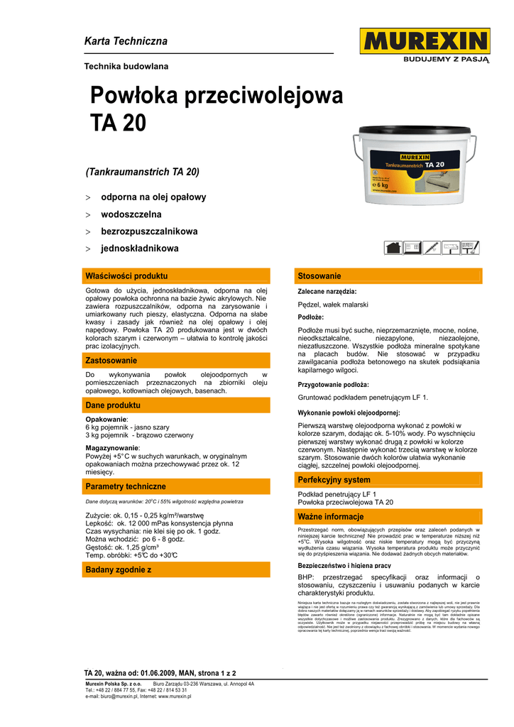 Karta Techniczna Technika budowlana BAT_TA20 Powłoka przeciwolejowa TA 20 (Tankraumanstrich TA 20) > odporna na olej opałowy > wodoszczelna > bezrozpuszczalnikowa > jednoskładnikowa Właściwości produktu Stosowanie Gotowa do uŜycia, jednoskładnikowa, odporna na olej opałowy powłoka ochronna na bazie Ŝywic akrylowych. Nie zawiera rozpuszczalników, odporna na zarysowanie i umiarkowany ruch pieszy, elastyczna. Odporna na słabe kwasy i zasady jak równieŜ na olej opałowy i olej napędowy. Powłoka TA 20 produkowana jest w dwóch kolorach szarym i czerwonym – ułatwia to kontrolę jakości prac izolacyjnych. Zalecane narzędzia: Pędzel, wałek malarski PodłoŜe: PodłoŜe musi być suche, nieprzemarznięte, mocne, nośne, nieodkształcalne, niezapylone, niezaolejone, niezatłuszczone. Wszystkie podłoŜa mineralne spotykane na placach budów. Nie stosować w przypadku zawilgacania podłoŜa betonowego na skutek podsiąkania kapilarnego wilgoci. Zastosowanie Do wykonywania powłok olejoodpornych w pomieszczeniach przeznaczonych na zbiorniki oleju opałowego, kotłowniach olejowych, basenach. Przygotowanie podłoŜa: Gruntować podkładem penetrującym LF 1. Dane produktu Wykonanie powłoki olejoodpornej: Opakowanie: 6 kg pojemnik - jasno szary 3 kg pojemnik - brązowo czerwony Pierwszą warstwę olejoodporna wykonać z powłoki w kolorze szarym, dodając ok. 5-10% wody. Po wyschnięciu pierwszej warstwy wykonać drugą z powłoki w kolorze czerwonym. Następnie wykonać trzecią warstwę w kolorze szarym. Stosowanie dwóch kolorów ułatwia wykonanie ciągłej, szczelnej powłoki olejoodpornej. Magazynowanie: PowyŜej +5° C w suchych warunkach, w oryginalnym opakowaniach moŜna przechowywać przez ok. 12 miesięcy. Perfekcyjny system Parametry techniczne Podkład penetrujący LF 1 Powłoka przeciwolejowa TA 20 Dane dotyczą warunków: 20oC i 55% wilgotność względna powietrza ZuŜycie: ok. 0,15 - 0,25 kg/m²/warstwę Lepkość: ok. 12 000 mPas konsystencja płynna Czas wysychania: nie klei się po ok. 1 godz. MoŜna wchodzić: po 6 - 8 godz. Gęstość: ok. 1,25 g/cm³ Temp. obróbki: +5°C do +30°C WaŜne informacje Przestrzegać norm, obowiązujących przepisów oraz zaleceń podanych w niniejszej karcie technicznej! Nie prowadzić prac w temperaturze niŜszej niŜ +5oC. Wysoka wilgotność oraz niskie temperatury mogą być przyczyną wydłuŜenia czasu wiązania. Wysoka temperatura produktu moŜe przyczynić się do przyśpieszenia wiązania. Nie dodawać Ŝadnych obcych materiałów. Bezpieczeństwo i higiena pracy Badany zgodnie z BHP: przestrzegać specyfikacji oraz informacji o stosowaniu, czyszczeniu i usuwaniu podanych w karcie charakterystyki produktu. Niniejsza karta techniczna bazuje na rozległym doświadczeniu, została stworzona z najlepszej woli, nie jest prawnie wiąŜąca i nie jest ofertą w rozumieniu prawa czy teŜ gwarancją wynikającą z zamówienia lub umowy sprzedaŜy. Dla dobra naszych materiałów dołączamy ją w ramach warunków sprzedaŜy i dostawy. Aby zapobiegać ryzyku popełnienia błędów zawarto równieŜ określone (ograniczone) informacje. Naturalnie nie mogą być tam dokładnie opisane wszystkie dotychczasowe i moŜliwe zastosowania produktu. Zrezygnowano z danych, które dla fachowców są oczywiste. UŜytkownik moŜe w przypadku niejasności przeprowadzić próbę na miejscu budowy na własną odpowiedzialność. Nie jest teŜ zwolniony z obowiązku z fachowej obróbki i stosowania. W momencie wydania nowego opracowania tej karty technicznej, poprzednia wersja traci swoją waŜność. 0120, waŜna od: 01.06.2009, MAN, strona 1 z 2 TA Murexin Polska Sp. z o.o. Biuro Zarządu 03-236 Warszawa, ul. Annopol 4A Tel.: +48 22 / 884 77 55, Fax: +48 22 / 814 53 31 e-mail: [email protected], Internet: www.murexin.pl 1 Karta Techniczna Technika budowlana BAT_TA20 0120, waŜna od: 01.06.2009, MAN, strona 2 z 2 TA Murexin Polska Sp. z o.o. Biuro Zarządu 03-236 Warszawa, ul. Annopol 4A Tel.: +48 22 / 884 77 55, Fax: +48 22 / 814 53 31 e-mail: [email protected], Internet: www.murexin.pl 2