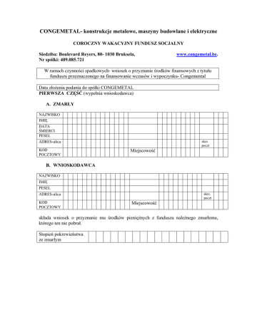 CONGEMETAL- konstrukcje metalowe, maszyny budowlane i elektryczne COROCZNY WAKACYJNY FUNDUSZ SOCJALNY Siedziba: Boulevard Reyers, 80- 1030 Bruksela, Nr spółki: 409.085.721 www.congemetal.be. W ramach czynności spadkowych- wniosek o przyznanie środków finansowych z tytułu funduszu przeznaczonego na finansowanie wczasów i wypoczynku- Congemental Data złożenia podania do spółki CONGEMETAL PIERWSZA CZĘŚĆ (wypełnia wnioskodawca) A. ZMARŁY NAZWISKO IMIĘ DATA ŚMIERCI PESEL skrz. poczt ADRES-ulica KOD POCZTOWY Miejscowość B. WNIOSKODAWCA NAZWISKO IMIĘ PESEL skrz. poczt ADRES-ulica KOD POCZTOWY Miejscowość składa wniosek o przyznanie mu środków pieniężnych z funduszu należnego zmarłemu, którego ten nie pobrał. Stopień pokrewieństwa ze zmarłym C. UZASADNIENIE SKŁADANEGO WNIOSKU Mój wniosek jest poparty następującym faktem: - zmarły zamieszkiwał ze mną - pokryłem koszty hospitalizacji zmarłego - zostałem obciążony kosztami pogrzebowymi W załączeniu: faktury i rachunki poniesionych kosztów (lub kopie potwierdzone z oryginałem) (1) zaznaczyć właściwe D. INNI MAJĄCY PRAWO DO ROSZCZEŃ Czy pozostałe osoby, o których mowa, spełniają identyczne warunki by móc ubiegać się o wakacyjny fundusz? TAK NIE Jeśli tak, załączam odpowiednie dokumenty i upoważnienia, które potwierdzają powyższą zdolność. E. SPOSÓB ZAPŁATY Przyznane środki finansowe zostaną przelane na : - moje konto bankowe BIC: Oświadczam, że wszystkie powyższe informacje zawarte we wniosku są prawdziwe. Data miejsce Podpis CZĘŚĆ DRUGA Adnotacje urzędowe- wypełnia gminna jednostka administracyjna 1. czy w momencie śmierci zmarły mieszkał sam? TAK 2. Jeśli NIE TAK NAZWISKO IMIĘ PESEL skrz. poczt ADRES-ulica KOD POCZTOWY Miejscowość Stopień pokrewieństwa ze zmarłym Burmistrz lub osoba upoważniona stwierdzają prawdziwość podanych informacji dotyczących danej gminy. Data Pieczęć gminy miejsce Podpis (1) zaznaczyć właściwe (2) przyznane środki finansowe zostaną wypłacone w formie czeku i przesłane na adres wnioskodawcy ( przy braku numeru konta) (3) nie jest to konieczne w przypadku współmałżonki/ małżonka lub dzieci mających taki sam adres co zmarły
