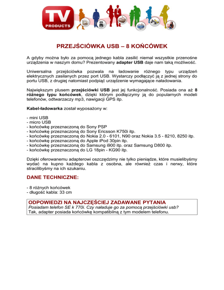 PRZEJŚCIÓWKA USB – 8 KOŃCÓWEK A gdyby można było za pomocą jednego kabla zasilić niemal wszystkie przenośne urządzenia w naszym domu? Prezentowany adapter USB daje nam taką możliwość. Uniwersalna przejściówka pozwala na ładowanie różnego typu urządzeń elektrycznych zasilanych przez port USB. Wystarczy podłączyć ją z jednej strony do portu USB, z drugiej natomiast podpiąć urządzenie wymagające naładowania. Największym plusem przejściówki USB jest jej funkcjonalność. Posiada ona aż 8 różnego typu końcówek, dzięki którym podłączymy ją do popularnych modeli telefonów, odtwarzaczy mp3, nawigacji GPS itp. Kabel-ładowarka został wyposażony w: - mini USB - micro USB - końcówkę przeznaczoną do Sony PSP - końcówkę przeznaczoną do Sony Ericsson K750i itp. - końcówkę przeznaczoną do Nokia 2.0 - 6101, N90 oraz Nokia 3.5 - 8210, 8250 itp. - końcówkę przeznaczoną do Apple iPod 30pin itp. - końcówkę przeznaczoną do Samsung i900 itp. oraz Samsung D800 itp. - końcówkę przeznaczoną do LG 18pin - KG90 itp. Dzięki oferowanemu adapterowi oszczędzimy nie tylko pieniądze, które musielibyśmy wydać na kupno każdego kabla z osobna, ale również czas i nerwy, które stracilibyśmy na ich szukaniu. DANE TECHNICZNE: - 8 różnych końcówek - długość kabla: 33 cm ODPOWIEDZI NA NAJCZĘŚCIEJ ZADAWANE PYTANIA Posiadam telefon SE k 770i. Czy naładuje go za pomocą przejściówki usb? Tak, adapter posiada końcówkę kompatibilną z tym modelem telefonu.