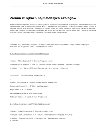 Urząd Gminy Włoszczowa Ziemia w rękach najmłodszych ekologów Ponad 200 osób bawiło się na II Pikniku Ekologicznym. Z powodu niesprzyjającej aury impreza została przeniesiona do hali sportowej OSiR. Fundacja Ekologiczna „Arka” z Bielska-Białej przygotowała i przeprowadziła happening „Ziemia w naszych rękach" oraz warsztaty ekologiczne: pisania listów dla Ziemi, ośmiokąt edukacyjny na temat odpadów, eko-domek oraz gry: eko-memory czy ekologiczne puzzle. Fundacja nadała Gminie Włoszczowa Certyfikat Mecenasa Edukacji Ekologicznej za wsparcie programów i kampanii edukacji ekologicznej. Uczniowie z rąk burmistrza Grzegorza Dziubka i starosty włoszczowskiego Jerzego Suligi odebrali nagrody w konkursie „Co mogą zrobić dzieci z segregowanych śmieci? 1. w kategorii uczniowie klas I-III szkół podstawowych: I miejsce - Adrian Gębka kl. II SP Czarnca / nagroda - rower II miejsce - Jakub Pośpiech kl. II ZPO Nr 1we Włoszczowie (filia w Łachowie) / nagroda - hulajnoga III miejsce - Patryk Bąk kl. I ZPO Kurzelów / nagroda – dres sportowy + koszulka 5 wyróżnień: / nagroda – zestaw do badmintona Zuzanna Warzyńska kl. II ZPO Nr 1 we Włoszczowie (filia Łachów) Tymoteusz Plebanek kl. I e ZPO Nr 1 we Włoszczowie Kinga Wójcik kl. III SP Czarnca Karol Kusa kl. III a ZPO Nr 1 we Włoszczowie Mateusz Sobczyk kl. III a ZPO Nr 2 we Włoszczowie 2. w kategorii uczniowie klas IV-VI szkół podstawowych: I miejsce - Kinga Sikorska kl. V SP Czarnca/ nagroda - rower II miejsce - Adam Szymkiewicz kl. IV a ZPO Nr 2 we Włoszczowie / nagroda - hulajnoga III miejsce - Sebastian Wcisło kl. VI ZPO Konieczno / nagroda – dres sportowy + koszulka 1 Urząd Gminy Włoszczowa 5 wyróżnień: / nagroda – zestaw do tenisa stołowego Anna Wójcik kl. VI ZPO Konieczno Karolina Dymek kl. V ZPO Kurzelów Kacper Tylko kl. V ZPO Kurzelów Wiktoria Walczyk kl. VI SP Czarnca Wiktoria Wierzbicka kl. V ZPO Konieczno 3. w kategorii uczniowie z gimnazjów publicznych I miejsce - Anna Jarmuda kl. III a ZPO Nr 2 we Włoszczowie/ nagroda - rower II miejsce - Aleksandra Bauer kl. II ZPO Konieczno / nagroda - hulajnoga III miejsce - Olga Jankowska kl. III ZPO Konieczno / nagroda – dres sportowy + koszulka 5 wyróżnień: / nagroda – zestaw do tenisa ziemnego Marta Giec kl. II ZPO w Koniecznie Karolina Łukasik kl. III b ZPO Nr 2 we Włoszczowie Adrian Rak kl. I ZPO Konieczno Arkadiusz Jach kl. II ZPO Konieczno Weronika Lesiak kl. I ZPO Konieczno Łącznie wpłynęło 140 prac. Organizatorzy dziękują sponsorom. Piknik wsparli: Urząd Gminy Włoszczowa, Starostwo Powiatowe we Włoszczowie Przedsiębiorstwo Gospodarki Komunalnej i Mieszkaniowej Sp. z o.o. we Włoszczowie, Dom Kultury we Włoszczowie, Lasy Państwowe Nadleśnictwo Włoszczowa, Bank Spółdzielczy we Włoszczowie, Skok Jaworzno oddział Włoszczowa. 2