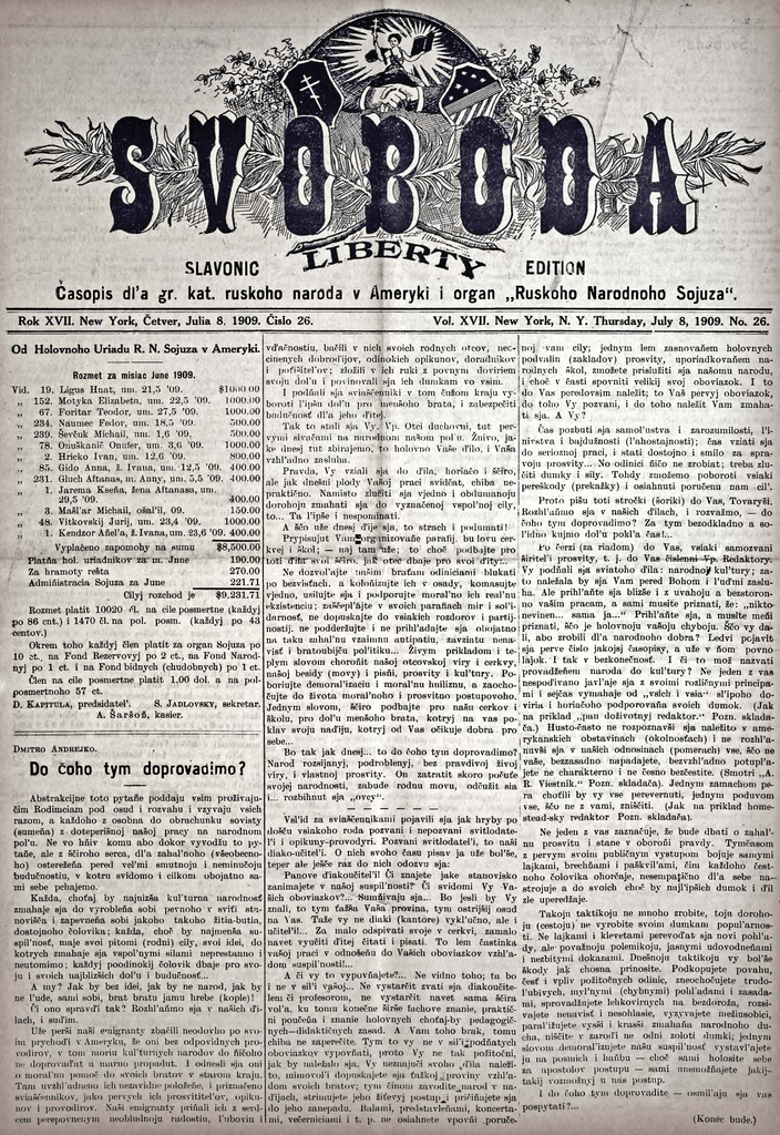 SLAVONIC 4 V * EDITION Casopis dl’a gr. kat. ruskoho naroda v Ameryki i organ „Ruskoho Narodnoho Sojuza". Rok XV II. New York, Cetver, Julia 8, 1909. Ćislo 26. Vol. X V II. New York, N. Y. Thursday, July 8, 1909. No. 26. Od Holovnoho Uriadu R. N. Sojuza v Ameryki. vd’aCnostiu, baCili v nich swoich rodnych otcov, nec- noj Rozmet za m isiac June 1909. Vid. „ „ ■ „ ,, ,, ,, ., „ „ ,, „ 19. 152. 67. 234. 239. 78. 2. 85. 231. 1. Ligus Hnat, um. 21,0 ’09. $1000 00 Motyka Elizabeta, ura. 22,5 ’09. 1000.00 Foritar Teodor, um. 27,5 ’09. 1000.00 Naumec Fedor, um. 18.5 ’09. 500.00 SevCulc Michaił, um. 1,6 ’09. 500.00 OnuSkaniC Onufer, um. 3,6 ’09. 1000.00 Hricko Ivan, um. 12,6 '09. 800.00 Gido Anna, ż. Ivaua, um. 12,5 ’09. 400.00 Głuch Aftanas, m. Anny, um. 5,5 ’09. 400.00 Jarema Ksena, żena Aftanasa, um. 29,5 ’09. 400.00 3. MaSl’ar Michaił, osal’il, 09. 150.00 48. Vitkovskij Jurij, um. 28,4 ’09. 1000.00 1. Kendzor Afiel’a, 2. Ivana, um. 23,6 ’09. 400.00 Vyplaceno zapomohy na sumu $8,500.00 Platfla hol. uriadnikov zar m. Jnne 190.00 Za hramoty resta 270.00 Admifiistracia Sojuza za June ________ 221.71 Cilyj rozchod je $9.231.71 Rozmet platit 10020 Cl. na cile posmertne (kazdyj po 86 cnt.) i 1470 Cl. na pol. posm. (kazdyj po 43 centov.) Okrem toho kazdyj Clen platit za organ Sojuza po 10 ct., na Fond Rezervovyj po 2 ct., na Fond Narod nyj po 1 ct. i na Fond bidnych (chudobnych) po 1 ct. Clen na cile posmertne platit 1.00 dol. a na polposmertnoho 57 ct. D. K a p i t u ł a , predsidatel’. S. J a d l o v s k y , sekretar. A . ŚarSofi, kasier. D m it r o A n d be jk o . Do coho tym doprovadimo? . Abstrakcijne toto pytane poddaju vsim proźivajuCim Rodimciam pod osud i rozvahu i vzyvaju vsich razom, a kaźdoho z osobna do obrachunku sovisty (sumefia) z doteperiśnoj naSoj pracy na narodnom pol’u. Ne vo hfiiv komu abo dokor vyvodZu to pytafie, ale z SCiroho serca, dl’a zahal’noho ( vSeobecnoho) ostereżefia pered vel’mi smutnoju i neminuCoju buduCnostiu, v kotru svidomo i cilkom obojatno sa mi sebe pchajemo. Każda, chotaj by najnizSa kul’turna narodnost zniahaje sja do vyroblefia sobi pevnoho v svifi stanoviSCa i zapevrtena sobi jakoho takoho źitia-butia, dostojnoho Colovika; każda, choC by najmenSa suspil’nost, maje svoi pitomi (rodni) city, svoi idei, do kotrych zinahaje sja vspol’nymi silami neprestanno i neutomimo; kazdyj poodinokij Colovik dbaje pro svo ju i svoich najblizsich dol’u i buduCnost... A my? Jak by bez idei, jak by ne narod, jak by ne l’ude, sami sobi, brat bratu jamu hrebe (kople)! Ci ono spravd’i tak? Rozhl’afimo sja v nasich d’ilacli, i sud’im. Uźe perSi nasi emigranty zbaCili neodovho po svo im prychod’i v Ameryku, źe oni bez odpovidnych provodirov, v tom moriu kul’turnych narodov do nicolio ne doprovad’at a marno propadut. I odnesli sja oni o moral’nu pomoC do svoich bratov v starom kraju. Tam uvzhl'adneno ich nezavidne poloźene, i priznaCeno svia&Cennikov, jako pervych ich prosvititel’ov, opiku nov i provodirov. Nasi emigranty prińali ich z serdcem perepovnenym neobhidnoju radostiu, l’uboviu i vam cily; jednym lem zasnovafiem holovnych cinenych dobrod'ijov, odinokich opikunov, doradnikovj podvalin (zakladov) prosvity, uporiadkovafiem nai pofisitel’o v ; żlożili v ich ruki z povnym doviriemi rodnych śkol, zmozete prisluźiti sja nasoinu narodu, svoju dol'u i povinovali sja ich dumkam vo vsim. j i choc v Casti spovniti velikij svoj oboviazok. I to I podfiali sja sviasCenniki v tom Cuzom kraju vydo Vas peredovsim należit; to Vas pervyj oboviazok, boroti 1’ipSu dol'u pro menSoho brata, i zabezpeCiti do toho Vy pozvani, i do toho należit Vam zmaha buduCnost dl’a jeho d’itej. ti sja. A Vy? Tak to stali sja Vy, Vp. Otci duchomi, tut, perCas pozbuti sja samol’ustva, i zarozumilosti, l ’ivymi sivaCami na narodnom nasom pol u. Żnivo, ja nivstva i bajdużnosti (l’ahostajnosti); Cas vziati sja ke dnesj tut zbirajemo, to holovno Vase d’ilo, i VaSa do serioznoj praci, i stati dostojno i smilo za spravzhl’adno zasluha. voju prosvity... No odinici fiiCo ne zrobiat; treba zlu- Pravda, Vy vziali sja do d’ila, horiaCo i SCiro, Citi dumky i sily. Tohdy zmożemo poboroti vsiaki ale jak dnesni plody Vasoj praci svidCat, chiba ne- pereśkody (prekażky) i osiahnuti poruCenu nam cil’. praktiCno. Namisto zluciti sja vjedno i obdumanoju Proto pigu toti stroCki (śoriki) do Vas, To vary Si. dorohoju zmahati sja do vyznaCenoj vspol’noj cily, Rozhl’afimo sja v naSich d’ilach, i rozvażmo, — do to... Ta 1’ipSe i nespominati. | Coho tym doprovadimo? Za tym bezodkladno a soA SCo uźe dnesj d’ije sja, to strach i podumati! l’idno kujmo dol’u pokl’a Cas!... Prypisujut Vamjorganizovafie parafij. bu lovu cerPo Cerzi (za riadom) do Vas, vsiaki samozvani kvej i śkol; — naj tam "uźe; to choC podbajte pro toti frrfif svoi śriro. jaft oter: dbaje pro svoi d’ity:.. , Siritel'i prosvity, t. j. do Vas Cislen«i -Vp. Redaktory. Ne dozvol’ajte nuśim bratam odiniciami blukati ■Vy podfiali sja sviatoho d’ila : narodnoy kul’tu ry ; za po bezvistach, a koloiiizujte ich v osady, koinasujte to należała by sja Vam pered Bohom i l’ud’mi zaslu vjedno, usilujte sja i podporujte moral’no ich real’nui ha. Ale prihl’afite sja blizSe i z uvahoju a bezstoronekzistenciu; zaSCepl’&jte v svoich parafiach mir i sol’i- 110 va§im pracam, a sami musite priznati, źe: „nikto darnost, ne dopuskajte do vsiakich rozdorov i part.ij-1 nevinen... sama ja...“ Prihl’afite sja, a musite mefii nostij. ne podderźujte i ne prihl’adajte sja obojatno! priznati, SCo je holovnoju vaSoju chyboju. ŚCo vy da na taku zahal’nu vzaimnu antipatiu, zavziatu nena- li, abo zrobili dl’a narodnoho dobra? Ledvi pojavit vist i bratoubijCu pol’itiku... Zivym prikladom i te-j sja perve Cislo jakojsj Casopisy, a uźe v fiom povno plym slovom chorofiit naśoj otcovskoj viry i cerkvy,! lajo