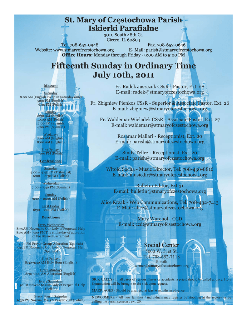 St. Mary of Częstochowa Czestochowa Parish Iskierki Parafialne 3010 South 48th Ct. Cicero, IL 60804 Tel. 708-652-0948 Fax. 708-652-0646 Website: www.stmaryofczestochowa.org E- Mail: [email protected] Office Hours: Monday through Friday - 9:00 AM to 5:00 PM Fifteenth Sunday in Ordinary Time July 10th, 2011 Masses: Saturday 8.00 AM (English every 1st Saturday only) 5:00 PM (English) 6:30 PM (Polish) Sunday 8:30 AM (English) 10:00 AM (Polish) 12:00 PM (Spanish) 4:00 PM (Spanish) Weekdays 7:00 AM (English) 8:00 AM (English) First Fridays 7:00 PM (Polish) Confessions: Fr. Radek Jaszczuk CSsR - Pastor, Ext. 28 E-mail: [email protected] Fr. Zbigniew Pienkos CSsR - Superior & Associate Pastor, Ext. 26 E-mail: [email protected] Fr. Waldemar Wieladek CSsR - Associate Pastor, Ext. 27 E-mail: [email protected] Rosamar Mallari - Receptionist, Ext. 20 E-mail: [email protected] Sindy Tellez - Receptionist, Ext. 20 E-mail: [email protected] Saturday 4:00 – 4:45 PM (Trilingual) 6:00 — 6:30PM (Polish) Witold Socha - Music Director, Tel. 708-430-8816 E-mail: [email protected] Wednesday 7:00 – 7:40 PM (Spanish) Bulletin Editor, Ext 31 E-mail: [email protected] Sunday 9:30 – 10:00 AM (Polish) First Friday 6:30 – 7:00 PM (Polish) Devotions: Every Wednesday 8:30AM Novena to Our Lady of Perpetual Help 8:30 AM - 7:00 PM The entire day of adoration of the Blessed Sacrament 7:00 PM Prayer Group-Adoration (Spanish) 7:45 PM Novena to Our Lady of Perpetual Help (Spanish) First Fridays 8:30-9:30 AM Holy Hour (English) Alice Krzak - Web Communications, Tel. 708-432-7413 E-Mail: [email protected] Mary Warchol - CCD E-mail: [email protected] Social Center 5000 W. 31st St. Tel. 708-652-7118 E-mail: [email protected] First Saturdays 8:30-9:00 AM Adoration (English) Every Saturdays 6:30PM Novena to Our Lady of Perpetual Help (Polish) Every Fourth Saturday 6:30 PM Novena, Mass & Prayer Vigil (Polish) SICK CALLS - In all cases of serious illness or accidents, a priest should be called at once. Holy Communion will be brought to the sick upon request. MARRIAGES - Should be arranged at least 6 months in advance. NEWCOMERS - All new families / individuals may register by stopping at the rectory or by calling the parish secretary ext. 20. Sunday July 10, Fifteenth Sunday in Ordinary Time 8:30 Parishioners 10:00 Dziękczynna za 20 lat posługi muzycznej Pana Witolda Sochy z prośbą o dalsze błogosławieństwo Boże i potrzebne łaski O Boże bł. dla Tomasza Majerczyk z okazji 1-ch urodzin O szczęśliwą podróż i Boże bł. w czasie wakacji dla Bogumiły †Honorata i Jan Chłopek (40-a rocz. śm) †Alicja Kmieć †Ben i Jean Nurkiewicz †Bronisław Bafia, Jan i Ludwika Wodziek †Władysław Korkosz †Katarzyna i Jan Maniecki †Jerzy, Łucja, Alter Milsztajn (dzieci) 12:00 Presentacion de 3 años de Alondra Dominquez Por las bendiciones en la Primera Comunion de Jacqueline Guadalupe Lomeli Herrera †Alfredo Gonzalez (Familia) †Edwin Regalado 4:00 Por los Feligreses July 11, Monday, Saint Benedict, abbot 7:00 Sonia Rada (Father) 8:00 †Lottie Kustosz (10th Anniversay, Florence Glosniak, Daughter) July 12, Tuesday, Weekday in Ordinary Time 7:00 Carolina Rada (Father) 8:00 †Genevie Kowaski (4th Anniversary, Florence Glosniak, Niece) July 13, Wednesday, Saint Henry 7:00 Martha Rada (Father) 8:00 †Holy Souls in the Book of Remembrance 8:30 Novena: Our Lady of Perpetual Help/Adoration 7 PM El Circulo de Oración 7:45 Novena a Nuestra Señora del Perpetuo Socorro July 14, Thursday, Blessed Kateri Tekakwitha, virgin 7:00 Francisco Rada Jr. (Father) 8:00 †Holy Souls in the Book of Remembrance July 15, Friday , Saint Bonaventure, bishop and doctor of the church 7:00 Evaristo Rada (Son) 8:00 Parishioners 3:00 Quinceañera: Crystal Ivonne Zapata Iskierki Parafialne July 16, Saturday, Our Lady of Mount Carmel; BVM 1:00 Wedding: Beata Nowak & Norbert Nowak 3:00 Quinceañera: Isis Jazmin Galindo 5:00 †Helen and Edward Natonski (Son Lawry) 6:30 W intencjach próśb i podziekowań do M. B. Nieustającej Pomocy July 17, Sunday Sixteenth Sunday in Ordinary Time 8:30 Parishioners 10:00 O Boże bł. dla Redemptorystów w Uroczystość Najświętszego Odkupiciela. O Boże bł. dla Anny i Józefa oraz opiekę Matki Bożej w ich narzeczeństwie. †Jerzy, Lucja, Alter Milsztajn (dzieci) 12:00 Por los Feligreses 4:00 Por los Feligreses Lector Schedule Saturday, July 16 5:00 Martha Stolarski, Marie Jarding Sunday, July 17 8:30 John Kociolko 10:00 Ryszard Kujawski, Jarek Szyszlak 12:00Roberto Pasillas, Linda Ramirez Miriam Campagne 4:00 Los Niños Eucharistic Minister Saturday, July 16 5:00 Jean Yunker, Georgia Czarnecki Sunday, July 17 8:30 Christine Zaragoza, Ed Hennessy Myra Rodriguez 10:00 Waldemar Lipka 12:00 Vicente Saldaña, Irene Saldaña Maria T. Torres, Ruth Trujillo 4:00 Rene Aviña, Gisela Aviña, Enrique Garcia WEDDING BANNS There is a promise of marriage between…………….. Ill. Beata Nowak & Norbert Nowak ll. Natali Romero & Rufino Miron ll. Teresa Marek & Krzysztof Wyrostek l. Anna Walkosz & Rafal Gil l. Wioleta Jarog & Dawid Liszkowski We welcome in Baptism: Enrique Avila Michelle Fuentes Christian Gomez Adrian Francisco Guerrero Jose Martinez St. Mary of Czestochowa Sunday Collection June 3rd, 2011 07/02 WE ARE LOOKING FOR A FEW GOOD MEN ( AND WOMEN) This is our sixth annual carnival. While we have plenty of volunteers (over 100) for the Hispanic food booth, and several Polish-speaking workers, we are in desperate need of English-speaking volunteers from the Parish. We cook 700 to 800 hot dogs and 200 lbs. of Polish Sausage, as well as Pierogi and other foods. We have the same 6 to 10 people every year who work everyday. We have to depend on our families, friends and volunteers from the Polish Falcons from outside the Parish to help us. This is your Parish. Please help us with this big fundraiser by giving two hours of your time to your church. If you don’t like working with food, we have other booth
