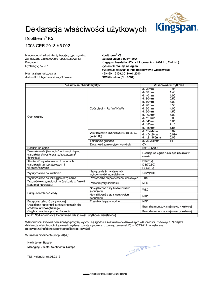 Deklaracja właściwości użytkowych Kooltherm® K5 1003.CPR.2013.K5.002 Kooltherm® K5 Izolacja cieplna budynków Kingspan Insulation BV - Lingewei 8 - 4004 LL, Tiel (NL) System 1; reakcja na ogień System 3; wszystkie inne podstawowe właściwości NEN-EN 13166:2012+A1:2015 FIW München (No. 0751) Niepowtarzalny kod identyfikacyjny typu wyrobu: Zamierzone zastosowanie lub zastosowania: Producent: System(-y) AVCP: Norma zharmonizowana: Jednostka lub jednostki notyfikowane: Zasadnicze charakterystyki Opór cieplny RD ((m².K)/W) Opór cieplny Współczynnik przewodzenia ciepła λD (W/(m.K)) Tolerancja grubości Zawartość zamkniętych komórek Reakcja na ogień Trwałość reakcji na ogień w funkcji ciepła, warunków atmosferycznych, starzenia/ degradacji Stabilność wymiarowa w określonych warunkach temperaturowych i wilgotnościowych Reakcja na ogień nie ulega zmianie w czasie DS(70,-) DS(70,90) DS(-20,-) Wytrzymałość na ściskanie Wytrzymałość na rozciąganie/ zginanie Trwałość wytrzymałości na ściskanie w funkcji starzenia/ degradacji Przepuszczalność wody Właściwości użytkowe dN 20mm 0.95 dN 30mm 1.40 dN 40mm 1.90 dN 50mm 2.50 dN 60mm 3.00 dN 70mm 3.50 dN 80mm 4.00 dN 90mm 4.50 dN 100mm 5.00 dN 120mm 6.00 dN 140mm 6.65 dN 150mm 7.10 dN 159mm 7.55 dN 15-44mm 0.021 dN 45-120mm 0.020 dN 121-159mm 0.021 dN 20-200mm T1 CV RtF C-s2,d0 Naprężenie ściskające lub wytrzymałość na ściskanie Prostopadle do powierzchni czołowych Pełzanie przy ściskaniu Nasiąkliwość przy krótkotrwałym zanurzeniu Nasiąkliwość przy długotrwałym zanurzeniu Przenikanie pary wodnej Przepuszczalność pary wodnej Uwalnianie substancji niebezpiecznych dla środowska wewnętrznego Ciągłe spalanie w postaci żarzenia NPD: No Performance Determined (właściwości użytkowe nieustalone) CS(Y)100 TR80 NPD WS2 NPD NPD Brak zharmonizowanej metody testowej Brak zharmonizowanej metody testowej Właściwości użytkowe określonego powyżej wyrobu są zgodne z zestawem deklarowanych właściwości użytkowych. Niniejsza deklaracja właściwości użytkowych wydana zostaje zgodnie z rozporządzeniem (UE) nr 305/2011 na wyłączną odpowiedzialność producenta określonego powyżej. W imieniu producenta podpisał(-a): Henk Johan Bassie, Managing Director Continental Europe Tiel, Holandia, 01.02.2016 www.kingspaninsulation.eu/dop/K5