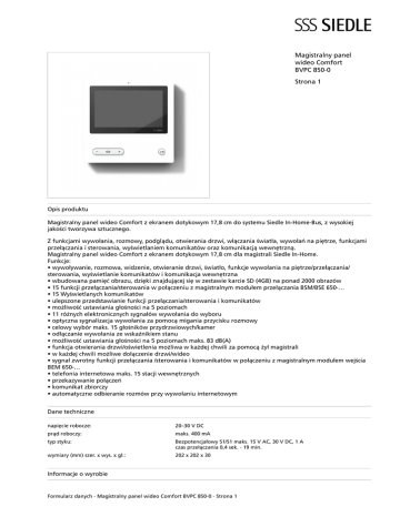 Magistralny panel wideo Comfort BVPC 850-0 Strona 1 Opis produktu Magistralny panel wideo Comfort z ekranem dotykowym 17,8 cm do systemu Siedle In-Home-Bus, z wysokiej jakości tworzywa sztucznego. Z funkcjami wywołania, rozmowy, podglądu, otwierania drzwi, włączania światła, wywołań na piętrze, funkcjami przełączania i sterowania, wyświetlaniem komunikatów oraz komunikacją wewnętrzną. Magistralny panel wideo Comfort z ekranem dotykowym 17,8 cm dla magistrali Siedle In-Home. Funkcje: • wywoływanie, rozmowa, widzenie, otwieranie drzwi, światło, funkcje wywołania na piętrze/przełączania/ sterowania, wyświetlanie komunikatów i komunikacja wewnętrzna • wbudowana pamięć obrazu, dzięki znajdującej się w zestawie karcie SD (4GB) na ponad 2000 obrazów • 15 funkcji przełączania/sterowania w połączeniu z magistralnym modułem przełączania BSM/BSE 650-… • 15 Wyświetlanych komunikatów • ulepszone przedstawianie funkcji przełączania/sterowania i komunikatów • możliwość ustawiania głośności na 5 poziomach • 11 różnych elektronicznych sygnałów wywołania do wyboru • optyczna sygnalizacja wywołania za pomocą migania przycisku rozmowy • celowy wybór maks. 15 głośników przydrzwiowych/kamer • odłączanie wywołania ze wskaźnikiem stanu • możliwość ustawiania głośności na 5 poziomach maks. 83 dB(A) • funkcja otwierania drzwi/oświetlenia możliwa w każdej chwili za pomocą żył magistrali • w każdej chwili możliwe dołączenie drzwi/wideo • sygnał zwrotny funkcji przełączania /sterowania i komunikatów w połączeniu z magistralnym modułem wejścia BEM 650-… • telefonia internetowa maks. 15 stacji wewnętrznych • przekazywanie połączeń • komunikat zbiorczy • automatyczne odbieranie rozmów przy wywołaniu internetowym Dane techniczne napięcie robocze: 20–30 V DC prąd roboczy: maks. 400 mA typ styku: Bezpotencjałowy S1/S1 maks. 15 V AC, 30 V DC, 1 A czas przełączania 0,4 sek. - 19 min. wymiary (mm) szer. x wys. x gł.: 202 x 202 x 30 Informacje o wyrobie Formularz danych - Magistralny panel wideo Comfort BVPC 850-0 - Strona 1 Magistralny panel wideo Comfort BVPC 850-0 Strona 2 Nazwa�artykułu opis�artykułu Kolor/Materiał nr�artykułu BVPC 850-0 A/S Magistralny panel wideo Comfort aluminium/czarny 200044747-00 BVPC 850-0 A/W Magistralny panel wideo Comfort aluminium/biały 200044216-00 BVPC 850-0 E/S Magistralny panel wideo Comfort stal szlachetna/czarny 200044214-00 BVPC 850-0 E/W Magistralny panel wideo Comfort stal szlachetna/biały 200044748-00 BVPC 850-0 EC/S Magistralny panel wideo Comfort chrom/czarny 200044752-00 BVPC 850-0 EC/W Magistralny panel wideo Comfort chrom/biały 200044751-00 BVPC 850-0 EG/S Magistralny panel wideo Comfort Złoty/czarny 200044754-00 BVPC 850-0 EG/W Magistralny panel wideo Comfort złoty/biały 200044753-00 BVPC 850-0 S Magistralny panel wideo Comfort czarny 200044204-00 BVPC 850-0 SH/S Magistralny panel wideo Comfort czarny o wysokim połysku/czarny 200044220-00 BVPC 850-0 SH/W Magistralny panel wideo Comfort czarny o wysokim połysku/biały 200044749-00 BVPC 850-0 W Magistralny panel wideo Comfort biały 200044075-00 BVPC 850-0 WH/S Magistralny panel wideo Comfort biały o wysokim połysku/czarny 200044750-00 BVPC 850-0 WH/W Magistralny panel wideo Comfort biały o wysokim połysku/biały 200044218-00 Formularz danych - Magistralny panel wideo Comfort BVPC 850-0 - Strona 2 Magistralny panel wideo Comfort BVPC 850-0 Strona 3 Osprzęt Nazwa�artykułu opis�artykułu Kolor/Materiał nr�artykułu ZTVP 850-0 E Osprzęt do urządzeń na biurko Stal szlachetna 200044550-00 ZTVP 850-0 S Osprzęt do urządzeń na biurko czarny 200044551-00 ZTVP 850-0 W Osprzęt do urządzeń na biurko biały 200044552-00 Części zamienne Nazwa�artykułu opis�artykułu Kolor/Materiał nr�artykułu BTSV/BFSV/BTCV/BFCV 850-... Element RC In-Home-Bus wideo (3 Szt.) pozostałe 200029965-00 BTSV/BTCV/BFSV/BFCV 850-... Zaciski przyłączeniowe Błękit 200029597-00 Formularz danych - Magistralny panel wideo Comfort BVPC 850-0 - Strona 3 Magistralny panel wideo Comfort BVPC 850-0 Strona 4 Formularz danych - Magistralny panel wideo Comfort BVPC 850-0 - Strona 4 Magistralny panel wideo Comfort BVPC 850-0 Strona 5 Formularz danych - Magistralny panel wideo Comfort BVPC 850-0 - Strona 5 Magistralny panel wideo Comfort BVPC 850-0 Strona 6 Formularz danych - Magistralny panel wideo Comfort BVPC 850-0 - Strona 6 Magistralny panel wideo Comfort BVPC 850-0 Strona 7 Formularz danych - Magistralny panel wideo Comfort BVPC 850-0 - Strona 7 Magistralny panel wideo Comfort BVPC 850-0 Strona 8 Formularz danych - Magistralny panel wideo Comfort BVPC 850-0 - Strona 8 Magistralny panel wideo Comfort BVPC 850-0 Strona 9 Formularz danych - Magistralny panel wideo Comfort BVPC 850-0 - Strona 9 Magistralny panel wideo Comfort BVPC 850-0 Strona 10 BVPS/BVPC 850-0 Magistralny panel wideo Standard/Comfort Informacja o produktach 1,4 MB Pobieranie BVPC 850-0 Magistralny panel wideo Comfort Instrukcja obsługi ZTVP 850-0 osprzęt do urządzeń na biurko Informacja o produktach 26,6 MB Pobieranie 1,6 MB BVPS/BVPC 850-0 Magistralny panel wideo Standard/Comfort Deklaracja Zgodności Pobieranie 816 kB Pobieranie 3 MB Pobieranie Informacja o produktach 78,8 kB Pobieranie Informacja o produktach 796 kB Pobieranie Informacja o produktach 73,6 kB Pobieranie Informacja o produktach 73,8 kB Pobieranie Informacja o produktach 70,2 kB Pobieranie Informacja o produktach 72,7 kB Pobieranie Informacja o produktach 83,7 kB Pobieranie Informacja o produktach 71,4 kB Pobieranie Informacja o produktach 74,8 kB Pobieranie Informacja o produktach 74,5 kB Pobieranie Informacja o produktach 78,9 kB Pobieranie Katalog do zamówień Porównanie modeli paneli wideo Formularz danych - Magistralny panel wideo Comfort BVPC 850-0 - Strona 10