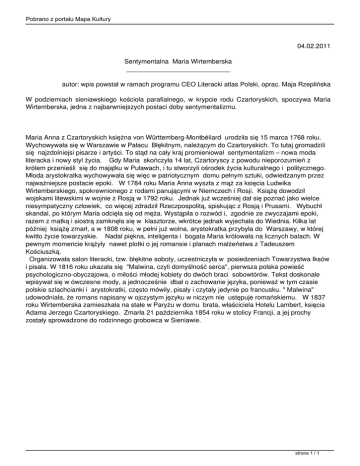 Pobrano z portalu Mapa Kultury 04.02.2011 Sentymentalna Maria Wirtemberska ____________________________ autor: wpis powstał w ramach programu CEO Literacki atlas Polski, oprac. Maja Rzeplińska W podziemiach sieniawskiego kościoła parafialnego, w krypcie rodu Czartoryskich, spoczywa Maria Wirtemberska, jedna z najbarwniejszych postaci doby sentymentalizmu. Maria Anna z Czartoryskich księżna von Württemberg-Montbéliard urodziła się 15 marca 1768 roku. Wychowywała się w Warszawie w Pałacu Błękitnym, należącym do Czartoryskich. To tutaj gromadzili się najzdolniejsi pisarze i artyści. To stąd na cały kraj promieniował sentymentalizm – nowa moda literacka i nowy styl życia. Gdy Maria skończyła 14 lat, Czartoryscy z powodu nieporozumień z królem przenieśli się do majątku w Puławach, i tu stworzyli ośrodek życia kulturalnego i politycznego. Młoda arystokratka wychowywała się więc w patriotycznym domu pełnym sztuki, odwiedzanym przez najważniejsze postacie epoki. W 1784 roku Maria Anna wyszła z mąż za księcia Ludwika Wirtemberskiego, spokrewnionego z rodami panującymi w Niemczech i Rosji. Książę dowodził wojskami litewskimi w wojnie z Rosją w 1792 roku. Jednak już wcześniej dał się poznać jako wielce niesympatyczny człowiek, co więcej zdradził Rzeczpospolitą, spiskując z Rosją i Prusami. Wybuchł skandal, po którym Maria odcięła się od męża. Wystąpiła o rozwód i, zgodnie ze zwyczajami epoki, razem z matką i siostrą zamknęła się w klasztorze, wkrótce jednak wyjechała do Wiednia. Kilka lat później książę zmarł, a w 1808 roku, w pełni już wolna, arystokratka przybyła do Warszawy, w której kwitło życie towarzyskie. Nadal piękna, inteligenta i bogata Maria królowała na licznych balach. W pewnym momencie krążyły nawet plotki o jej romansie i planach małżeństwa z Tadeuszem Kościuszką. Organizowała salon literacki, tzw. błękitne soboty, uczestniczyła w posiedzeniach Towarzystwa Iksów i pisała. W 1816 roku ukazała się "Malwina, czyli domyślność serca", pierwsza polska powieść psychologiczno-obyczajowa, o miłości młodej kobiety do dwóch braci sobowtórów. Tekst doskonale wpisywał się w ówczesne mody, a jednocześnie dbał o zachowanie języka, ponieważ w tym czasie polskie szlachcianki i arystokratki, często mówiły, pisały i czytały jedynie po francusku. " Malwina" udowodniała, że romans napisany w ojczystym języku w niczym nie ustępuje romańskiemu. W 1837 roku Wirtemberska zamieszkała na stałe w Paryżu w domu brata, właściciela Hotelu Lambert, księcia Adama Jerzego Czartoryskiego. Zmarła 21 października 1854 roku w stolicy Francji, a jej prochy zostały sprowadzone do rodzinnego grobowca w Sieniawie. strona 1 / 1