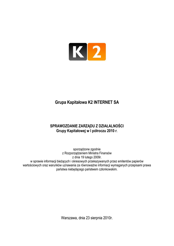 Grupa Kapitałowa K2 INTERNET SA SPRAWOZDANIE ZARZĄDU Z DZIAŁALNOŚCI Grupy Kapitałowej w I półroczu 2010 r. sporządzone zgodnie z Rozporządzeniem Ministra Finansów z dnia 19 lutego 2009r. w sprawie informacji bieżących i okresowych przekazywanych przez emitentów papierów wartościowych oraz warunków uznawania za równoważne informacji wymaganych przepisami prawa państwa niebędącego państwem członkowskim. Warszawa, dnia 23 sierpnia 2010r. Grupa Kapitałowa K2 Internet SA Sprawozdanie Zarządu z działalności Grupy Kapitałowej w I półroczu 2010r. Wszystkie dane przedstawione w tys. PLN o ile nie wskazano inaczej List Prezesa Zarządu K2 Internet SA do Akcjonariuszy, Klientów i Pracowników Szanowni Państwo, Skonsolidowane przychody Grupy K2 Internet SA, w okresie 6 miesięcy zakończonym 30 czerwca 2010r., sięgnęły kwoty 25,5 milionów pln, co oznacza wzrost w stosunku do analogicznego okresu roku ubiegłego o ponad 40%. Zysk netto po pierwszych 6 miesiącach bieżącego roku zamknął się kwotą 590 tys. PLN (w pierwszym półroczu 2009r. spółka odnotowała stratę w wysokości 1 miliona pln). Wynik na poziomie EBITDA wzrósł po pierwszym półroczu do kwoty 1.243 tys. pln (w porównaniu do straty 477 tys. pln w pierwszym półroczu roku ubiegłego). Podkreślić należy, że wzrost ma charakter praktycznie wyłącznie organiczny. Zarząd K2 Internet S.A. spodziewa się, że zrealizowana w zeszłym roku inwestycja w agencję reklamową Brainshop U-Boot sp. z o.o będzie miała bardziej znaczący wpływ na wyniki począwszy od przyszłego roku. Znacząca poprawa wyników finansowych jest konsekwencją wzrostu popytu na usługi Grupy K2 Internet S.A. Internet pozostał najszybciej rosnącym medium reklamowym co przekłada się na wzrost zainteresowania praktycznie wszystkimi usługami oferowanymi przez K2. Dodatkowo, po kryzysowym roku ubiegłym, obserwujemy wśród klientów większą determinację do realizacji projektów, które były wcześniej wstrzymywane lub/i odwoływane. W ramach K2 Internet SA i spółek zależnych utrzymano obsługę wszystkich znaczących klientów. Dodatkowo pierwsze półrocze okazało się być bardzo pomyślne dla Grupy K2 pod względem pozyskanych nowych klientów. Rozpoczęto współpracę z takimi firmami jaki CitiBank, Instytut Wzornictwa Przemysłowego, Whirlpool czy L'Oréal Polska. Patrząc na wyniki finansowe w kontekście naszych wewnętrznych planów jesteśmy zadowoleni z tego co udało się osiągnąć. Pamiętając, że tradycyjnym okresem “żniw” jest dla nas ostatni kwartał wszystko wskazuje na to, że zrealizujemy publicznie składane deklaracje dotyczące wyników całego roku. Poza sukcesami ekonomicznymi K2 zostało pierwszy raz w historii docenione mocno na arenie międzynarodowej. Jako jedna z 397 firm, które wstępnie przeszły selekcję w ramach konkursu European Business Awards, Spółka otrzymała (wraz z 2 innymi firmami z Polski) tytuł Ruban d'Honneur i będzie walczyć w odbywającym się w Paryżu finale o tytuł Europejskiej Firmy Roku. Szybko rozwijają się nowe przedsięwzięcia Grupy K2. Spółka system3.pl, która oferuje technologię i usługi marketingu afiliacyjnego (partnerskiego) osiągnęła po pierwszych 6 miesiącach 2010r. przychody na poziomie blisko 1,5 mln (wzrost o 700% rok do roku) i jest rentowna na poziomie operacyjnym. W ramach spółki platforma3.pl, która oferuje usługi i technologie e-mail marketingu, zakończono z sukcesem budowę własnego systemu i rozpoczęto świadczenie usług. Spółka platforma3.pl - nasza ostatnia inwestycja powinna osiągnąć rentowność do końca roku. K2 oczekuje, że w kolejnych latach tak system3.pl jak i platforma3.pl będą w znaczącym stopniu budować wartość Grupy. W ostatnich miesiącach podjęto także decyzję o pozyskaniu dodatkowego finansowania dla Audioteka.pl (MDPL sp. z o.o) poprzez prywatną emisję i upublicznienie akcji spółki na New Connect. Wybrano doradcę finansowego a spółka rozpoczęła proces przekształcania formy prawnej. Janusz Żebrowski Prezes Zarządu 2 Grupa Kapitałowa K2 Internet SA Sprawozdanie Zarządu z działalności Grupy Kapitałowej w I półroczu 2010r. Wszystkie dane przedstawione w tys. PLN o ile nie wskazano inaczej SPIS TREŚCI 1. WSTĘP .......................................................................................................................................................................... 4 2. PODSTAWOWE WIELKOŚCI EKONOMICZNO – FINANSOWE ORAZ CZYNNIKI MAJĄCE ZNACZĄCY WPŁYW NA DZIAŁALNOŚĆ GOSPODARCZĄ I OSIĄGNIĘTE WYNIKI .................................................................................... 4 3. OPIS ISTOTNYCH CZYNNIKÓW RYZYKA I ZAGROŻEŃ ........................................................................................... 6 4. CHARAKTERYSTYKA ZEWNĘTRZNYCH I WEWNĘTRZNYCH CZYNNIKÓW ISTOTNYCH DLA ROZWOJU SPÓŁKI ORAZ OPIS PERSPEKTYW ROZWOJU DZIAŁALNOŚCI GOSPODARCZEJ............................................... 8 5. INWESTYCJE ................................................................................................................................................................ 9 6. DOSTAWCY, ODBIORCY, GŁÓWNE RYNKI ZBYTU .................................................................................................. 9 7. POZOSTAŁE INFORMACJE ....................................................................................................................................... 11 7.1 Informacje o zaciągniętych kredytach. ......................................................................................................................... 11 7.2 Informacje o udzielonych pożyczkach, gwarancjach, poręczeniach. ........................................................................... 11 8. ZMIANY W PODSTAWOWYCH ZASADACH ZARZĄDZANIA SPÓŁKĄ. ................................................................... 12