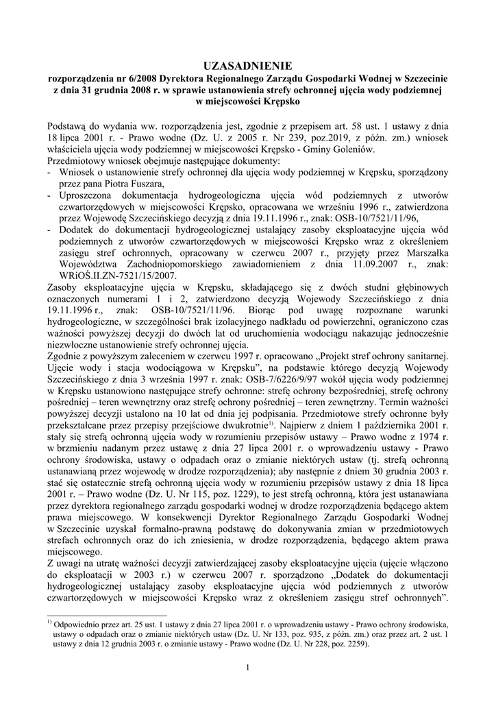 UZASADNIENIE rozporządzenia nr 6/2008 Dyrektora Regionalnego Zarządu Gospodarki Wodnej w Szczecinie z dnia 31 grudnia 2008 r. w sprawie ustanowienia strefy ochronnej ujęcia wody podziemnej w miejscowości Krępsko Podstawą do wydania ww. rozporządzenia jest, zgodnie z przepisem art. 58 ust. 1 ustawy z dnia 18 lipca 2001 r. - Prawo wodne (Dz. U. z 2005 r. Nr 239, poz.2019, z późn. zm.) wniosek właściciela ujęcia wody podziemnej w miejscowości Krępsko - Gminy Goleniów. Przedmiotowy wniosek obejmuje następujące dokumenty: - Wniosek o ustanowienie strefy ochronnej dla ujęcia wody podziemnej w Krępsku, sporządzony przez pana Piotra Fuszara, - Uproszczona dokumentacja hydrogeologiczna ujęcia wód podziemnych z utworów czwartorzędowych w miejscowości Krępsko, opracowana we wrześniu 1996 r., zatwierdzona przez Wojewodę Szczecińskiego decyzją z dnia 19.11.1996 r., znak: OSB-10/7521/11/96, - Dodatek do dokumentacji hydrogeologicznej ustalający zasoby eksploatacyjne ujęcia wód podziemnych z utworów czwartorzędowych w miejscowości Krępsko wraz z określeniem zasięgu stref ochronnych, opracowany w czerwcu 2007 r., przyjęty przez Marszałka Województwa Zachodniopomorskiego zawiadomieniem z dnia 11.09.2007 r., znak: WRiOŚ.II.ZN-7521/15/2007. Zasoby eksploatacyjne ujęcia w Krępsku, składającego się z dwóch studni głębinowych oznaczonych numerami 1 i 2, zatwierdzono decyzją Wojewody Szczecińskiego z dnia 19.11.1996 r., znak: OSB-10/7521/11/96. Biorąc pod uwagę rozpoznane warunki hydrogeologiczne, w szczególności brak izolacyjnego nadkładu od powierzchni, ograniczono czas ważności powyższej decyzji do dwóch lat od uruchomienia wodociągu nakazując jednocześnie niezwłoczne ustanowienie strefy ochronnej ujęcia. Zgodnie z powyższym zaleceniem w czerwcu 1997 r. opracowano „Projekt stref ochrony sanitarnej. Ujęcie wody i stacja wodociągowa w Krępsku”, na podstawie którego decyzją Wojewody Szczecińskiego z dnia 3 września 1997 r. znak: OSB-7/6226/9/97 wokół ujęcia wody podziemnej w Krępsku ustanowiono następujące strefy ochronne: strefę ochrony bezpośredniej, strefę ochrony pośredniej – teren wewnętrzny oraz strefę ochrony pośredniej – teren zewnętrzny. Termin ważności powyższej decyzji ustalono na 10 lat od dnia jej podpisania. Przedmiotowe strefy ochronne były przekształcane przez przepisy przejściowe dwukrotnie 1) . Najpierw z dniem 1 października 2001 r. stały się strefą ochronną ujęcia wody w rozumieniu przepisów ustawy – Prawo wodne z 1974 r. w brzmieniu nadanym przez ustawę z dnia 27 lipca 2001 r. o wprowadzeniu ustawy - Prawo ochrony środowiska, ustawy o odpadach oraz o zmianie niektórych ustaw (tj. strefą ochronną ustanawianą przez wojewodę w drodze rozporządzenia); aby następnie z dniem 30 grudnia 2003 r. stać się ostatecznie strefą ochronną ujęcia wody w rozumieniu przepisów ustawy z dnia 18 lipca 2001 r. – Prawo wodne (Dz. U. Nr 115, poz. 1229), to jest strefą ochronną, która jest ustanawiana przez dyrektora regionalnego zarządu gospodarki wodnej w drodze rozporządzenia będącego aktem prawa miejscowego. W konsekwencji Dyrektor Regionalnego Zarządu Gospodarki Wodnej w Szczecinie uzyskał formalno-prawną podstawę do dokonywania zmian w przedmiotowych strefach ochronnych oraz do ich zniesienia, w drodze rozporządzenia, będącego aktem prawa miejscowego. Z uwagi na utratę ważności decyzji zatwierdzającej zasoby eksploatacyjne ujęcia (ujęcie włączono do eksploatacji w 2003 r.) w czerwcu 2007 r. sporządzono „Dodatek do dokumentacji hydrogeologicznej ustalający zasoby eksploatacyjne ujęcia wód podziemnych z utworów czwartorzędowych w miejscowości Krępsko wraz z określeniem zasięgu stref ochronnych”. 1) Odpowiednio przez art. 25 ust. 1 ustawy z dnia 27 lipca 2001 r. o wprowadzeniu ustawy - Prawo ochrony środowiska, ustawy o odpadach oraz o zmianie niektórych ustaw (Dz. U. Nr 133, poz. 935, z późn. zm.) oraz przez art. 2 ust. 1 ustawy z dnia 12 grudnia 2003 r. o zmianie ustawy - Prawo wodne (Dz. U. Nr 228, poz. 2259). 1 W dodatku tym, wskazując na brak izolacji warstwy wodonośnej i niewielką głębokość jej występowania, podkreślono konieczność ustanowienia nowej strefy ochronnej ujęcia. Do określenia obszaru, na którym czas migracji potencjalnych zanieczyszczeń do ujęcia jest mniejszy od 25 lat posłużono się zarówno metodą Wysslinga jak i metodą graficzną. Do ostatecznego wyznaczenia zasięgu strefy ochronnej przyjęto, jako bardziej wiarygodny, obszar wyznaczony metodą graficzną. Dodatek ten został przyjęty bez zastrzeżeń przez Marszałka Województwa Zachodniopomorskiego zawiadomieniem z dnia 11 września 2007 r., znak: WRiOŚ.II.ZN-7521/15/2007. W związku z wyznaczeniem nowych granic obszaru zasilania ujęcia i skorygowaniem granic strefy ochronnej ujęcia, we wrześniu 2007 r. sporządzono wniosek o ustanowienie strefy ochronnej ujęcia w Krępsku, w nowych granicach oraz wprowadzenie na jej obszarze zakazów i nakazów przystosowanych do aktualnie obowiązujących przepisów. Ostateczne granice strefy ochronnej dostosowano do granic geodezyjnych i elementów topograficznych terenu takich jak drogi czy rowy. Ze względu na znaczne rozmiary niektórych działek, zwłaszcza leśnych, dokonano ich podziału przy włączaniu do terenu ochrony pośredniej ujęcia. Zważywszy na konieczność zapewnienia odpowiedniej jakości ujmowanej wody przeznaczonej do zaopatrzenia ludności, ze względu na ochronę zasobów wodnych, a także mając na uwadze dostosowanie zakazów i ograniczeń wprowadzonych na obszarze strefy do obecnie obowiązujących przepisów, zasadne jest ustanowienie nowej strefy ochronnej ujęcia wody w Krępsku, przy jednoczesnym zniesieniu dotychczasowych stref ochronnych ustanowionych decyzją Wojewody Szczecińskiego z dnia 3 września 1997 r. znak: OSB-7/6226/9/97. Szczegółowe uzasadnienie treści rozpo
