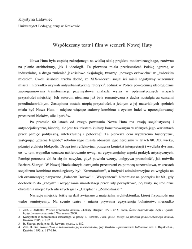 Krystyna Latawiec Uniwersytet Pedagogiczny w Krakowie Współczesny teatr i film w scenerii Nowej Huty Nowa Huta była częścią zakrojonego na wielką skalę projektu modernizacyjnego, zarówno na planie architektury, jak i ideologii. Ta pierwsza miała przekształcać Polskę agrarną w industrialną, a druga zmieniać jakościowo aksjologię, tworząc „nowego człowieka” w „świeckim mieście”. Gwoli ścisłości trzeba dodać, że XIX-wieczni socjaliści mieli negatywny wizerunek miasta i nierzadko używali antyurbanistycznej retoryki 1. Jednak w Polsce powojennej ideologicznie zaprogramowana transformacja przemysłowa znalazła wyraz w optymistycznych wizjach przyszłości miejskiej. Ich autorom nieznana już była romantyczna z ducha nostalgia za czasami przedindustrialnym. Zastąpiona została utopią przyszłości, a jednym z jej materialnych spełnień miała być Nowa Huta – miejsce wiążące stalowy kombinat z życiem ludzi w uporządkowanej przestrzeni bloków, ulic i parków. Po przeszło 60 latach od swego powstania Nowa Huta ma swoją socjalistyczną i antysocjalistyczną historię, ale jest też tekstem kultury konstruowanym w różnych jego wariantach przez pamięć polityczną, intelektualną i potoczną2. Ta pierwsza ceni wydarzenia historyczne, zastępując „czarną legendę” robotniczego miasta obrazem jego heroizmu w latach 80. XX wieku, później etykietą blokpolis. Druga jest refleksyjna, poszerza kontekst interpretacji i wydłuża dystans, co w tym wypadku oznacza nakierowanie uwagi na egzystencjalny aspekt praktyk artystycznych. Pamięć potoczna zbliża się do nawyku, gdyż powiela wzory, „odgrywa przeszłość”, jak mówiła Barbara Skarga3. W Nowej Hucie służyła oswajaniu przestrzeni za pomocą nazewnictwa, w czasach socjalizmu kombinat metalurgiczny był „Krematorium”, a budynki administracyjne ze względu na ich ornamentykę nazywano „Pałacem Dożów” i „Watykanem”. Natomiast na początku lat 80., gdy dochodziło do „zadym” i rozpędzania manifestacji przez siły porządkowe, pojawiły się ironiczne określenia miejsc tych ulicznych gier - „Gazplac” i „Zomostrasse”4. Narracje miejskie ściśle są dziś związane z materialną architektoniką, której fizyczność ma walor semiotyczny. Na scenie teatru - miasta prywatna egzystencja bohaterów, nierzadko 1 Zob. J. Jedlicki, Proces przeciwko miastu, „Teksty Drugie” 1991, nr 5; idem, Świat zwyrodniały. Lęki i wyroki krytyków nowoczesności, Warszawa 2000. 2 Korzystam z rozróżnienia zawartego w pracy E. Rewers, Post- polis. Wstęp do filozofii ponowoczesnego miasta, Kraków 2005, s. 182. 3 B. Skarga, podaję za: E. Rewers, op.cit., s. 182. 4 Zob. D. Gut, Nowa Huta w świadomości jej mieszkańców, [w]: Kraków – przestrzenie kulturowe, red. J. Bujak et al., Kraków 1993, s. 117-136. pozbawionych rysów indywidualnych, wpisana jest w wielkomiejską architekturę niczym w scenografię symbolicznego polis. Może to być mieszkanie w bloku, pokój hotelowy czy podziemne przejście, żeby wymienić kilka przykładów charakterystycznych dla współczesnego dramatu i teatru5. Sztuka oswaja urbanistyczny pejzaż, w którym fizycznie funkcjonuje teatr, a zarazem nawiązuje do wizualnych i akustycznych właściwości współczesnej kultury medialnej, skądinąd też przecież wyrosłej na gruncie wielkomiejskim. Zatem łączy realistycznie osadzoną akcję z estetyką wirtualną, przenosząc widza za sprawą muzyki czy projekcji filmowych w światy wyobrażone. Na ile odgrywane na scenie zdarzenie przybliża do realnie doświadczanej przestrzeni, to już zależy od intensywności przekazu, angażującego emocje aktorów i odbiorców. Jeśli miejsce jest tak konkretne jak betonowy i stalowy krajobraz Nowej Huty, to sugestia unaocznionego stawania się spektaklu „tu i teraz” wydaje się bardzo przekonująca. Sprzyja jej otoczenie pozbawione właściwej dla teatru ornamentyki, gdyż scena została przeniesiona do typowo robotniczej dzielnicy. W jednym z jej wnętrz znalazł siedzibę teatr Łaźnia Nowa – są to pomieszczenia byłych warsztatów szkoły mechanicznej na osiedlu Szkolnym. Tutaj od 2004 roku zrealizowano kilkanaście przedstawień, jak też projektów, które w zamierzeniu Bartosza Szydłowskiego polegają na „wykraczaniu poza dyskurs wypowiedzi scenicznej” w stronę „kreowania wiarygodnej sytuacji spotkania”6. Zaangażowanie teatru w miejsce, w którym się znalazł po przeprowadzce z krakowskiego Kazimierza, znajduje wyraz w podejmowaniu tematów nowohuckich, we włączaniu do gry mieszkańców dzielnicy, która dziś nie wydaje się ani robotnicza, ani heroiczna, ale wręcz znużona i zapomniana. Ożywieniu tożsamości lokalnej służyć mają wspólne przedsięwzięcia teatru i nowohucian. Są wśród nich: adaptacja prozy Cukier w normie Sławka Shuty (2005), miniatury kilku autorów (Paweł Jurek, Paweł Sala, Małgorzata Owsiany, Radosław Dobrowolski, Jacek Papis), wystawione pod wspólnym tytułem Mieszkam tu (2005), Król Edyp (2005), inscenizacja podręcznika Stanisława Iłowskiego Vademecum teatru amatorskiego (2006) z udziałem nowohuckich aktorów – amatorów, Moja Molinezja (2010) na podstawie zbioru reportaży Nowohucka telenowela Renaty Radłowskiej. W betonowych pomieszczeniach dawnych warsztatów, na nierównej podłodze, pośród długich korytarzy, na ścianach których wiszą jeszcze ostrzeżenia o bezpieczeństwie pracy, spektakl teatralny staje się rodzajem społecznego działania. Biorą w nim udział aktorzy profesjonalni i amatorzy, mieszkańcy dzielnicy, inspirujący autorów sztuk opowieściami związanymi z nowohuckim życiem bądź z przedmiotami, które przywołują zapomniane już historie. Ponadto filmowe wnętrza, jak zauważył Jacek Sieradzki7, sprzyjają epickiemu rozmachowi, ten zaś pozwala wyjść poza ramy konwencji artystycznej w stronę realnie doświadczanej egzystencji. 5 Więcej na