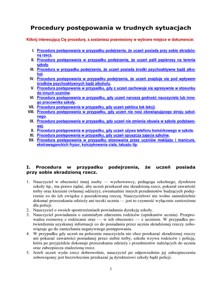 Procedury postępowania w trudnych sytuacjach Kliknij interesującą Cię procedurę, a zostaniesz przeniesiony w wybrane miejsce w dokumencie: I. Procedura postępowania w przypadku podejrzenia, że uczeń posiada przy sobie skradzioną rzecz. II. Procedura postępowania w przypadku podejrzenia, że uczeń palił papierosy na terenie szkoły. III. Procedura w przypadku podejrzenia, że uczeń posiada środki psychoaktywne bądź alkohol. IV. Procedura postępowania w przypadku podejrzenia, że uczeń znajduje się pod wpływem środków psychoaktywnych bądź alkoholu. V. Procedura postępowania w przypadku, gdy z uczeń zachowuje się agresywnie w stosunku do innych uczniów. VI. Procedura postępowania w przypadku, gdy uczeń narusza godność nauczyciela lub innego pracownika szkoły. VII. Procedura postępowania w przypadku, gdy uczeń zakłóca tok lekcji. VIII. Procedura postępowania w przypadku, gdy uczeń nie nosi obowiązującego stroju szkolnego. IX. Procedura postępowania w przypadku, gdy uczeń nie zmienia obuwia w szkole podstawowej. X. Procedura postępowania w przypadku, gdy uczeń używa telefonu komórkowego w szkole. XI. Procedura postępowania w przypadku, gdy uczeń opuszcza zajęcia szkolne. XII. Procedura postępowania w przypadku stosowania przez uczniów makijażu i manicure, ekstrawaganckich fryzur, kolczykowania ciała, tatuażu itp. I. Procedura w przypadku przy sobie skradzioną rzecz. podejrzenia, że uczeń posiada 1. Nauczyciel w obecności innej osoby — wychowawcy, pedagoga szkolnego, dyrektora szkoły itp., ma prawo żądać, aby uczeń przekazał mu skradzioną rzecz, pokazał zawartość torby oraz kieszeni (własnej odzieży), ewentualnie innych przedmiotów budzących podejrzenie co do ich związku z poszukiwaną rzeczą. Nauczycielowi nie wolno samodzielnie dokonać przeszukania odzieży ani teczki ucznia — jest to czynność wyłącznie zastrzeżona dla policji. 2. Nauczyciel o swoich spostrzeżeniach powiadamia dyrekcję szkoły. 3. Nauczyciel powiadamia o zaistniałym zdarzeniu rodziców (opiekunów ucznia). Przeprowadza rozmowę z rodzicami oraz — w ich obecności — z uczniem. W przypadku potwierdzenia uzyskanej informacji co do posiadania przez ucznia skradzionej rzeczy zobowiązuje go do zaniechania negatywnego postępowania. 4. W przypadku gdy uczeń na polecenie nauczyciela nie chce przekazać skradzionej rzeczy ani pokazać zawartości posiadanej przez siebie torby, szkoła wzywa rodziców i policję, która po przyjeździe dokonuje przeszukania odzieży i przedmiotów należących do ucznia oraz zabezpiecza znalezioną rzecz. 5. Jeżeli uczeń wyda rzecz dobrowolnie, nauczyciel po odpowiednim jej zabezpieczeniu zobowiązany jest bezzwłocznie przekazać ją dyrektorowi szkoły bądź policji. 1 6. Całe zdarzenie nauczyciel dokumentuje, sporządzając możliwie dokładną notatkę z ustaleń, wskazując własne spostrzeżenia. 7. Uczeń zostaje ukarany zgodnie z przyjętym wewnątrzszkolnym systemem oceniania szkoły podstawowej lub gimnazjum. II. Procedura w przypadku podejrzenia, że uczeń palił papierosy na terenie szkoły. 1. W przypadku gdy zachodzi uzasadnione podejrzenie, że uczeń palił papierosy na terenie szkoły, nauczyciel lub inny pracownik szkoły, który ma takie podejrzenie, ma obowiązek zgłoszenia tego faktu do dyrekcji szkoły. 2. W obecności pracownika szkoły wymienionego w pkt. 1 procedury oraz wychowawcy klasy i pedagoga szkolnego uczeń odbywa rozmowę wstępną. A. Jeżeli zdarzenie palenia papierosów miało miejsce po raz pierwszy w przypadku tego ucznia: a) wychowawca informuje telefonicznie rodziców (opiekunów prawnych) ucznia o zdarzeniu, b) uczeń podpisuje ze szkołą kontrakt indywidualny, zawierający dalsze zasady współpracy stron, c) uczeń zostaje ukarany zgodnie z przyjętym wewnątrzszkolnym systemem oceniania szkoły podstawowej lub gimnazjum. B. Jeżeli zdarzenie palenia papierosów miało miejsce po raz kolejny w przypadku tego ucznia: a) wychowawca informuje telefonicznie rodziców (opiekunów prawnych) ucznia o zdarzeniu, b) uczeń zostaje ukarany zgodnie z przyjętym wewnątrzszkolnym systemem oceniania szkoły podstawowej lub gimnazjum, c) uczeń ma obniżoną semestralną ocenę zachowania o co najmniej jeden stopień, d) rodzice (prawni opiekunowie) i uczeń podpisują ze szkołą kontrakt indywidualny, zawierający dalsze zasady współpracy stron, e) jeżeli uczeń ma przydzielonego kuratora sądowego, zostaje on także poinformowany o zaistniałych okolicznościach. III. Procedura w przypadku podejrzenia, że uczeń posiada środki psychoaktywne bądź alkohol. 1. W przypadku gdy zachodzi uzasadnione podejrzenie, że uczeń posiada środki psychoaktywne bądź alkohol, nauczyciel lub pracownik niepedagogiczny szkoły, który ma takie podejrzenie, ma obowiązek odizolowania ucznia od reszty klasy ze względu na bezpieczeństwo. 2. Nauczyciel w obecności innej osoby (wychowawcy klasy, pedagoga szkolnego, dyrektora szkoły itp.) ma prawo żądać, aby uczeń przekazał mu tę substancję, pokazał zawartość 2 torby szkolnej oraz kieszeni (we własnej odzieży), ewentualnie inne przedmioty budzące podejrzenie co do ich związku z poszukiwaną substancją. 3. Nauczyciel o swoich spostrzeżeniach powiadamia dyrektora szkoły oraz rodziców (opiekunów ucznia) i wzywa ich do natychmiastowego stawiennictwa. W przypadku, gdy uczeń, mimo wezwania, odmawia przekazania nauczycielowi substancji i pokazania zawartości teczki, dyrektor szkoły wzywa policję, która przeszukuje odzież i przedmioty należące do ucznia oraz zabezpiecza znalezioną substancję i zabiera ją do ekspertyzy. 4. Jeżeli uczeń wyda substancję dobrowolnie, nauczyciel, po odpowiednim jej zabezpieczeniu, zobowiązany jest bezzwłocznie przekazać ją do jednostki policji. Wcześniej próbuje ustalić, w jaki sposób i od kogo uczeń nabył substancję. Całe zdarzenie nauczyciel dokumentuje, sporządza