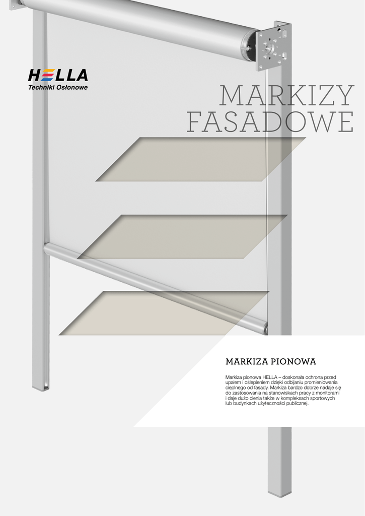 MARKIZY FASADOWE MARKIZA pionowa Markiza pionowa HELLA – doskonała ochrona przed upałem i oślepieniem dzięki odbijaniu promieniowania cieplnego od fasady. Markiza bardzo dobrze nadaje się do zastosowania na stanowiskach pracy z monitorami i daje dużo cienia także w kompleksach sportowych lub budynkach użyteczności publicznej. 7543 0034_PL Markiza pionowa Markiza pionowa SM 100 mm 02/2015 od góry do dołu Markiza bardzo dobrze nadaje się do zastosowania na stanowiskach pracy wyposażonych w monitory i sprosta także wymogom stawianym dużym markizom stosowanym w kompleksach sportowych lub budynkach użyteczności publicznej. W zależności od potrzeby konsole można zamontować do sufitu lub do ściany. . 116 mm Modele SM 101 Markiza pionowa z prowadnicami SM 102 Markiza pionowa typu markizoleta SM 103 Markiza pionowa z prowadnicą linkową Kątownik napinający zamontowany do ściany/profilu okna Kątownik napinający zamontowany z boku Uchwyt napinający zamontowany do podłoża Naciągi Wymiary / rozmiary skrzynek Typ SM Wysokość [mm] 100 Wymiary maksymalne Głębokość [mm] 116 SM 101 SM 102 SM 103 Korba i napęd elektryczny Montaż zewnętrzny SM 103 Napęd korbowy i elektryczny Montaż wewnętrzny Szerokość maksymalna [mm] 3500 3000 5000 5000 Wysokość maksymalna [mm] 4500 4500 3000 4000 9 9 9 20 Maksymalna powierzchnia [m2] Prawo wprowadzania zmian zastrzeżone. www.hella.info