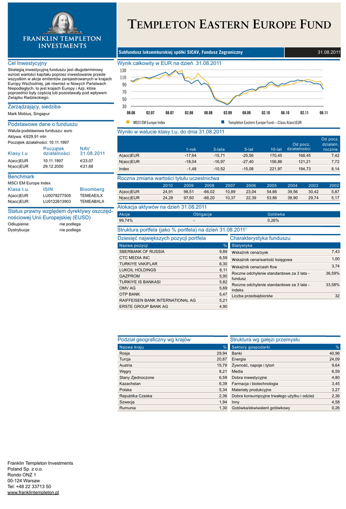 TEMPLETON EASTERN EUROPE FUND 31.08.2011 Subfundusz luksemburskiej spółki SICAV, Fundusz Zagraniczny Cel Inwestycyjny Wynik całkowity w EUR na dzień 31.08.2011 Strategią inwestycyjną funduszu jest długoterminowy wzrost wartości kapitału poprzez inwestowanie przede wszystkim w akcje emitentów zarejestrowanych w krajach Europy Wschodniej, jak również w Nowych Państwach Niepodległych, to jest krajach Europy i Azji, które poprzednio były częścią lub pozostawały pod wpływem Związku Radzieckiego. Zarządzający, siedziba Mark Mobius, Singapur 06&,(0(XURSH,QGH[ Podstawowe dane o funduszu Waluta podstawowa funduszu: euro Aktywa: €629,91 mln Początek działalności: 10.11.1997 7HPSOHWRQ(DVWHUQ(XURSH)XQG¥&ODVV$DFF(85 Wyniki w walucie klasy t.u. do dnia 31.08.2011 Klasy t.u Początek działalności NAV 31.08.2011 A(acc)EUR N(acc)EUR 10.11.1997 29.12.2000 €23,07 €21,68 Benchmark A(acc)EUR N(acc)EUR Index 1-rok -17,64 -18,04 3-lata -15,71 -16,97 5-lat -25,56 -27,40 10-lat 170,45 156,86 -1,48 -10,52 -15,08 221,97 Od pocz. działalności Od pocz. działaln. rocznie. 168,45 121,21 7,42 7,72 194,73 8,14 Roczna zmiana wartości tytułu uczestnictwa MSCI EM Europe Index Klasa t.u. ISIN Bloomberg A(acc)EUR N(acc)EUR LU0078277505 LU0122613903 TEMEAEILX TEMEABXLX Status prawny względem dyrektywy oszczędnościowej Unii Europejskiej (EUSD) Odkupienie: Dystrybucja: nie podlega nie podlega A(acc)EUR N(acc)EUR 2010 24,91 24,28 2009 98,51 97,60 2008 -66,02 -66,20 2007 10,89 10,37 2005 54,66 53,86 2004 39,56 38,90 2003 30,42 29,74 2002 5,87 5,17 Alokacja aktywów na dzień 31.08.2011 Akcje 99,74% Obligacje - Gotówka 0,26% Struktura portfela (jako % portfela) na dzień 31.08.20111 Dziesięć największych pozycji portfela Nazwa pozycji SBERBANK OF RUSSIA CTC MEDIA INC TURKIYE VAKIFLAR LUKOIL HOLDINGS GAZPROM TURKIYE IS BANKASI OMV AG OTP BANK RAIFFEISEN BANK INTERNATIONAL AG ERSTE GROUP BANK AG Charakterystyka funduszu % 9,89 6,59 6,30 6,11 5,90 5,82 5,69 5,47 5,21 4,90 Podział geograficzny wg krajów Nazwa kraju Rosja Turcja Austria Węgry Stany Zjednoczone Kazachstan Polska Republika Czeska Szwecja Rumunia Franklin Templeton Investments Poland Sp. z o.o. Rondo ONZ 1 00-124 Warsaw Tel: +48 22 33713 50 www.franklintempleton.pl 2006 23,04 22,39 Statystyka wskaźnik cena/zysk wskaźnik cena/wartość księgowa wskaźnik cena/cash flow 7,43 1,00 3,74 Roczne odchylenie standardowe za 3 lata fundusz 36,59% Roczne odchylenie standardowe za 3 lata indeks 33,58% Liczba przedsiębiorstw 32 Struktura wg gałęzi przemysłu % 29,94 20,87 15,79 8,21 6,59 6,39 5,34 2,36 1,94 1,30 Sektory gospodarki Banki Energia Żywność, napoje i tytoń Media Dobra inwestycyjne Farmacja i biotechnologia Materiały produkcyjne Dobra konsumpcyjne trwałego użytku i odzież Inny Gotówka/ekwiwalent gotówkowy % 40,96 24,09 9,64 6,59 4,80 3,45 3,27 2,36 4,58 0,26 T EMPLETON E ASTERN E UROPE F UND 31.08.2011 Zastrzeżenie prawne - Templeton Eastern Europe Fund Prawa autorskie © 2011. Franklin Templeton Investments. Wszelkie prawa zastrzeżone. Niniejszy dokument został sporządzony wyłącznie do celów informacyjnych i nie stanowi porady prawnej ani podatkowej ani oferty sprzedaży jakichkolwiek udziałów ani zaproszenia do zapisów na tytuły uczestnictwa jakiegokolwiek funduszu luksemburskiego SICAV Franklin Templeton Investment Funds (zwanego dalej „Funduszem”). Żadnej z części niniejszego dokumentu nie należy traktować jako porady inwestycyjnej . Zapisy na tytuły uczestnictwa mogą być dokonywane wyłącznie w oparciu o aktualny, pełny lub skrócony prospekt informacyjny Funduszu, ostatnie roczne sprawozdanie finansowe opatrzone opinią biegłego rewidenta oraz ostatnie półroczne sprawozdanie finansowe, o ile zostało opublikowane później niż sprawozdanie roczne. Ceny tytułów uczestnictwa i dochody uzyskiwane z tytułów uczestnictwa mogą ulec zmniejszeniu lub zwiększeniu, a inwestorzy mogą nie odzyskać całej zainwestowanej kwoty. Wyniki historyczne nie gwarantują wyników przyszłych. Zmiany kursów walut mogą wpływać na wartość inwestycji zagranicznych. Inwestowanie w fundusz denominowany w walucie obcej także wiąże się z ryzykiem zmian kursów wymiany. Inwestowanie w tytuły uczestnictwa Funduszu wiąże się z ryzykiem opisanym w pełnym i skróconym prospekcie informacyjnym Funduszu. Ryzyko związane z inwestycjami na rynkach wschodzących może być większe niż ryzyko na rynkach rozwiniętych. Inwestycje w instrumenty pochodne wiążą się z określonym rodzajem ryzyka szczegółowo opisanym w prospekcie informacyjnym Funduszu. Tytuły uczestnictwa Funduszu nie mogą być bezpośrednio ani pośrednio oferowane ani sprzedawane obywatelom ani rezydentom Stanów Zjednoczonych Ameryki Północnej. Tytuły uczestnictwa Funduszu nie są dostępne na każdym terytorium podlegającym dowolnej jurysdykcji, a osoby ubiegające się o pozyskanie tytułów uczestnictwa powinny sprawdzić możliwość nabycia tytułów uczestnictwa u lokalnego przedstawiciela Franklin Templeton przed planowaniem inwestycji. Wszelkie badania i analizy uwzględnione w niniejszym dokumencie zostały opracowane na potrzeby i do wyłącznych celów Franklin Templeton Investments i są udostępniane w niniejszym dokumencie wyłącznie do celów informacyjnych. Odniesienia do konkretnych gałęzi przemysłu, sektorów czy spółek mają charakter ogólnych informacji i nie muszą odzwierciedlać rzeczywistego zaangażowania funduszu w jakimkolwiek momencie. Przed podjęciem jakichkolwiek decyzji inwestycyjnych, zalecamy skonsultowanie się z doradcą finansowym. Kopię najnowszej wersji prospektu informacyjnego, rocznego sprawozdania finansowego lub półrocznego sprawozdania finansowego, o ile zostało opublikowane po publikacji ostatniego sprawozdania rocznego, można znaleźć na naszej stronie internetowej www.franklintempleton.pl lub otrzymać za darmo od Franklin Templeton Investments Poland Sp