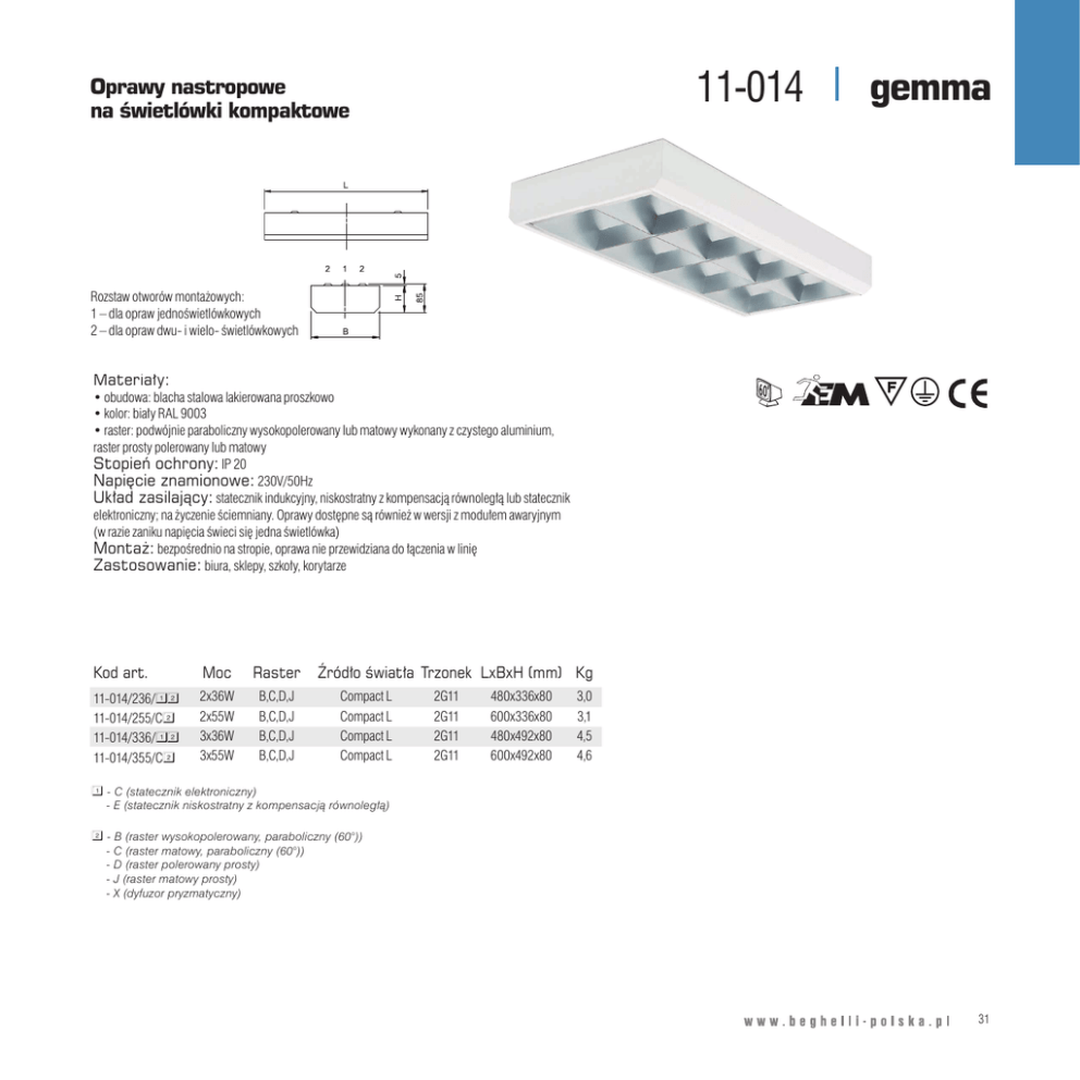 11-014 Oprawy nastropowe na świetlówki kompaktowe gemma Rozstaw otworów montażowych: Rozstaw otworów montażowych: – dla opraw jednoświetlówkowych 1 – dla1 opraw jednoświetlówkowych – dla opraw i wieloświetlówkowych 2 – dla2 opraw dwu-dwui wieloświetlówkowych Materiały: Materiały: • obudowa: blacha stalowa lakierowana proszkowo • obudowa: stalowa lakierowana proszkowo • kolor: białyblacha RAL 9003 • kolor: biały RAL 9003 • raster: podwójnie paraboliczny wysokopolerowany lub matowy wykonany z czystego aluminium, • raster: podwójnie paraboliczny wysokopolerowany lub matowy wykonany z czystego aluminium, raster prosty polerowany lub matowy raster prosty polerowany IP lub20matowy Stopień ochrony: Napięcieochrony: znamionowe: Stopień IP 20 230V/50Hz Układ zasilający: statecznik indukcyjny, niskostratny z kompensacją równoległą lub statecznik Napięcie znamionowe: 230V/50Hz elektroniczny; na życzenie ściemniany. Oprawy dostępne są również w wersji z modułem awaryjnym Układ zasilający: statecznik indukcyjny, niskostratny z kompensacją równoległą lub statecznik (w razie zaniku napięcia świeci się jedna świetlówka) elektroniczny; na życzenie ściemniany. Oprawy nie dostępne są również w wersjiwzlinię modułem awaryjnym Montaż: bezpośrednio na stropie, oprawa przewidziana do łączenia (w razie zaniku napięciabiura, świecisklepy, się jedna świetlówka) Zastosowanie: szkoły, korytarze Montaż: bezpośrednio na stropie, oprawa nie przewidziana do łączenia w linię Zastosowanie: biura, sklepy, szkoły, korytarze Kod art. Moc Raster Kod art. 11-014/236/ Moc 2x36W Raster światła Trzonek (mm) Kg B,C,D,J Źródło Compact L 2G11 LxBxH 480x336x80 3,0 11-014/236/12 2x36W 2x55W 11-014/255/C 11-014/255/C 2 2x55W 3x36W 11-014/336/ 11-014/336/12 3x36W 3x55W 11-014/355/C 11-014/355/C 2 3x55W B,C,D,J B,C,D,J B,C,D,J B,C,D,J B,C,D,J B,C,D,J B,C,D,J Źródło światła Trzonek LxBxH (mm) Kg Compact CompactL L Compact CompactL L Compact CompactL L Compact L 2G11 2G11 2G11 2G11 2G11 2G11 2G11 480x336x80 600x336x80 600x336x80 480x492x80 480x492x80 600x492x80 600x492x80 3,0 3,1 3,4,5 1 4,5 4,6 4,6 - C (statecznik elektroniczny) 1 -- C (statecznik elektroniczny) E (statecznik niskostratny z kompensacją równoległą) - E (statecznik niskostratny z kompensacją równoległą) 2 -- B wysokopolerowany, paraboliczny paraboliczny (60°)) (60°)) B (raster (raster wysokopolerowany, (raster matowy, matowy, paraboliczny paraboliczny (60°)) (60°)) -- C C (raster (raster polerowany polerowany prosty) prosty) -- D D (raster matowy prosty) prosty) -- JX (raster (dyfuzormatowy pryzmatyczny) - X (dyfuzor pryzmatyczny) 31