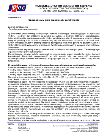PRZEDSIĘBIORSTWO ENERGETYKI CIEPLNEJ SPÓŁKA Z OGRANICZONĄ ODPOWIEDZIALNOŚCIĄ 21-500 Biała Podlaska, ul. Pokoju 26 Załącznik nr 5. Szczegółowy opis przedmiotu zamówienia Zakres zamówienia Do zakresu zamówienia należy: 1) demontaż (rozebranie) istniejącego komina stalowego, wolnostojącego, o wysokości 47,5m, średnicy Dz= 2020mm ze zwężką na wylocie o średnicy 1800mm, posiadającego jeden wlot kanałów spalin na poziomie 1,35m, składającego się z 8 segmentów połączonych ze sobą za pomocą śrub. Komin przytwierdzony jest do fundamentu za pomocą 24 śrub M48. Komin wyposażony jest w drabinę włazową zewnętrzną oraz dwie galerie na poziomie 22,5m i 42,5m. Komin jest wyposażony w instalację świateł przeszkodowych z lampami oraz instalację odgromową. Zdemontowane segmenty należy zeskładować w miejscu wskazanym przez Zamawiającego wg załączonego planu sytuacyjnego. Demontowanie komina należy rozpocząć po przeniesieniu przez operatorów anten telefonii komórkowej. Demontaż przeprowadzić w taki sposób aby nie uszkodzić kontenera technologicznego telefonii komórkowej znajdującego się na poziomie terenu, przy cokole fundamentu. 2) zaprojektowanie, wykonanie i budowa komina stalowego wg poniższych warunków Zadaniem nowego komina jest odprowadzanie spalin z n/w kotłów wodnych rusztowych: 1 wodny kocioł rusztowy typu WR- 25 o mocy cieplnej 32,0 MW 1 wodny kocioł rusztowy typu WR-25 o mocy cieplnej 29,07 MW 1 wodny kocioł rusztowy typu WR -12 o mocy cieplnej 12 MW (nowobudowany) Nominalna ilość spalin suchych (przy 6% O2) ok. 20 – 150 tys. m3/h. Szczegółową sumaryczną ilość określi projektant do w/w kotłów. Rozproszenie spalin na wysokości nie mniejszej jak 47,5 m tak, aby były dotrzymane wszystkie wymagania dotyczące dopuszczalnych stężeń substancji zanieczyszczających powietrze nad poziomem ziemi i nad poziomem otaczającej zabudowy wynikające z aktualnych przepisów prawnych. Spaliny do komina doprowadzone mają być dotychczasowymi kanałami, z istniejącym wlotem do komina. Wraz z budową komina należy wykonać nowy czopuch oraz kompensator łączący kanał spalin, niwelujący różnice wydłużalności cieplnej. Osprzętem stalowym komina mają być dwie galerie oraz ciąg drabin stalowych na całej wysokości komina. Galeria dolna na wysokości +22,5m nad terenem oraz górna na wysokości +42,5 m. Na galerii dolnej, w miejscach wskazanych przez Zamawiającego, mają być zamontowane króćce do pomiarów emisji zanieczyszczeń. Na galerii górnej dodatkowo mają być zamontowane anteny operatorów komórkowych i internetu bezprzewodowego. Dopuszcza się inne wysokości, które będą wskazane przez projektanta. Wykonawca zaprojektuje i wykona również drabinki kablowe dla potrzeb telefonii komórkowej tak, aby nie osłabiały one płaszcza poszycia komina jak również jego rdzenia. Komin wybudować na istniejącym fundamencie z wykorzystaniem istniejących kotew obecnego komina. Wykonawca własnym staraniem stwierdzi, czy stan techniczny kotew jest dobry i spełnią one swoje zadanie. Trzon stalowy komina składał się będzie z segmentów scalonych ze sobą za pomocą połączeń Centrala: Sekretariat: Fax: e-mail: www: 083-342-55-98 083-342-58-99 083-342-59-49 083-342-59-88 [email protected] http://www.pecbp.pl NIP 537-00-01-649 REGON 030124339 Sąd Rejonowy Lublin-Wschód w Lublinie z/s w Świdniku, VI Wydział Gospodarczy KRS 0000086154 Wysokość kapitału zakładowego 13 578 500,00 zł. Bank: Spółdzielczy w Białej Podlaskiej Nr konta: 45 8025 0007 0023 8706 2000 0010 kołnierzowych, skręcanych na śruby. Jako uszczelnienie połączeń kołnierzowych przewidzieć ułożenie warstwy silikonu termoodpornego do 6000 C. Trzon komina winien być wykonany z blach stalowych o grubości pierwszego segmentu u podstawy nie mniejszej jak 16mm. Pozostałe segmenty komina mogą posiadać stopniowane grubości, z tym że minimalna grubość segmentu nie może być mniejsza jak 10mm. Cały komin powinien być wykonany ze stali o gatunku nie gorszym ( parametry wytrzymałościowe) niż stal S355J2H wg normy PNEN 10025-1:2007. Drabinę z koszem osłonowym oraz dwie galerie spocznikowe, wykonać ze stali gatunku nie gorszym niż S235. w/g Zabezpieczenie antykorozyjne zewnętrznej powierzchni trzonu komina wykonać technologii ; - Czyszczenie strumieniowo-ścierne do stopnia czystości SA 21/2(wg PN-ISO 8501-1) Odtłuszczenie powierzchni (wg ISO 12944-4) 1 x emalia termoodporna - podkładowa , 2 x emalia termoodporna - nawierzchniowa o łącznej grubości powłok 120µm. Elementy stalowe wyposażenia komina zabezpieczone zostaną antykorozyjnie odpowiednio do kategorii C4 (wysoka). Elementy wyposażenia pokryć zestawem farb epoksydowych wykonanych w/g technologii - Czyszczenie strumieniowo-ścierne do stopnia czystości SA 21/2( wg PN-ISO 8501-1) 1 x gruntowanie farbą epoksydowa chemoodporną 2 x emalia poliuretanowa chemoodporna o łącznej grubości 200µm. ( kolor srebrny) Powłoki malarskie wewnątrz komina powinny być tak dobrane aby były odporne na warunki opisane w parametrach spalin. Trzon komina na całej powierzchni zaizolować termicznie wełną mineralną o gr.100mm, na siatce stalowej ocynkowanej. Osłonę izolacji termicznej wykonać z blachy aluminiowej gr. 1,0mm. Blachy poszycia osłony mocować do trzonu na pierścieniach stalowych. Wełnę mineralną zabezpieczyć przed osuwaniem. Komin powinien posiadać, na spodzie łączącym się z podstawą fundamentową, uszczelnione plastycznie podłoże jako miejsce na skropliny, które za pomocą pompy wydostawane będą w celu ich neutralizacji. Miejscem wydostawania skroplin może być wykonany otwór wziernikowy. Ponadto komin wyposażony powinien być w otwór wyczystkowy do usuwania resztek cząstek stałych znajdujących się w spalinach. Należy wykonać pomiar temperatury spalin z kotła na czopuchu przed wejściem do komina i na jego wylocie