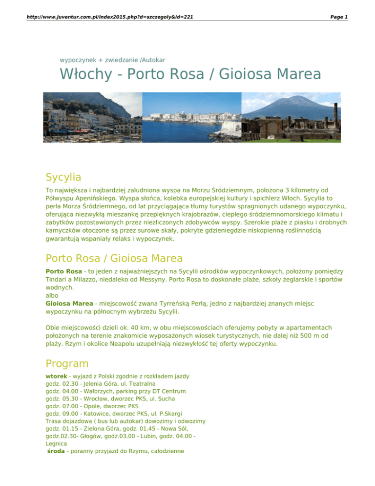 http://www.juventur.com.pl/index2015.php?d=szczegoly&id=221 Page 1 wypoczynek + zwiedzanie /Autokar Włochy - Porto Rosa / Gioiosa Marea Sycylia To największa i najbardziej zaludniona wyspa na Morzu Śródziemnym, położona 3 kilometry od Półwyspu Apenińskiego. Wyspa słońca, kolebka europejskiej kultury i spichlerz Włoch. Sycylia to perła Morza Śródziemnego, od lat przyciągająca tłumy turystów spragnionych udanego wypoczynku, oferująca niezwykłą mieszankę przepięknych krajobrazów, ciepłego śródziemnomorskiego klimatu i zabytków pozostawionych przez niezliczonych zdobywców wyspy. Szerokie plaże z piasku i drobnych kamyczków otoczone są przez surowe skały, pokryte gdzieniegdzie niskopienną roślinnością gwarantują wspaniały relaks i wypoczynek. Porto Rosa / Gioiosa Marea Porto Rosa - to jeden z najważniejszych na Sycylii ośrodków wypoczynkowych, położony pomiędzy Tindari a Milazzo, niedaleko od Messyny. Porto Rosa to doskonałe plaże, szkoły żeglarskie i sportów wodnych. albo Gioiosa Marea - miejscowość zwana Tyrreńską Perłą, jedno z najbardziej znanych miejsc wypoczynku na północnym wybrzeżu Sycylii. Obie miejscowości dzieli ok. 40 km, w obu miejscowościach oferujemy pobyty w apartamentach położonych na terenie znakomicie wyposażonych wiosek turystycznych, nie dalej niż 500 m od plaży. Rzym i okolice Neapolu uzupełniają niezwykłość tej oferty wypoczynku. Program wtorek - wyjazd z Polski zgodnie z rozkładem jazdy godz. 02.30 - Jelenia Góra, ul. Teatralna godz. 04.00 - Wałbrzych, parking przy DT Centrum godz. 05.30 - Wrocław, dworzec PKS, ul. Sucha godz. 07.00 - Opole, dworzec PKS godz. 09.00 - Katowice, dworzec PKS, ul. P.Skargi Trasa dojazdowa ( bus lub autokar) dowozimy i odwozimy godz. 01.15 - Zielona Góra, godz. 01.45 - Nowa Sól, godz.02.30- Głogów, godz.03.00 - Lubin, godz. 04.00 Legnica środa - poranny przyjazd do Rzymu, całodzienne http://www.juventur.com.pl/index2015.php?d=szczegoly&id=221 zwiedzanie Rzymu i Watykanu ( bez autokaru) zakwaterowanie, nocleg czwartek - śniadanie, przejazd i pobyt na Monte Cassino, przejazd w okolice Sorrento, zakwaterowanie, nocleg piątek - śniadanie, zwiedzanie POMPEI - zwiedzanie ruin starożytnego miasta, zniszczonego w trakcie wybuchu Wezuwiusza w 79 r n.e, 9-cio godzinna wycieczka na Capri, wieczorny powrót z Capri, nocny przejazd do Villa San Giovanni sobota - przepłynięcie na Sycylię, przejazd do Porto Rosa lub Gioiosa Marea zakwaterowanie, nocleg ............. - pobyt 7 noclegów, wypoczynek, plażowanie oraz wycieczka do Katanii, Taorminy i podnóża Etny sobota - przejazd do Palermo - zwiedzanie, wieczorne wypłynięcie do Genui niedziela - wieczorne przepłynięcie do Genui, wyjazd do kraju poniedziałek - przyjazd do kraju w godzinach popołudniowych Świadczenia - 1 nocleg w okolicach Rzymu - 1 nocleg w okolicach Neapolu, hotele, pokoje 2-osob. z łazienkami - 2 śniadania - 7 noclegów na Sycylii, apartamenty dwupokojowe, po 4 osoby - prom na trasie Villa San Giovanni - Messina - prom na trasie Palermo - Genua, kabiny 4-osobowe, wewnętrzne z łazienkami - opieka pilota - ubezpieczenie od kosztów leczenia za granicą KL do 10.000 Euro i od następstw nieszczęśliwych wypadków NNW do 7.000 PLN Zakwaterowanie - Porto Rosa / Gioiosa Marea Apartamenty w budynkach nie wyższych niż dwupiętrowe, dwupokojowe (2x2) z dwoma dodatkowymi miejscami do spania w salonie, aneks kuchenny, łazienka, balkon lub taras Uwaga: należy zabrać ze sobą pościel i środki czystości. hotele ** w okolicach Rzymu, Neapolu, pokoje 2-osobowe z łazienkami. Transport - Autokar - autokar lux (klimatyzacja, WC, barek, DVD) - przejazd przez Czechy, Austrię nr grupy termin miejsce w app. 4-osobowym Page 2 http://www.juventur.com.pl/index2015.php?d=szczegoly&id=221 Page 3 JUV-07/17 30.05-12.06.17 1 740,- ZAREZERWUJ JUV-08/17 05.09-18.09.17 1 740,- ZAREZERWUJ 1. Wykupienie i opłacenie imprezy w całości do 31 marca 2017 r. to dodatkowy upust w wysokości 100 zł/os od miejsca podstawowego. 1. Cena nie zawiera kosztu biletów do zwiedzanych obiektów, wjazdu autokaru do Rzymu ani biletów na metro w Rzymie, przewodnika po Rzymie i po Pompejach ani stateczku na Capri 2. Cena nie zawiera opłaty klimatycznej, ok. 1 Euro/os./dzień - płatne w gotówce na miejscu w hotelach. 3. Dodatkowa opłata 99 euro/os. - promy 4. Dopłata do apartamentu jednopokojowego dla 2 osób - 250 PLN/os. 5. Dopłata na Turystyczny Fundusz Gwarancyjny - 10 PLN/os.