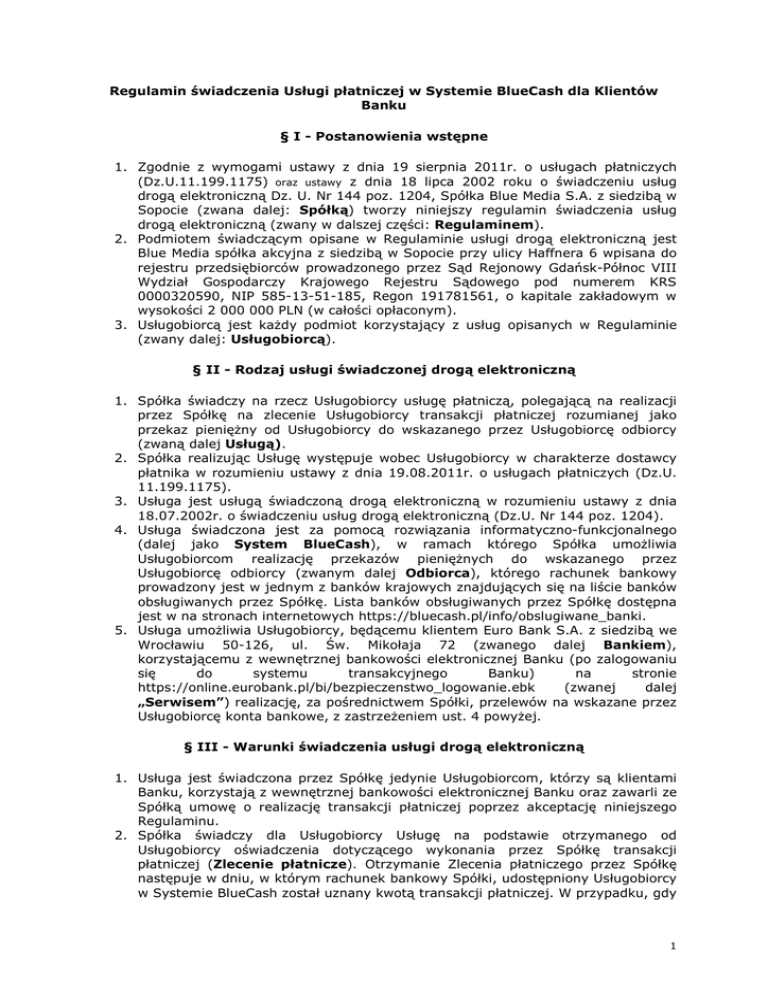 Regulamin świadczenia Usługi płatniczej w Systemie BlueCash dla Klientów Banku § I - Postanowienia wstępne 1. Zgodnie z wymogami ustawy z dnia 19 sierpnia 2011r. o usługach płatniczych (Dz.U.11.199.1175) oraz ustawy z dnia 18 lipca 2002 roku o świadczeniu usług drogą elektroniczną Dz. U. Nr 144 poz. 1204, Spółka Blue Media S.A. z siedzibą w Sopocie (zwana dalej: Spółką) tworzy niniejszy regulamin świadczenia usług drogą elektroniczną (zwany w dalszej części: Regulaminem). 2. Podmiotem świadczącym opisane w Regulaminie usługi drogą elektroniczną jest Blue Media spółka akcyjna z siedzibą w Sopocie przy ulicy Haffnera 6 wpisana do rejestru przedsiębiorców prowadzonego przez Sąd Rejonowy Gdańsk-Północ VIII Wydział Gospodarczy Krajowego Rejestru Sądowego pod numerem KRS 0000320590, NIP 585-13-51-185, Regon 191781561, o kapitale zakładowym w wysokości 2 000 000 PLN (w całości opłaconym). 3. Usługobiorcą jest każdy podmiot korzystający z usług opisanych w Regulaminie (zwany dalej: Usługobiorcą). § II - Rodzaj usługi świadczonej drogą elektroniczną 1. Spółka świadczy na rzecz Usługobiorcy usługę płatniczą, polegającą na realizacji przez Spółkę na zlecenie Usługobiorcy transakcji płatniczej rozumianej jako przekaz pieniężny od Usługobiorcy do wskazanego przez Usługobiorcę odbiorcy (zwaną dalej Usługą). 2. Spółka realizując Usługę występuje wobec Usługobiorcy w charakterze dostawcy płatnika w rozumieniu ustawy z dnia 19.08.2011r. o usługach płatniczych (Dz.U. 11.199.1175). 3. Usługa jest usługą świadczoną drogą elektroniczną w rozumieniu ustawy z dnia 18.07.2002r. o świadczeniu usług drogą elektroniczną (Dz.U. Nr 144 poz. 1204). 4. Usługa świadczona jest za pomocą rozwiązania informatyczno-funkcjonalnego (dalej jako System BlueCash), w ramach którego Spółka umożliwia Usługobiorcom realizację przekazów pieniężnych do wskazanego przez Usługobiorcę odbiorcy (zwanym dalej Odbiorca), którego rachunek bankowy prowadzony jest w jednym z banków krajowych znajdujących się na liście banków obsługiwanych przez Spółkę. Lista banków obsługiwanych przez Spółkę dostępna jest w na stronach internetowych https://bluecash.pl/info/obslugiwane_banki. 5. Usługa umożliwia Usługobiorcy, będącemu klientem Euro Bank S.A. z siedzibą we Wrocławiu 50-126, ul. Św. Mikołaja 72 (zwanego dalej Bankiem), korzystającemu z wewnętrznej bankowości elektronicznej Banku (po zalogowaniu się do systemu transakcyjnego Banku) na stronie https://online.eurobank.pl/bi/bezpieczenstwo_logowanie.ebk (zwanej dalej „Serwisem”) realizację, za pośrednictwem Spółki, przelewów na wskazane przez Usługobiorcę konta bankowe, z zastrzeżeniem ust. 4 powyżej. § III - Warunki świadczenia usługi drogą elektroniczną 1. Usługa jest świadczona przez Spółkę jedynie Usługobiorcom, którzy są klientami Banku, korzystają z wewnętrznej bankowości elektronicznej Banku oraz zawarli ze Spółką umowę o realizację transakcji płatniczej poprzez akceptację niniejszego Regulaminu. 2. Spółka świadczy dla Usługobiorcy Usługę na podstawie otrzymanego od Usługobiorcy oświadczenia dotyczącego wykonania przez Spółkę transakcji płatniczej (Zlecenie płatnicze). Otrzymanie Zlecenia płatniczego przez Spółkę następuje w dniu, w którym rachunek bankowy Spółki, udostępniony Usługobiorcy w Systemie BlueCash został uznany kwotą transakcji płatniczej. W przypadku, gdy 1 Zlecenie płatnicze zostało otrzymane przez Spółkę w dniu nie będącym dla Spółki Dniem Roboczym, przyjmuje się, że Zlecenie płatnicze zostało otrzymane w pierwszym Dniu Roboczym następującym po tym dniu, za wyjątkiem przypadków, gdy ze względu na dni i godziny księgowań wewnętrznych banków prowadzących rachunki bankowe Spółki, otrzymanie Zlecenia płatniczego w dniu nie będącym dla Spółki Dniem Roboczym jest możliwe. 3. Dniami Roboczymi u Spółki są wszystkie dni tygodnia, w godzinach od 04.00 do 23.00, z wyłączeniem dni ustawowo wolnych od pracy. 4. Spółka realizuje Usługę niezwłocznie, nawet w czasie do 10 minut od otrzymania zlecenia płatniczego, nie później jednak niż do końca następnego Dnia Roboczego po otrzymaniu zlecenia płatniczego, zgodnie z ust. 2 powyżej. W przypadku, gdy Spółka otrzymała zlecenie płatnicze w dniu nie będącym dla Spółki Dniem Roboczym, a ze względu na dni i godziny księgowań wewnętrznych banków prowadzących rachunki bankowe Spółki, realizacja transakcji płatniczej na podstawie otrzymanego Zlecenia płatniczego jest w tym dniu możliwa, Spółka zrealizuje transakcję płatniczą do końca dnia, w którym otrzymała Zlecenie płatnicze. W przypadku, gdy zgodnie ze zdaniem poprzedzającym, realizacja transakcji płatniczej nie jest możliwa w dniu otrzymania Zlecenia płatniczego, Spółka zrealizuje transakcję płatniczą do końca pierwszego Dnia Roboczego następującego po tym dniu. 5. Aby Zlecenie płatnicze mogło zostać prawidłowo wykonane przez Spółkę, Usługobiorca dostarcza Spółce następujące informacje: imię, nazwisko, adres email, kwotę transakcji płatniczej, nazwę/ imię i nazwisko Odbiorcy przelewu, numer rachunku bankowego Odbiorcy środków, tytuł przelewu. Autoryzacja transakcji płatniczej następuje z momentem autoryzacji polecenia przelewu za pomocą kodu autoryzacyjnego pochodzącego od Banku. 6. Spółka realizuje transakcję płatniczą wyłącznie w walucie polskiej (PLN). 7. Spółka będzie realizować Usługę z zastrzeżeniem, że: a) Maksymalna kwota pojedynczej transakcji płatniczej zlecanej przez jednego Usługobiorcę wynosi nie więcej niż 5 000 zł oraz b) liczba transakcji nie będzie większa niż 5 dziennie. Spółka będzie uprawniona do odmowy realizacji Usługi w wypadku, gdy Usługobiorca zleci realizację transakcji płatniczej, która spowodowałaby przekroczenie przysługuj