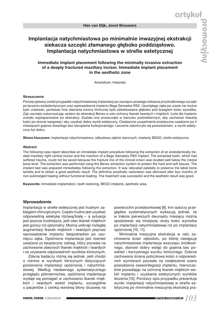 Han van Dijk, Joost Brouwers Implantacja natychmiastowa po minimalnie inwazyjnej ekstrakcji siekacza szczęki złamanego głęboko poddziąsłowo. Implantacja natychmiastowa w strefie estetycznej Immediate implant placement following the minimally invasive extraction of a deeply fractured maxillary incisor. Immediate implant placement in the aesthetic zone Amersfoort, Holandia Streszczenie Poniżej opisany został przypadek natychmiastowej implantacji po usunięciu prawego siekacza przyśrodkowego szczęki po leczeniu endodontycznym oraz wprowadzenia implantu Bego Semados RSX. Usuniętego zęba po urazie nie można było uratować, ponieważ linia złamania korony klinicznej była zlokalizowana głęboko pod brzegiem kości wyrostka. Ząb usunięto wykorzystując system do ekstrakcji Benex w celu ochrony tkanek twardych i miękkich. Łoże dla implantu zostało wypreparowane po ekstrakcji. Zostało ono przesunięte w kierunku podniebiennym, aby zachować blaszkę kości po stronie wargowej i aby uzyskać dobry wynik estetyczny. Ostateczne uzupełnienie protetyczne osadzono po 4 miesiącach gojenia otwartego bez obciążenia funkcjonalnego. Leczenie zakończyło się powodzeniem, a wynik estetyczny był dobry. Słowa kluczowe: implantacja natychmiastowa, odbudowa zębów siecznych, implanty BEGO, strefa estetyczna. Abstract The following case report describes an immediate implant procedure following the extraction of an endodontically treated maxillary right central incisor and the insertion of a Bego Semados RSX implant. The extracted tooth, which had suffered trauma, could not be saved because the fracture line of the clinical crown was located well below the crestal bone level. The extraction was performed using the Benex extraction system to protect the hard and soft tissues. The implant bed was prepared immediately following the extraction. It was relocated palatally to preserve the labial bone lamella and to obtain a good aesthetic result. The definitive prosthetic restoration was delivered after four months of non-submerged healing without functional loading. The treatment was successful and the aesthetic result was good. Keywords: immediate implantation, tooth restoring, BEGO implants, aesthetic area. Wprowadzenie Implantacja w strefie estetycznej jest trudnym zabiegiem chirurgicznym. Często trudno jest uzyskać odpowiednią estetykę różową/białą – a sytuacja jest jeszcze trudniejsza, jeśli stan tkanek miękkich jest gorszy niż optymalny. Można uniknąć rozległej augmentacji tkanek miękkich i twardych poprzez wprowadzenie implantu bezpośrednio po usunięciu zęba. Opóźniona implantacja jest również uważana za bezpieczny zabieg, który pozwala na zachowanie obecnych tkanek miękkich i twardych i na uzyskanie odpowiednich wyników klinicznych. Zdania badaczy różnią się jednak, jeśli chodzi o różnice w wynikach klinicznych dotyczących porównania implantacji opóźnionej i natychmiastowej. Według niedawnego systematycznego przeglądu piśmiennictwa, opóźniona implantacja wydaje się pomagać w zachowaniu tkanek miękkich i twardych wokół implantu, szczególnie u pacjentów z cienką warstwą błony śluzowej na DENTAL FORUM /1/2016/XLIV powierzchni przedsionkowej [9]. Inni autorzy przeglądów systematycznych wykazują jednak, że w trakcie pierwszych dwunastu miesięcy można spodziewać się mniejszej utraty kości wyrostka po implantacji natychmiastowej niż po implantacji opóźnionej [10, 11]. Minimalnie inwazyjna ekstrakcja w celu zachowania ścian zębodołu, po której następuje natychmiastowa implantacja wszczepu śródkostnego, stanowi dobry wstęp do gojenia bez powikłań i korzystnego wyniku klinicznego. Dobrze zachowana ściana policzkowa kości o odpowiednich wymiarach pozwala na zwiększenie szans powodzenia osseointegracji implantu, równocześnie pozwalając na ochronę tkanek miękkich wokół implantu i uzyskanie estetycznych wyników leczenia [12]. Poniższy opis przypadku prezentuje wyniki implantacji natychmiastowej w strefie estetycznej po minimalnie inwazyjnej ekstrakcji praARTYKUŁ PROMOCYJNY 103 promocyjny artykuł Han van Dijk, Joost Brouwers wego siekacza przyśrodkowego szczęki i dodatkowe zabiegi argumentacyjne przeprowadzone po 4 miesiącach otwartego gojenia bez obciążenia funkcjonalnego. Opis przypadku i procedura zabiegu Pacjent (lat 38) zgłosił się w celu odtworzenia prawego siekacza przyśrodkowego szczęki (11), który uległ urazowi i był wcześniej leczony endodontycznie. W zębach po leczeniu endodontycznym obserwuje się zwiększone ryzyko złamania ze względu na ich kruchość w porównaniu do zębów żywych, szczególnie w obecności sił ścinających [5]. Adhezyjne wkłady koronowo-korzeniowe wykonane z włókna szklanego zapewniają większą stabilność niż konwencjonalne cementowane wkłady korzeniowe czy stabilność przypadków, w których nie zastosowano wkładów [6]. W opisywanym przypadku ząb nie został odbudowany z wykorzystaniem wkładu korzeniowego. Uraz, któremu uległ ząb 11, spowodował złamanie w górnej 1/3 korzenia. Omawiany ząb tymczasowo połączono z zębami 12 i 21 w miejscu za pomocą materiału kompozytowego po wytrawieniu, w celu stabilizacji korony klinicznej. Brzeg dziąsłowy uległ przesunięciu o ok. 5 mm w porównaniu do zęba przeciwstawnego – 21, podczas gdy ułożenie dwóch brodawek nie uległo zmianie dzięki dobrze zachowanej przegrodzie w okolicy stycznej. Na rtg wykonanym na tej samej wizycie nie stwierdzono istotnych nieprawidłowości (Rycina 1). Na zdjęciu, które zostało wywołane, zauważono cienką linię złamania poziomego przebiega- jącą w poprzek korzenia, zlokalizowaną ok. 2 mm poniżej brzegu kości wyrostka (Rycina 2). Na rtg nie stwierdzono objawów zapalenia tkanek okołowierzchołkowych. Preparacja okrężnej obręczy z tkanek zęba o grubości min. 2 mm w celu zapewnienia powodzenia leczenia protetycznego za pomocą wkładu k