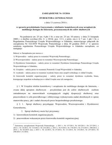 ZARZĄDZENIE Nr 15/2016 DYREKTORA GENERALNEGO z dnia 13 czerwca 2016 r. w sprawie przydzielania i korzystania z telefonów komórkowych oraz urządzeń do mobilnego dostępu do Internetu, przeznaczonych do celów służbowych Na podstawie art. 25 ust. 4 pkt 1 lit. e oraz art. 25 ust. 10 ustawy z dnia 21 listopada 2008 r. o służbie cywilnej (Dz. U. z 2014r. poz. 1111, z późn. zm.) i § 7 ust. 1 pkt 1 lit. e Regulaminu Pomorskiego Urzędu Wojewódzkiego w Gdańsku, stanowiącego załącznik do zarządzenia Nr 322/2010 Wojewody Pomorskiego z dnia 30 grudnia 2010 r.1 w sprawie ustalenia regulaminu Pomorskiego Urzędu Wojewódzkiego w Gdańsku zarządzam, co następuje: Ilekroć w Zarządzeniu jest mowa o: 1) Wojewodzie – należy przez to rozumieć Wojewodę Pomorskiego; 2) Wicewojewodzie – należy przez to rozumieć Wicewojewodę Pomorskiego; 3) Dyrektorze Generalnym – należy przez to rozumieć Dyrektora Generalnego Pomorskiego Urzędu Wojewódzkiego w Gdańsku; 4) Urzędzie – należy przez to rozumieć Pomorski Urząd Wojewódzki w Gdańsku; 5) wydziale – należy przez to rozumieć wydział, biuro oraz zespół wchodzący w skład Urzędu; 6) kierownik komórki organizacyjnej – należy przez to rozumieć dyrektora wydziału, biura, kierującego zespołem wchodzącym w skład Urzędu oraz ich zastępców; § 1. W Urzędzie telefon komórkowy i urządzenie do mobilnego dostępu do Internetu, zwane dalej sprzętem służbowym – przydzielane jest do celów służbowych zatrudnionym na stanowiskach wymagających ciągłej dyspozycji osobom służbowej oraz pracownikom w celu prawidłowego i efektywnego wykonywania zadań określonych w opisie stanowiska pracy, jak i zadań zleconych przez bezpośredniego przełożonego. § 2. 1. Sprzęt służbowy przysługuje: Wojewodzie, Wicewojewodzie i Dyrektorowi Generalnemu, 2. Sprzęt służbowy może być przyznany: 1) kierownikom komórek organizacyjnych; 2) pracownikom wskazanym przez kierownika komórki organizacyjnej. 1 Zmieniony zarządzeniami Wojewody Pomorskiego: z 2011 r. Nr 157/2011, Nr 185/2011 i Nr 237/2011, z 2012 r. Nr 14/2012, Nr 114/2012 i Nr 253/2012, z 2013 r. Nr 9/2013, Nr 170/2013, Nr 273/2013 i 390/2013, z 2014 r. Nr 83/2014 oraz z 2015 r. Nr 22/2015, Nr 47/2015, Nr 111/2015, Nr 153/2015, Nr 257/2015, Nr 298/2015 i 51/2016. § 3. Z wnioskiem o wydanie sprzętu służbowego: 1) dla Wojewody i Wicewojewody, Dyrektor Biura Wojewody występuje do Dyrektora Generalnego; 2) Dyrektor Generalny występuje z wnioskiem do Wojewody; 3) osoby wymienione w § 2 ust. 2 pkt 1 występują z wnioskiem do Dyrektora Generalnego; 4) osoby wymienione w § 2 ust. 2 pkt 2 występują z wnioskiem do Dyrektora Generalnego po uzyskaniu zgody kierownika komórki organizacyjnej; § 4. 1. Zabrania się wykorzystywania sprzętu służbowego do celów prywatnych. 2. Urząd może weryfikować bilingi rozmów oraz usług dodatkowych. § 5. Miesięczny limit finansowy połączeń służbowych, w tym transferu danych: 1) dla Wojewody, Wicewojewody ustala Dyrektor Generalny w porozumieniu z tymi osobami; 2) dla Dyrektora Generalnego ustala Wojewoda; 3) dla osób wymienionych w § 2 ust. 2 pkt 2 i 3 ustala indywidualnie Dyrektor Generalny w zależności od potrzeb wynikających z realizowanych zadań i możliwości finansowych Urzędu. § 6. 1. Szczegółowe zasady użytkowania telefonu komórkowego wykorzystywanego do celów służbowych w Urzędzie, określa „Umowa użyczenia telefonu komórkowego, stanowiącego składnik mienia Pomorskiego Urzędu Wojewódzkiego w Gdańsku”, zawierana z uprawnioną osobą przez Dyrektora Wydziału Administracyjno – Gospodarczego - wzór umowy stanowi załącznik nr 1do zarządzenia. 2. Szczegółowe zasady użytkowania urządzenia do mobilnego dostępu do Internetu wykorzystywanego do celów służbowych w Urzędzie, określa „Umowa użyczenia urządzenia do mobilnego dostępu do Internetu, stanowiącego składnik mienia Pomorskiego Urzędu”, Wojewódzkiego w Gdańsku” zawierana z uprawnioną osobą przez Dyrektora Wydziału Administracyjno – Gospodarczego - wzór umowy stanowi załącznik nr 2 do zarządzenia. § 7. Traci moc zarządzenie nr 18/2011 Dyrektora Generalnego Pomorskiego Urzędu Wojewódzkiego w Gdańsku z dnia 24 maja 2011 r. w sprawie zasad przydzielania i korzystania z telefonów komórkowych przeznaczonych do celów służbowych. § 8. Zarządzenie wchodzi z dniem podpisania. DYREKTOR GENERALNY Krzysztof Maciej Retyk Załącznik nr 1 do zarządzenia nr 15 /2016 Dyrektora Generalnego PUW w Gdańsku z dnia 13 czerwca 2016 r. w sprawie przydzielania i korzystania z telefonów komórkowych oraz urządzeń do mobilnego dostępu do Internetu, przeznaczonych do celów służbowych. . Umowa użyczenia Nr …/…….. telefonu komórkowego, stanowiącego składnik mienia Pomorskiego Urzędu Wojewódzkiego w Gdańsku zawarta w dniu ………………. r. pomiędzy Pomorskim Urzędem Wojewódzkim w Gdańsku, zwanym dalej Użyczającym, reprezentowanym przez: ……………………………………… Dyrektora Wydziału Administracyjno - Gospodarczego a ……………………. …………………………… , zwanym dalej Biorącym do używania. §1 Użyczający użycza Biorącemu do używania telefon komórkowy oraz kartę SIM z numerem abonenckim………………….., do celów służbowych, zwane dalej przedmiotem użyczenia, zgodnie z protokołem przekazania stanowiącym załącznik nr 1 do umowy. §2 Użyczający przekazuje Biorącemu przedmiot użyczenia w stanie sprawnym i nie zniszczonym, a Biorący do używania potwierdza stan i odbiór przedmiotu użyczenia składając własnoręczny podpis na kartotece ewidencji wyposażenia. §3 1. Biorący do używania zobowiązuje się właściwie eksploatować i dbać o użyczony telefon komórkowy. 2. Biorący do używania ponosi odpowiedzialność materialną za przekazany mu przedmiot użyczenia, na zasadach odpowiedzialności za mieni
