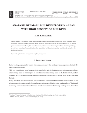 46 K.M. KACZOREK receives feedback confirming sense of his elaboration of procedure that improves management of relatively small construction site. In this manner is achieved aim, which is to say that the issue of the management of small construction sites increasingly gaining in importance and requires the involvement of an increase of conducting scientific research on this issue. It is worth noting that in the world this trend has already begun and it is worth to join it. Evidenced by the even positions [2,4,6,7,10,11]. 2. CAUSES OF SMALL CONSTRUCTION SITES Small construction sites and connected with them small or insignificant storage areas result from two concurrent reasons: small size of the construction site and lack of storage facilities on neighboring sites. At this time, there are more and more this type of areas under construction which results from mentioned below facts: - Using of many buildings with terminated or almost terminated period of utilization. What is more, their poor technical conditions are a real danger for users of these buildings. Demolished or dismantled buildings generally are located in densely built-up areas and this fact limits the possibility of storage on nearby plots – there is only the plot where the building is demolished. - Prices of attractive located plots (usually located near the city center) reach extremely high levels in big cities. For this reason, demolition of existing construction and replacement it by a new one is economically justified. In this case, the problem with storage of materials on neighboring plots occurs frequently. 2.1. COMPARATIVE SUMMARY OF PRICES OF BUILDING PLOTS IN 2009TH AND 2014TH IN BIG CITIES The main reason for recovery of building plots, where buildings are demolished, is an ever-increasing price of plots. [5] In order to confirm these trends in recent years, author compared average prices of plots in five main Polish urban centers: Warsaw, Krakow, Wroclaw, Gdansk and Poznan. Results are shown in Table 1. ANALYSIS OF SMALL BUILDING PLOTS IN AREAS WITH HIGH DENSITY... 47 Table 1. Comparative summary of prices of building plots in 2009th and 2014th in big cities [Source: Own elaboration based on Szybko.pl and Expander Report for 2009tth and the development of the portal Bankier.pl for 2014th[12,13,18]] Price [in zloty] per one square meter of building plot after third quarter of 2014th year 798 The difference in the price [in zloty] The percentage difference Warsaw Price [in zloty] per one square meter of building plot after third quarter of 2009th year 830 -32 -3,86 Krakow 340 463 +123 36,18 Wroclaw 280 415 +135 48,21 Gdansk 280 491 +211 75,36 Poznan 400 383 -17 -4,25 City The first conclusion is obvious – prices of square meter of building plot increases permanently. The above-shown table shows that there are tens of percent of difference. Poznan and Warsaw are characterized by a deviation from trends because of fall in prices of square meter. It comes from two essential factors: - Prices of building plots have already reached relatively high level - As a result of many investments, the most attractive plots have already been in use. In the majority there are not very attractive plots and that caused lower prices. PhD Piotr Rosik writes about correlation between plot’s location nearby the center of Warsaw and high price of the plot in his publication “ Land properties in the Mazowieckie voivodeship”. [9] According to PhD Henryk Gawrion in his article “The influence of physical characteristics of plot on building plots prices within urban agglomeration (example of Poznan agglomeration), location is the main factor that creates a value of plot. [3] In conclusion, attractively located plots in big cities are more and more difficult to reach that generates the need for demolition of old buildings and replace them by new construction. The whole construction is built on a small plot surrounded by utilized and built-up plots. 48 K.M. KACZOREK 2.2. PLOTS ARISEN FROM DEMOLITION OF BUILDINGS IN POOR TECHNICAL CONDITIONS Currently, there are more and more utilized buildings are characterized by technical conditions that qualify them for demolition or dismantling. There are usually buildings from the early post-war period. They have not always been built with focus on the highest technical parameters of buildings which translates into their durability. If the buildings are not strengthened, dismantled or demolished, it can be a cause of construction disaster. General Office of Building’ Report 17th March 2014 concerning construction disasters shows the scale of this phenomenon in 2013. Results regarding construction disasters connected with utilized buildings, are shown below in graphical form. Fig. 1. Graph showing the structure of disasters according to the time of their occurrence [own elaboration based on [8]] ANALYSIS OF SMALL BUILDING PLOTS IN AREAS WITH HIGH DENSITY... 49 Fig. 2. Graph showing structure of building disaster according to the criterion of time of building exploitation [own elaboration based on o [8]] Taking into account the above graphs, we can draw following conclusions: - the vast majority (82,17%) of construction disasters concerns utilized buildings. Disasters result from poor technical conditions of buildings which are caused in turn inappropriate or prolonged usage. - slightly more than half (50,58%) of construction disasters concerning buildings which had been in use over 50 years. It means that buildings, which had been constructed in the fifties and in the sixties of the last century, are characterised by technical conditions that qualify them for significant strengthening or dismantling. If we have the second option, the most frequently released building plots are surrounded by high-density housing. The report contains information connected with executed regulations of building demolition in 19952003. From the perspective of this article, statement concerning the causes of regulati