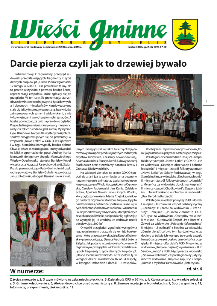 Dwumiesięcznik rozdawany bezpłatnie nr 2 (59) marzec 2015 r. nakład 3000 egz. ISNN 1895-07-60 Darcie pierza czyli jak to drzewiej bywało Jubileuszowy X regionalny przegląd widowisk przedstawiających fragmenty z życia dawnych Kurpiów pt. ,,Darcie Pierza’’ zgromadził 12 lutego w GOK-O Lelis prawdziwe tłumy, ale to przede wszystkim z powodu bardzo licznej reprezentacji zespołów, które zgłosiły się do przeglądu. W ten sposób prezentacja starych obyczajów i scenek rodzajowych z życia dawnych, a i obecnych mieszkańców Kurpiowszczyzny stała się jakby imprezą wewnętrzną, bez widzów zainteresowanych samymi widowiskami, a nie tylko występami swoich znajomych i sąsiadów. A trzeba powiedzieć, że było naprawdę co oglądać. Przyjechali najznamienitsi kurpiowscy muzykanci i artyści z takich ośrodków, jak Czarnia, Myszyniec, Łyse, Baranowo. Na tym tle występy naszych zespołów przygotowujących się do prezentacji w zespołach ,,Nowe Latko’’ w GOK-O, w Dąbrówce i w Łęgu Starościńskim wypadły bardzo dobrze. Chwalili ich za to ważni goście, którzy odwiedzili to leliskie zgromadzenie: poseł Andrzej Kania, kierownik delegatury Urzędu Mazowieckiego Wiesław Opęchowski, starosta Stanisław Kubeł, wicestarosta Krzysztof Parzychowski, wójt Stefan Prusik, przewodniczący Rady Gminy Jan Mrozek, radny powiatowy Stanisław Subda i ks. proboszcz Janusz Kotowski, etnograf Bernard Kielak i wielu W numerze: 1 innych. Przegląd stał się także świetną okazją do rozmowy i zakupów produkcji naszych rodzimych artystów ludowych, Czesławy Lewandowskiej, Adama Muracha z Płoszyc, lutnik ludowy Andrzej Staśkiewicz oraz pszczelarzy państwa Teresy i Czesława Niedźwiedzkich. Na widowni, ale także na scenie GOK-O spotkali się znani już w całym kraju, a na pewno w naszym regionie animatorzy życia kulturalnego Kurpiowszczyzny Witold Kuczyński, Anna Ogniewska, Czesław Faderewski, Jan Kania, Zdzisław Ścibek, Apolonia Nowak i wielu innych. W roku, który ogłoszono rokiem Adama Chętnika, wielkiego badacza obyczajów i folkloru Kurpiów, były to bardzo ważne i potrzebne spotkania. Jakże się w tych okolicznościach dziwić wielkiemu wzruszeniu Pauliny Piórkowskiej w Myszyńca, której koledzy z zespołu uczynili wielką niespodziankę ogłaszając po występie jej 18 urodziny, co widzowie uczcili odśpiewując ,,100 lat’’. O wyniki przeglądu i zgodność występów z jego regulaminem troszczyła się komisja konkursowa , która pracowała w składzie: Renata Krajewska – przewodniczący, Danuta Prachniak i Bożena Załęska. Jak podano w protokole końcowym w X regionalnym przeglądzie widowisk przedstawiających fragmenty z życia dawnych Kurpiów pt. „Darcie Pierza” uczestniczyło 12 zespołów, tj. w kategorii: dzieci i młodzież do 16 lat - 4 zespoły, w kategorii młodzież / dorośli - 8 zespołów. Po obejrzeniu zaprezentowanych widowisk, Komisja postanowiła przyznać następujące miejsca: W kategorii dzieci i młodzież: I miejsce - zespół folklorystycznych ,,Nowe Latko’’ z GOK-O Lelis za widowisko ,,Dziecięce obserwacje i babcine łopozieści’’ I miejsce - zespół folklorystycznych ,,Nowe Latko’’ ze Szkoły Podstawowej w Łęgu Starościńskim za widowisko ,,Zioskowe zebranie’’, II miejsce - zespół folklorystycznych ,,Kurpiaki’’ z Myszyńca za widowisko ..Uroki na Kurpiach’’, III miejsce - zespół ,,Chudkowiaki’’ z Zespółu Szkół im. J. Twardowskiego w Chudku za widowisko ,,Król Herod na Kurpiach’’. W kategorii młodzież powyżej 16 lat i dorośli: I miejsce - Kurpiowski Zespół Folklorystyczny ,,Carniacy’’ z Czarni za widowisko ,,Przenosiny’’, I miejsce - ,,Puszcza Zielona’’ z GOKSiR Łyse za widowisko ,,Oczepiny weselne’’, II miejsce - Kurpiowski Zespół ,,Pod Borem’’ z Zawad za widowisko ,,Psiecenie fafernuchów’’, II miejsce - ,,Serafiniaki’’ z Serafina za widowisko ,,Darcie pierza’’, co było tym bardziej ważne, że dopiero w trakcie ich występu po scenie zaczęło fruwać darte pierze i postało tam do końca przeglądu. III miejsce - ,,Kurpiaki’’ z RCKK Myszyniec za widowisko ,,Kurpiów bajanie’’, wyróżnienia: - Klub Seniora ,,Wrzos’’ z RCKK Myszyniec za widowisko ,,Zioskowe zebranie’’, Zespół Regionalny ,,Myszyniec’’ za widowisko ,,Krojenie kapusty’’ i Zespół ,,Kurpśe z Myśańca’’ za widowisko ,,Potarcysko’’. cd. str. 6 Z życia samorządu s. 2; O czym mówiono na zebraniach sołeckich s. 3; Działalność OPS w 2014 r. s. 4; Kto na sołtysa, kto w radzie sołeckiej s. 5; Gminne kolędowanie s. 6; Aleksandrowo chce pisać nową historię s. 8; Zimowe recytacje w bibliotekach s. 9; Sport w gminie s. 11; Informacje, przypomnienia, ciekawostki s. 12. Z życia samorządu 2 Poprzedzona pracowitymi posiedzeniami stałych komisji III sesja Rady Gminy Lelis, która odbyła się 27 lutego w sali konferencyjnej Urzędu Gminy przebiegała bardzo sprawnie i szybko. Na sesję przybył serdecznie witany radny powiatowy Stanisław Subda oraz kierownik OPS Danuta Piersa i dyr. ZASiP Andrzej Przeradzki. W sesji uczestniczyli sołtysi ze wszystkich 22 sołectw, a wśród nich czterech nowych, wybranych na obecną kadencję. Są to sołtysi wsi: Białobiel – Jerzy Tercjak, Łodziska – Anna Domalewska, Łęg Starościński – Walery – Grzegorz Czeleń i Siemnocha – Łukasz Budniak. (zob.: fot. na str. 5) Po zatwierdzeniu porządku obrad i protokołu z poprzedniej sesji, wójt gminy Stefan Prusik przedstawił informację ze swej działalności przed sesją. W informacji podkreślono pozytywny stan realizacji programów dotyczących rozwoju sieci przedszkoli z dofinansowaniem 736 tys. zł, zakup 145 książek do biblioteki gminnej, a także budowy sieci łączy internetowych z programu mazowieckiego. W ramach tego programu w gminie Lelis ułożono 21 km światłowodów, które, po ewentualnej decyzji marszałka m